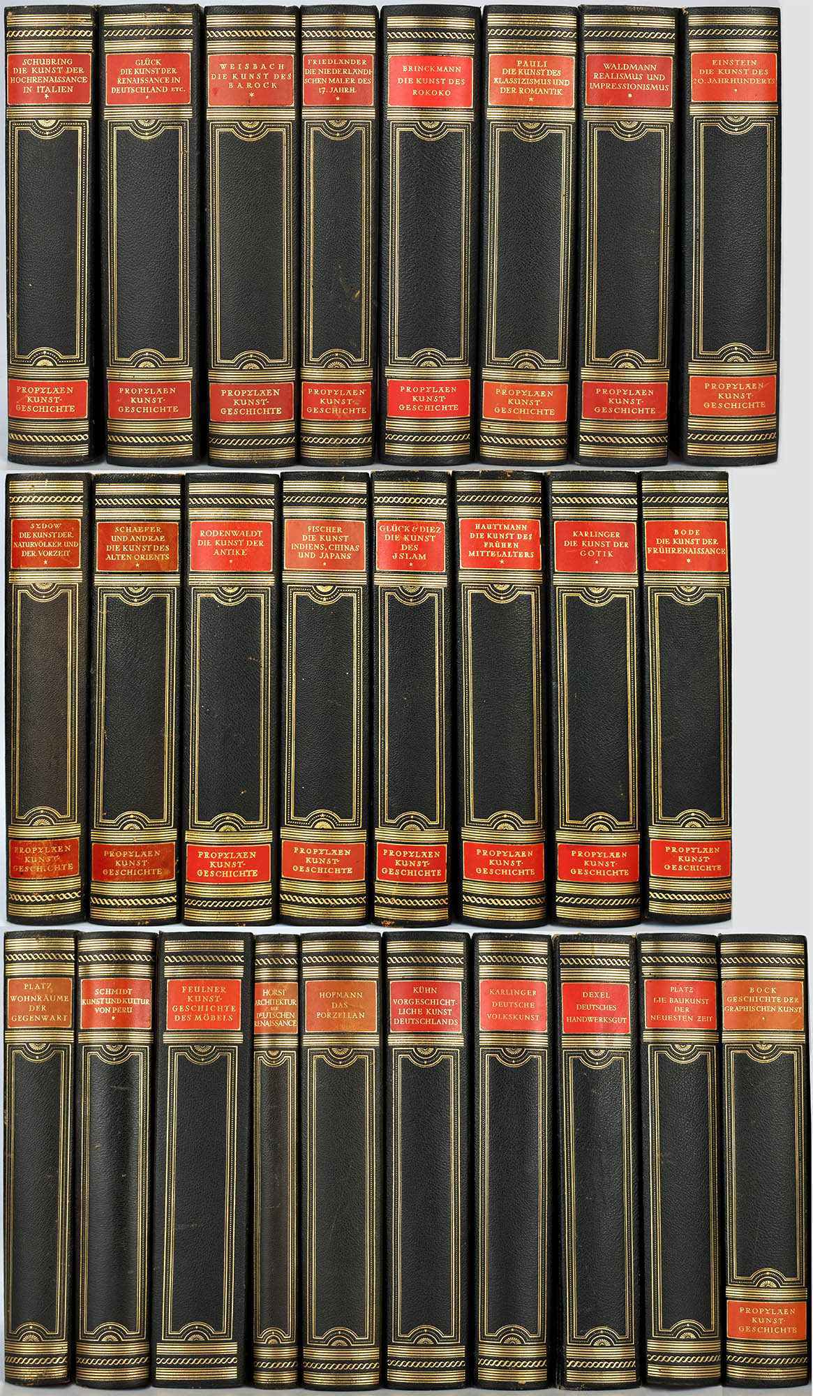 Sydow, Eckart von; Rodenwaldt, Gerhart; Fischer, Otto; Pauli, Gustav; Einstein, Carl; Platz, Adolf; Dexel, Walter: Die Propyläen-Kunstgeschichte. 16 Bände und 10 Ergänzungsbände. (26 Bände, komplett). Berlin, Propyläen-Verlag, 1925-1933. 4°. 27 x 19,4 cm. Je Band ca. 550-750 Seiten. Schwarzer Halblederbände mit zwei roten Titelschildern (ab 2. Ergänzungsband jeweils ein rotes Titelschild). Goldgeprägter Rückentext und Ornamentik.