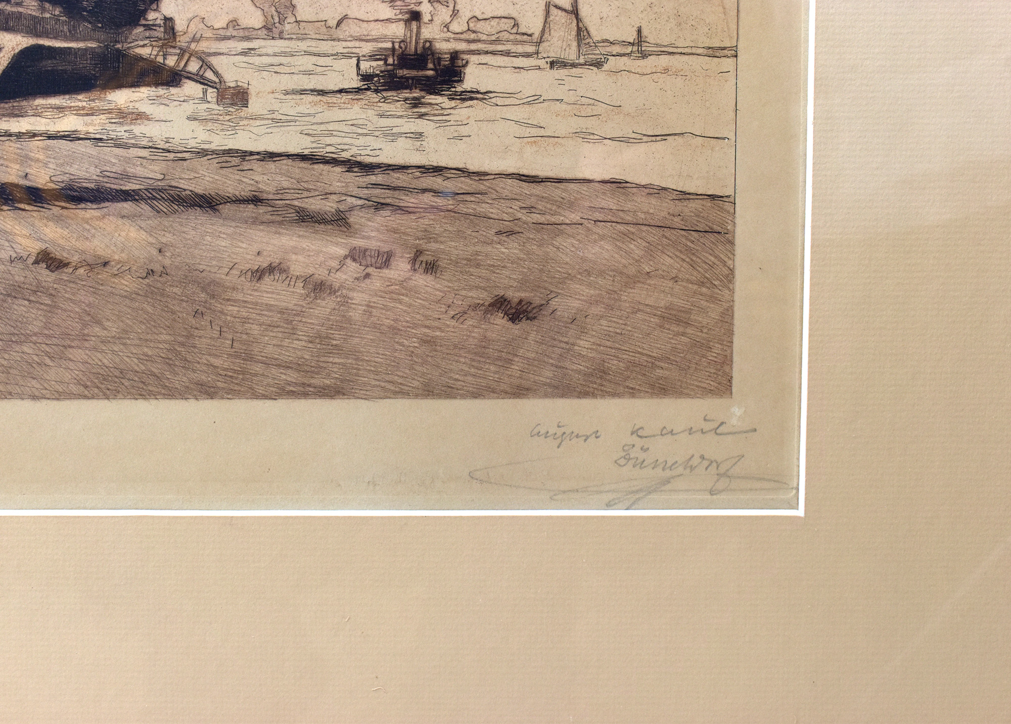 Original etching on chamois-colored laid paper. Signed in pencil below the image by August Kaul (August Kaul Düsseldorf). Professionally framed by a gallery behind glass/passe-partout in a gilt wooden frame. Not yet removed from the frame. Image dimensions: 35.0 x 55.0 cm. Frame dimensions: 62.5 x 82.0 cm. Very good condition.