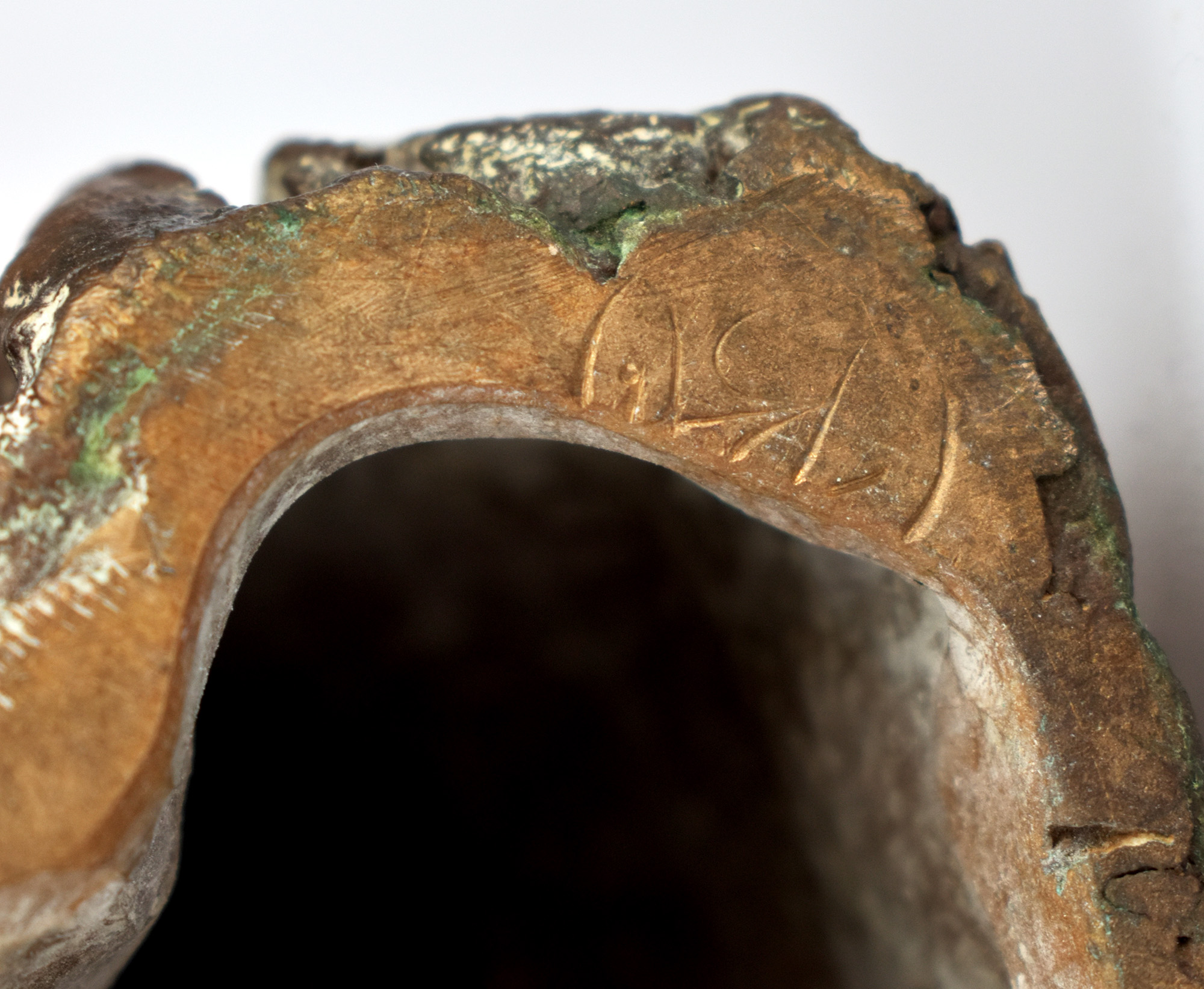 Bronzeskulptur mit dunkler Patina. Am Fuß im Guß Monogramm „BA“. Maße: 15 x 10 x 12 cm. Gewicht: 2,10 kg. Sehr guter Zustand.