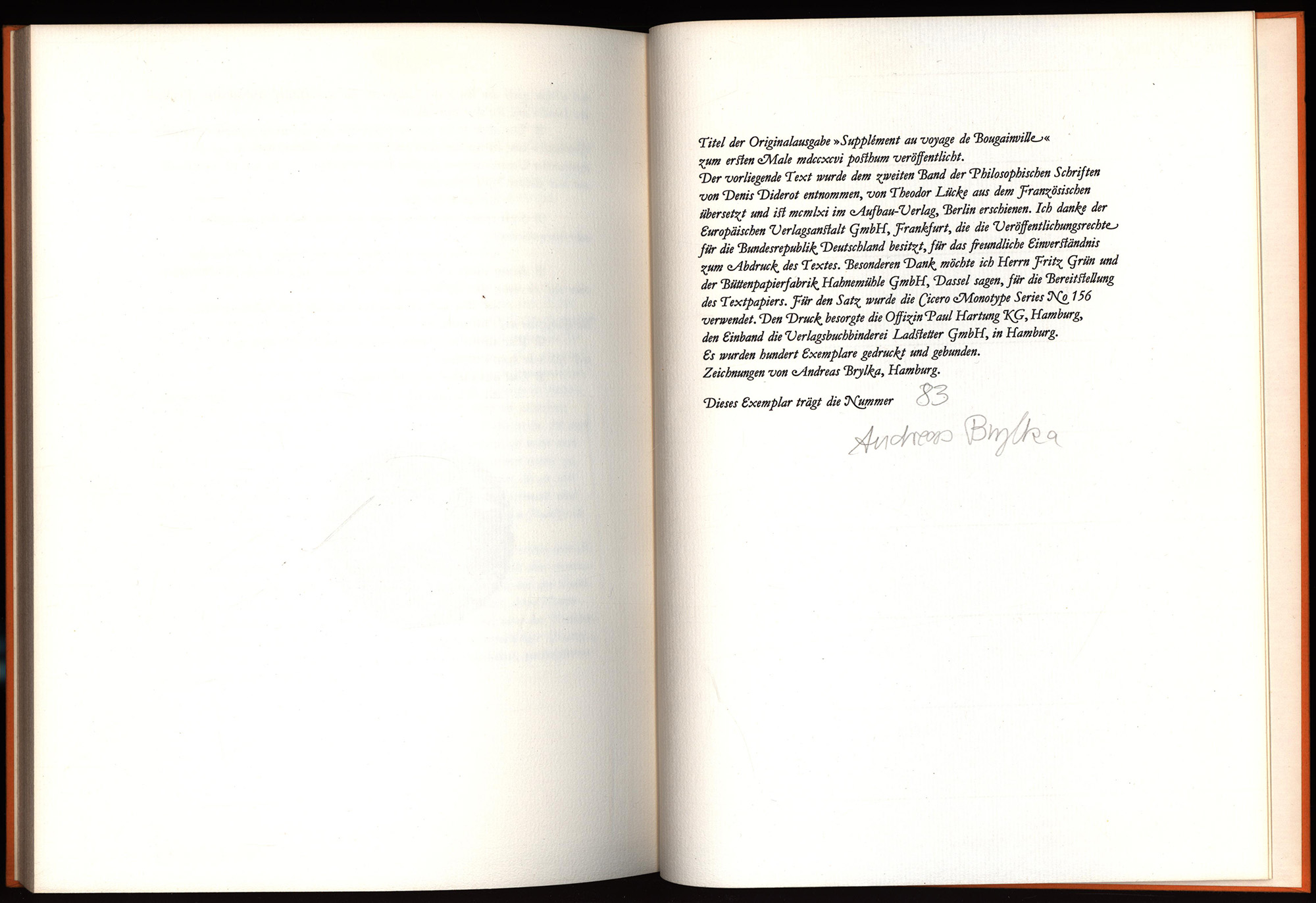 Diderot, Denis; Brylka, Andreas [Ill.]: Nachtrag zu „Bougainvilles Reise“. Oder Gespräch zwischen A. & B. über die Unsitte, moralische Ideen an gewisse physische Handlungen zu knüpfen, zu denen sie nicht passen. [Signiertes und nummeriertes Exemplar]. Dassel, Hahnemühle, 1974. 4°. 26 x 19 cm. 71 Seiten. Gebundener Original-Pappband.
