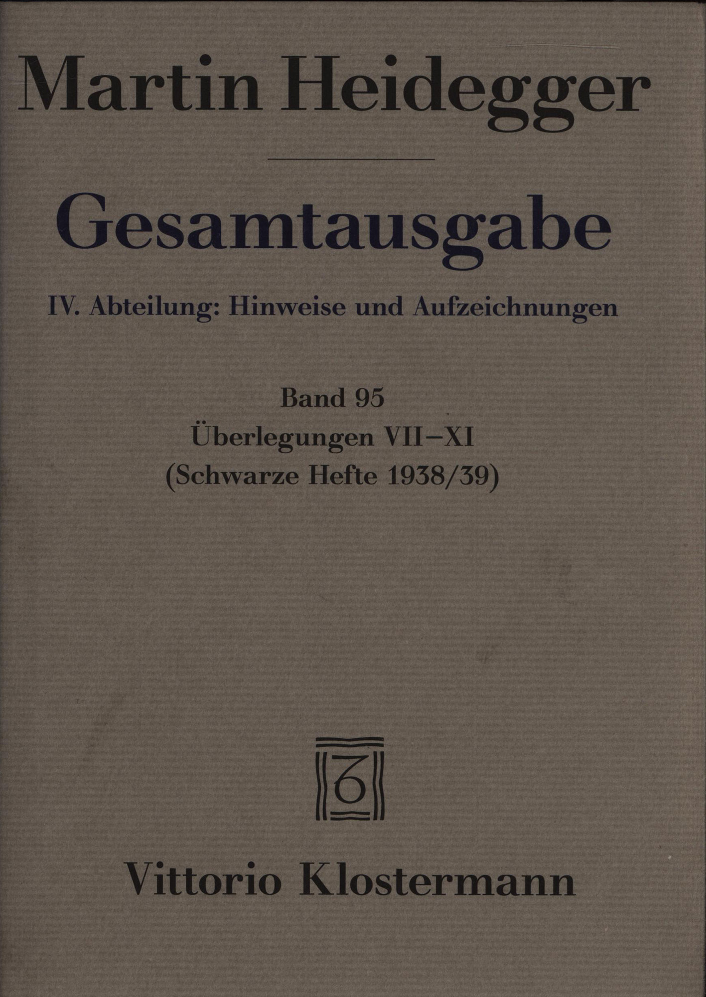 Heidegger, Martin; Trawny, Peter [Hrsg.]: Überlegungen VII – XI. (Schwarze Hefte 1938/39). Frankfurt am Main, Klostermann, 2014. 8°. 21 x 15 cm. 455 Seiten. Original-Leinenband mit Original-Schutzumschlag mit grauem Kopfschnitt. (= Martin Heidegger, Gesamtausgabe: IV. Abteilung: Hinweise und Aufzeichnungen. Band 95).