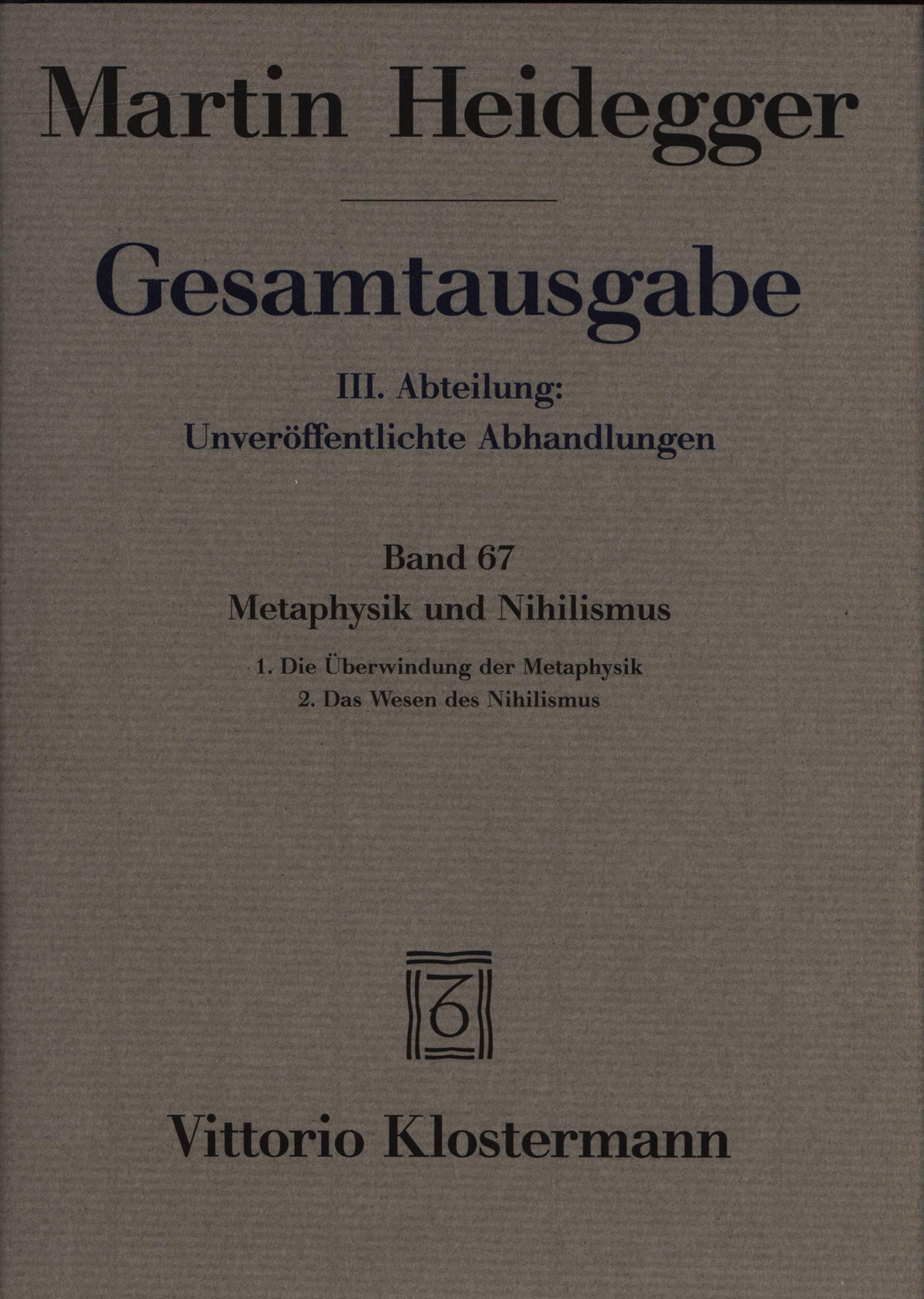 Heidegger, Martin; Friedrich, Hans-Joachim [Hrsg.]: Metaphysik und Nihilismus. 1. Die Überwindung der Metaphysik, 2. Das Wesen des Nihilismus. Frankfurt am Main, Vittorio Klostermann, 1999. 8°. 21 x 15 cm. XII, 273 Seiten. Original-Leinenband mit Original-Schutzumschlag und grauem Kopfschnitt. (= Martin Heidegger, Gesamtausgabe. III. Abteilung: Unveröffentlichte Abhandlungen, Vorträge, Gedachtes. Band 67).