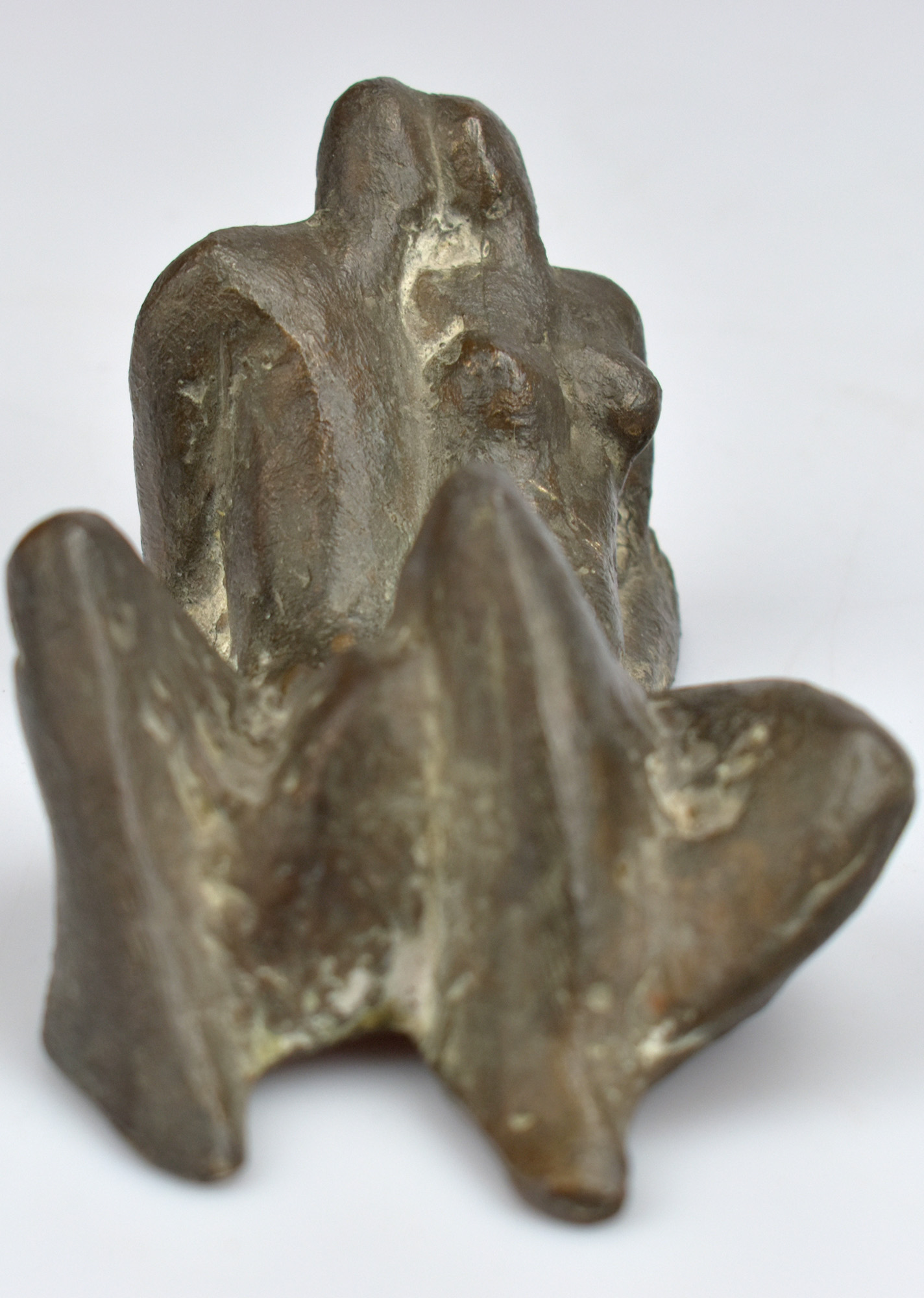 Bronzeplastik mit dunkler Patina. Bronze auf Unterseite mit eingeschlagenem Monogramm „GS“. Maße: 7 x 14,5 x 9 cm. Gewicht: 881 g. Sehr guter Zustand.
