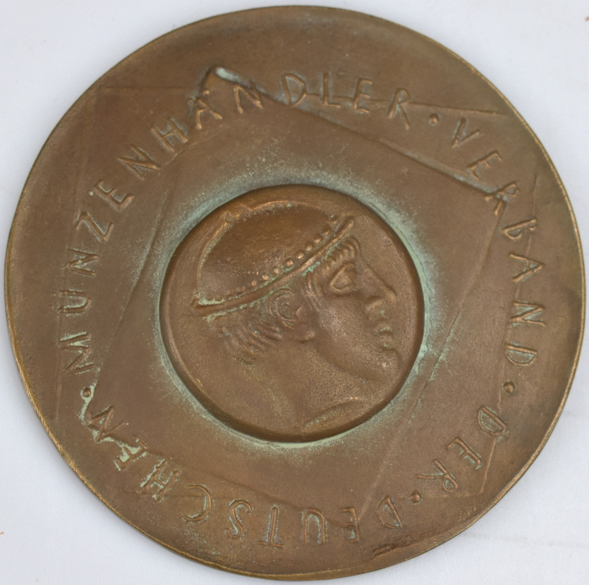 Bronzerelief mit heller Patina, vorderseitig neben dem Porträt von „Hermes“ unter einer Lupe, Jahreszahlen „1952-2002“, monogrammmiert „HKB“, rückseitig Porträt Römerkopf und Aufschrift „Verband der deutschen Münzenhändler“. Maße: Durchmesser 8,5 cm. Gewicht: 173g. Sehr guter Zustand.
