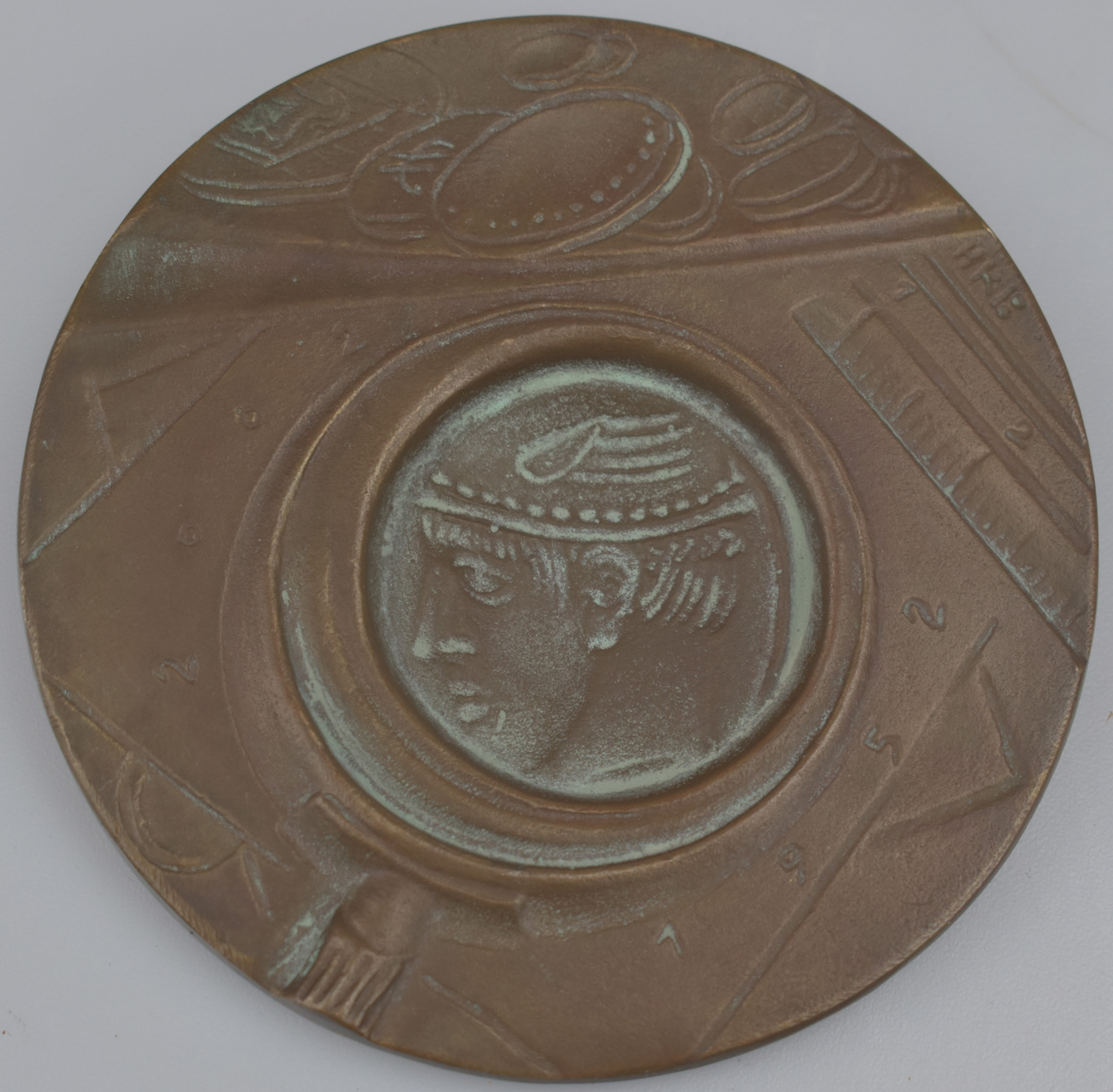 Bronze relief with a light patina, featuring a portrait of „Hermes“ under a magnifying glass on the front, the dates „1952-2002“, monogrammed „HKB“, and a portrait of a Roman head and the inscription „Verband der deutschen Münzenhändler“ (Association of German Coin Dealers) on the reverse. Dimensions: Diameter 8.5 cm. Weight: 173 g. Very good condition.