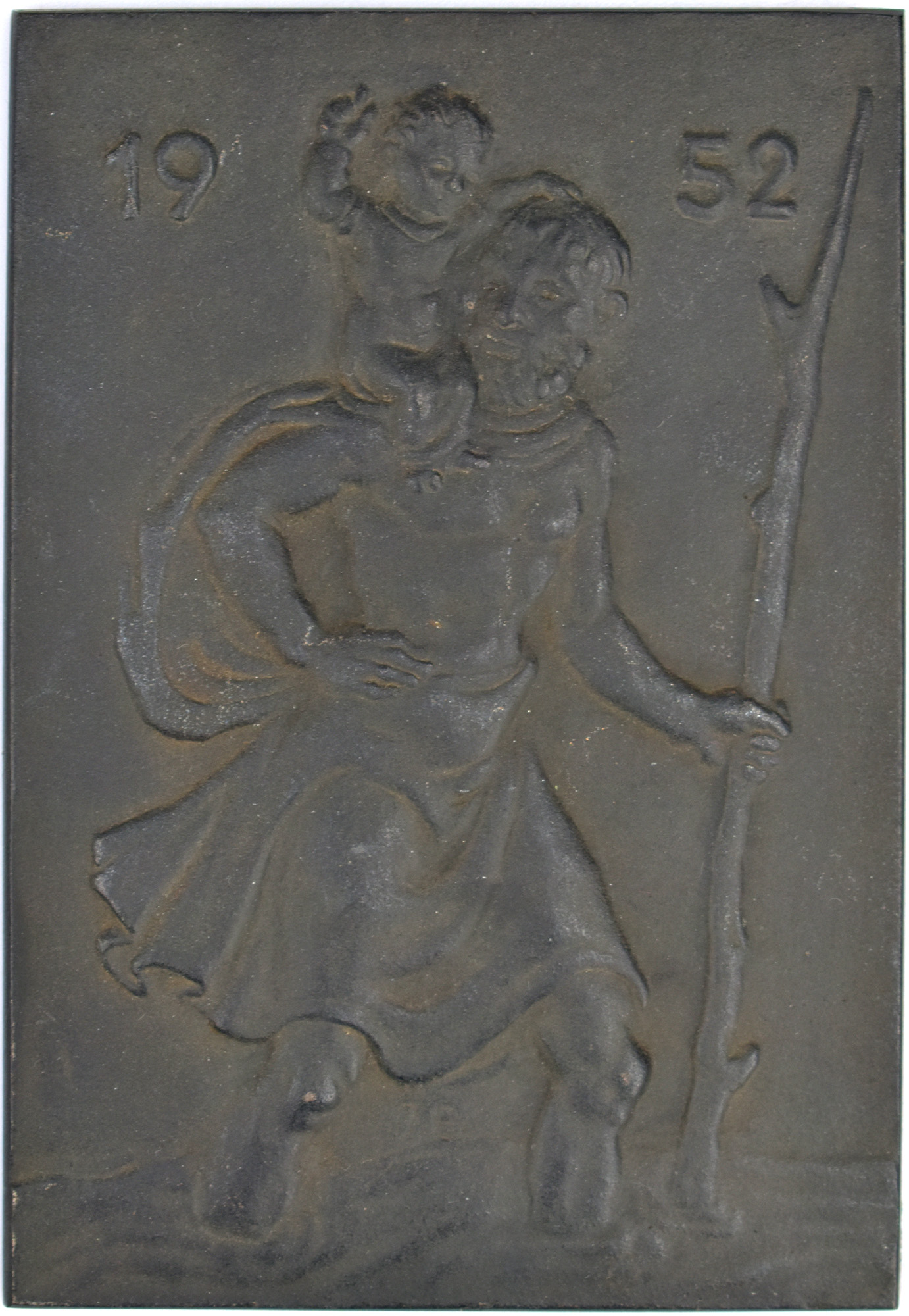 Enseling, Joseph: Christophorus. [1952]. [Eisenrelief / Iron relief]. (Joseph Bernhard Hubert Enseling, geboren am 28. November 1886 in Coesfeld, gestorben am 16. Juli 1957 in Düsseldorf. Deutscher Bildhauer und Hochschullehrer. Studium nach einer Bildhauerlehre von 1905 bis 1910 bei Rudolf Bosselt, Peter Behrens und Wilhelm Kreis an der Kunstgewerbeschule Düsseldorf, von 1910 bis 1912 an der Académie Colarossi in Paris bei Aristide Maillol. Ab 1922 Lehrtätigkeit an der späteren Folkwangschule in Essen und von 1938 bis 1952 als Professor an der Kunstakademie Düsseldorf, Schüler unter anderem Joseph Beuys und Hermann Blumenthal).