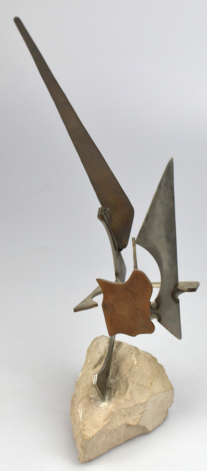 Steel sculpture on a natural stone base. Inscribed, dated, and signed by Francis Beboux below the base. Dimensions: 31 x 14 x 10 cm, weight 708 g. Very good condition.