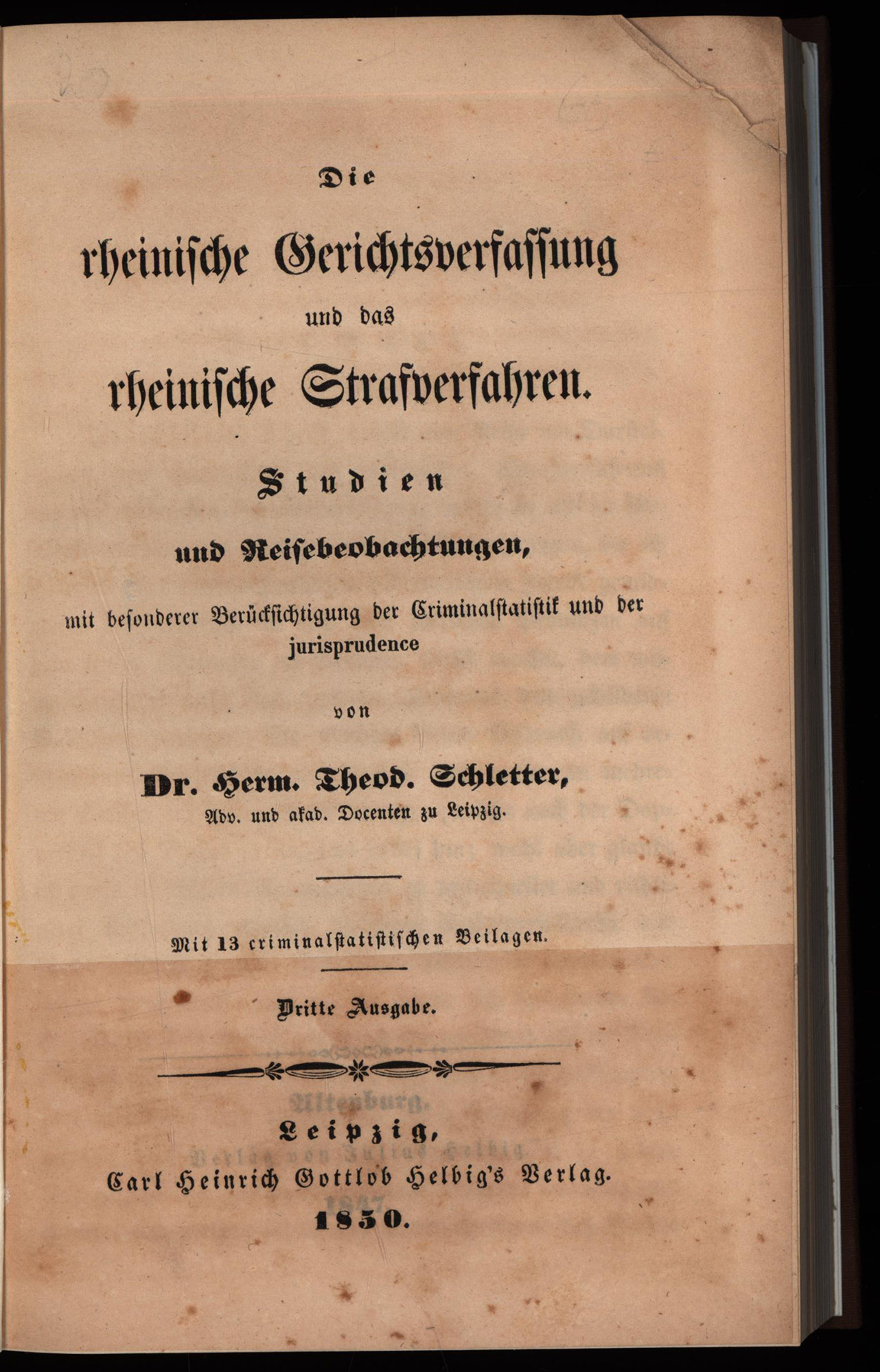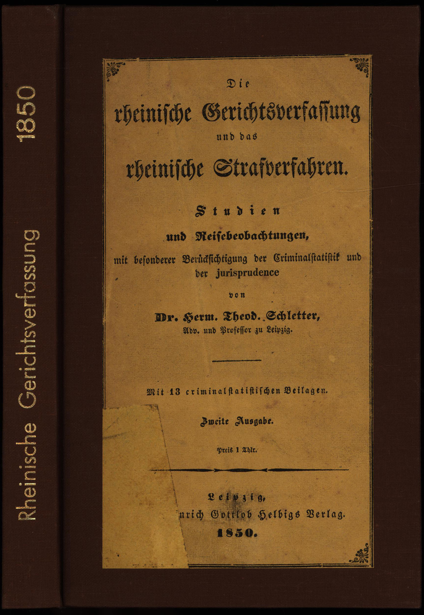 Schletter, Hermann Theodor: Die rheinische Gerichtsverfassung und das rheinische Strafverfahren. Studien und Reisebeobachtungen mit besonderer Berücksichtigung der Criminalstatistik und der jurisprudence. Mit 13 criminalstatistischen Beilagen. Altenburg, Helbig Verlag, 1850. 8°. 21 x 13,5 cm. VIII, 160, 149 Seiten. Neuerer Leinenband mit aufkaschierter Original-Broschur auf beiden Deckeln.