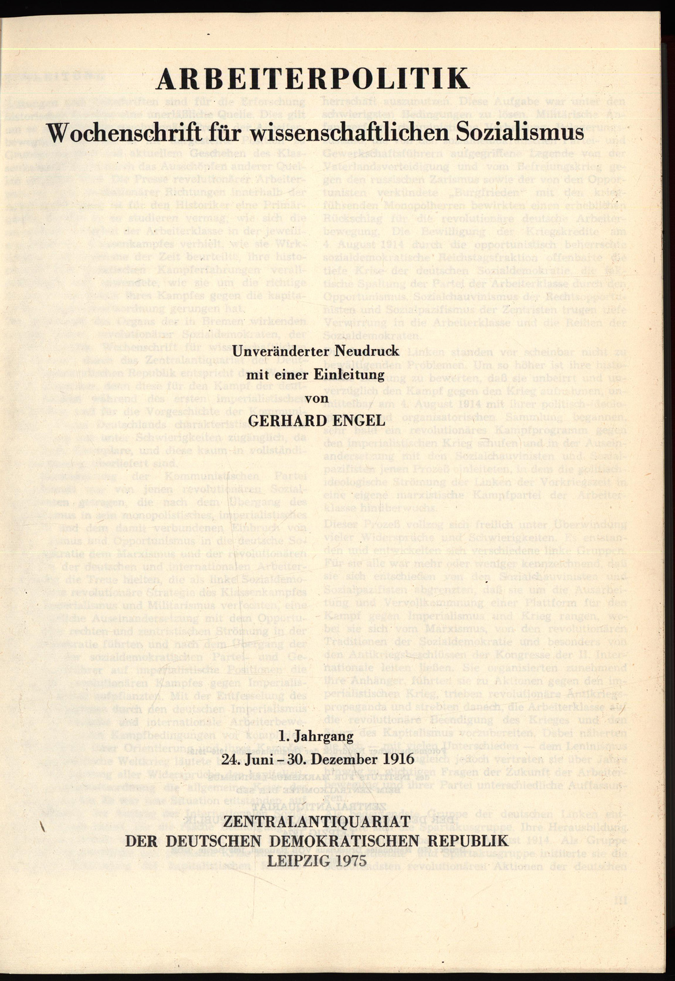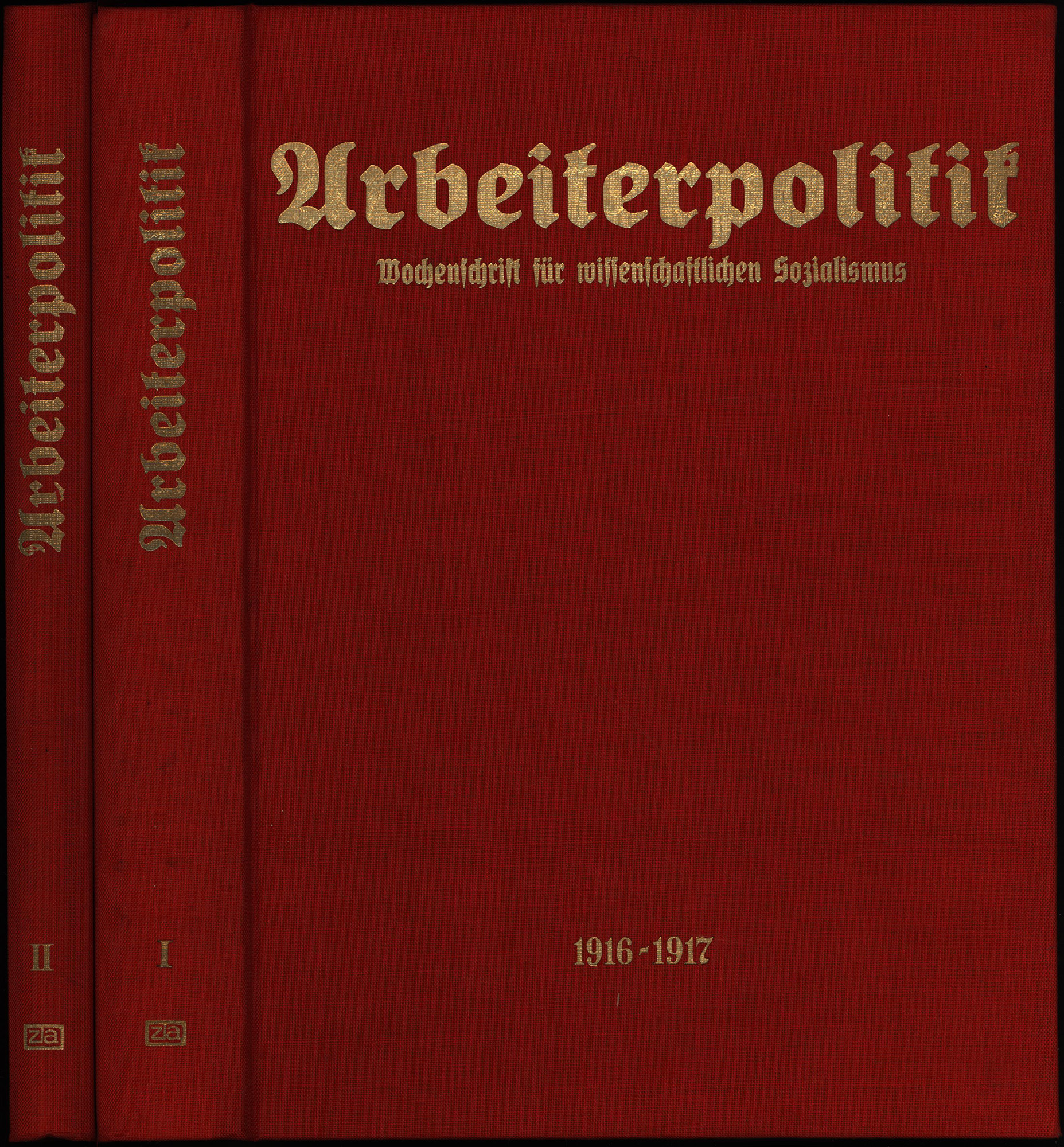 Arbeiterpolitik. Wochenschrift für wissenschaftlichen Sozialismus. Mit einer Einleitung von Gerhard Engel. 1.-4. Jahrgang (= alles Erschienene, in zwei Bänden). Leipzig, Verlag Zentralantiquariat der DDR, 1975. 4°. 28,5 x 21,5 cm. Insgesamt ca. 800 Seiten. Original-Leinenbände mit goldgeprägten Rücken- und Deckeltiteln.
