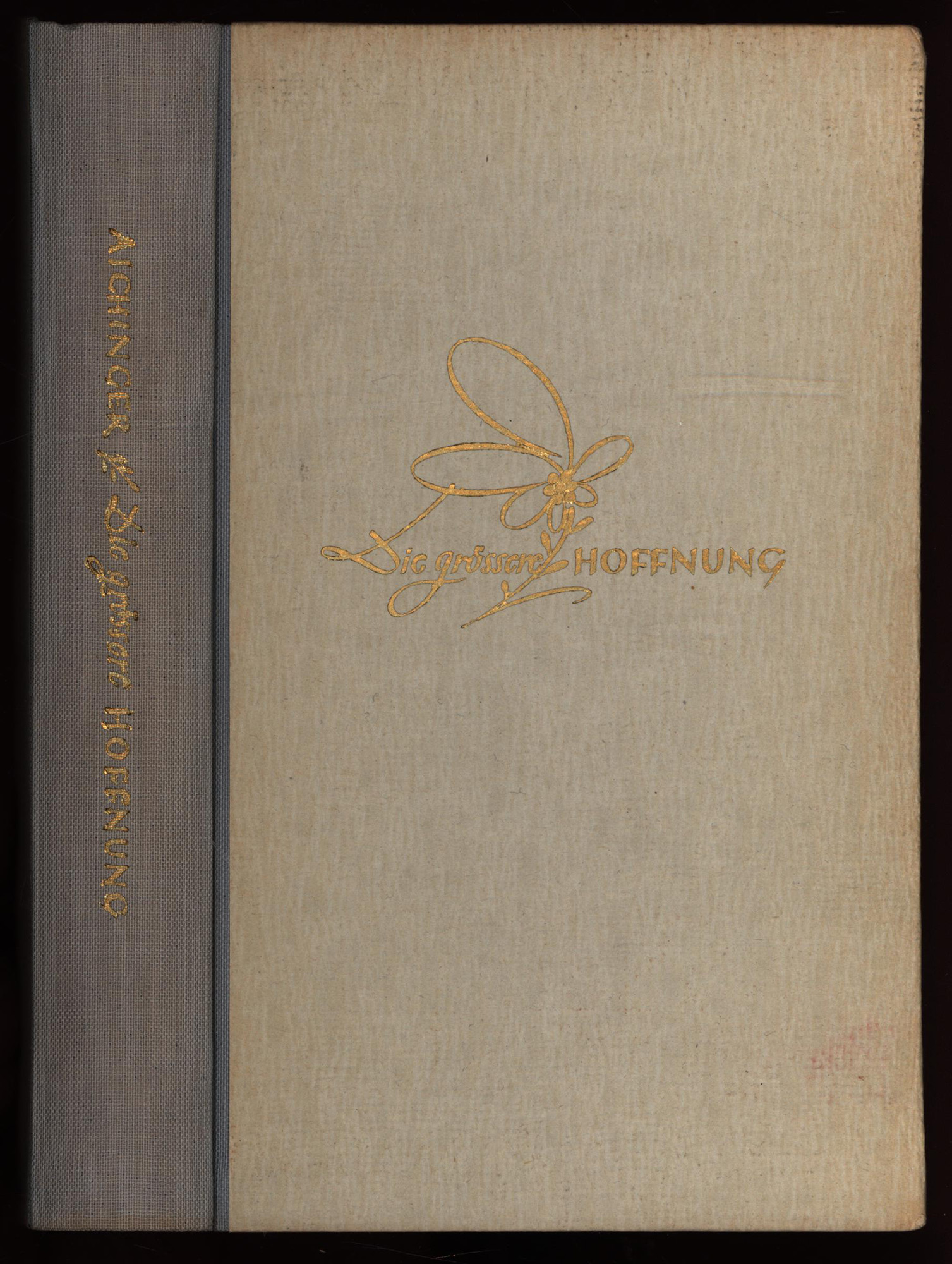 Aichinger, Ilse: Die grössere Hoffnung. Roman. [Erstauflage]. Amsterdam, Bermann-Fischer, 1948. 8°. 19,5 x 12 cm. 399 (1) Seiten. Original-Halbleinenband mit goldgeprägtem Deckel- und Rückentitel und grauem Kopfschnitt.