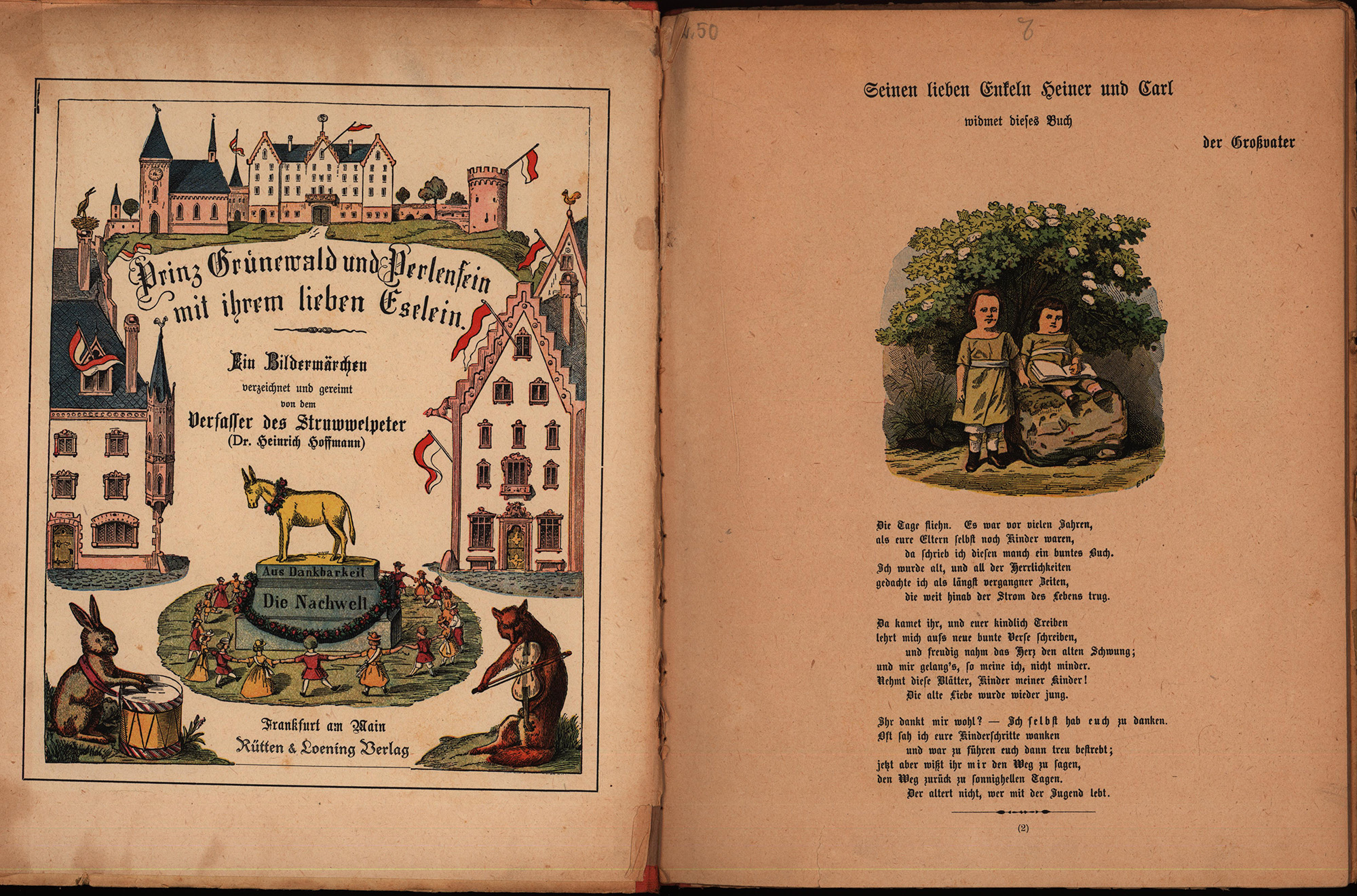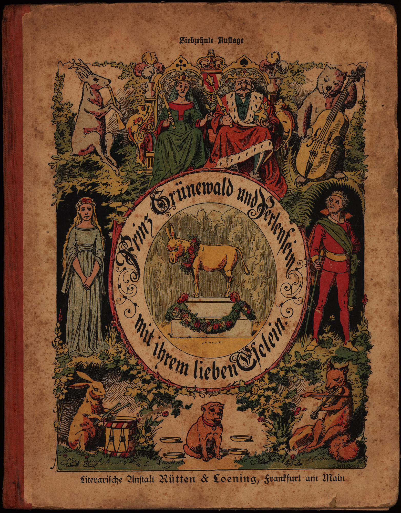 Prinz Grünewald und Perlenfein mit ihrem lieben Eselein. Ein Bildermärchen. Frankfurt am Main, Rütten & Loening Verlag, ca. 1925. 4°. 28 x 22 cm. 24 Blatt. Original-Halbleinenband mit Deckelillustration in Farbe.