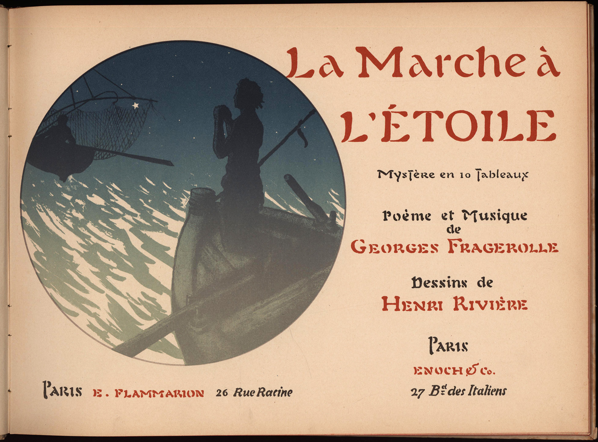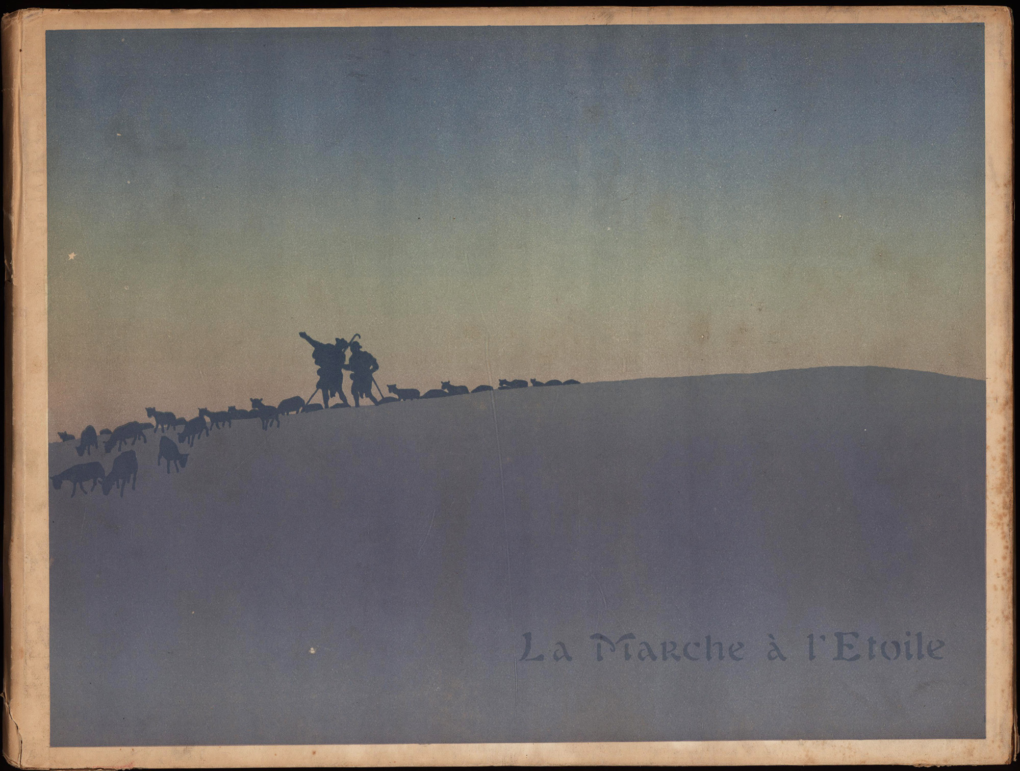 Fragerolle, Georges: La marche à l’étoile. Mystère en 10 tableaux. Paris, Flammarion, 1899. Quer-4°. 25 x 32,5 cm. 38 Seiten. Original-Pappband mit Deckelillustration in Farbe, illustrierten Vorsätzen und Rundum-Rotschnitt.