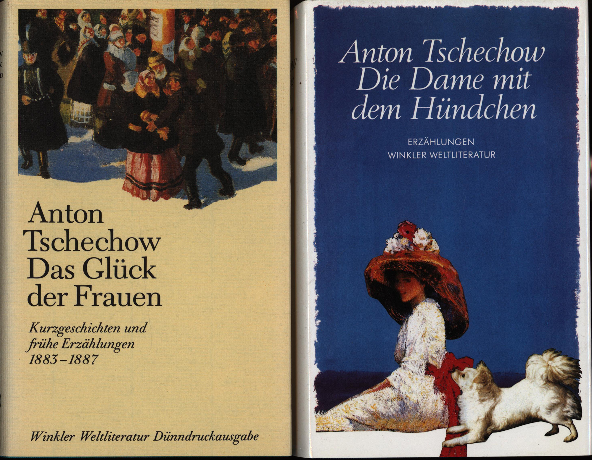 Tschechow, Anton: Konvolut aus 2 Bänden. Band 1: Das Glück der Frauen. Kurzgeschichten und frühe Erzählungen 1883 – 1887. Band 2: Die Dame mit dem Hündchen. Späte Erzählungen 1893-1903. 2 Bände. München, Winkler Verlag, 1977-1988. 8°. 19,5 x 12 cm. 844 Seiten, 3 Blatt, 807 Seiten, 3 Blatt. Original-Leinenbände mit Original-Schutzumschlägen. (Winkler-Dünndruck-Ausgabe).