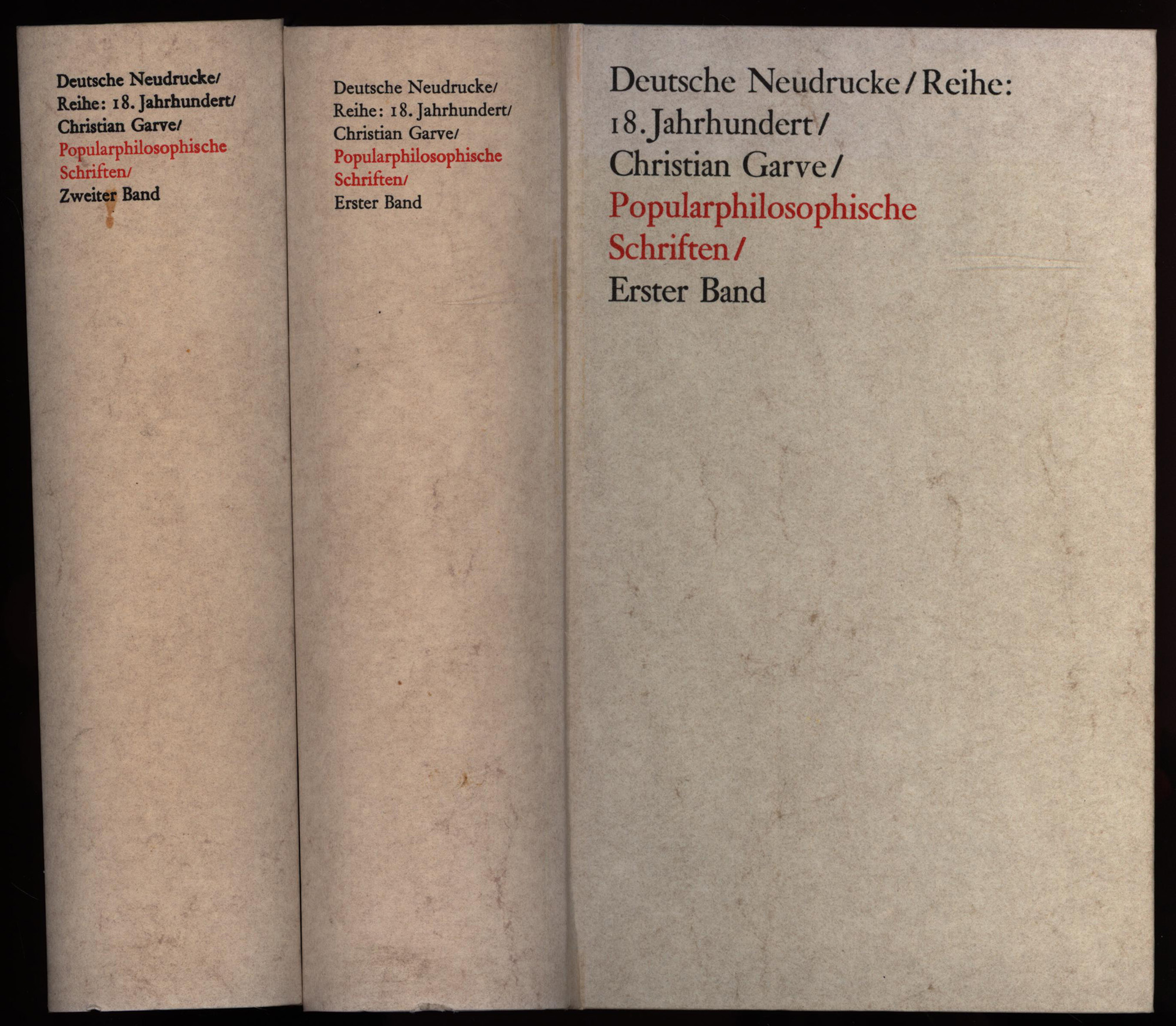 Garve, Christian: Popularphilosophische Schriften über literarische, ästetische und gesellschaftliche Gegenstände. Im Faksimiledruck herausgegeben von Kurt Wölfel. 2 Bände. Stuttgart, Metzler, 1974. 8°. 19,5 x 12,5 cm. 1306, 76 Seiten. Gebundener Original-Pappbände. (Deutsche Neudrucke. Reihe Texte des 18. Jahrhunderts).