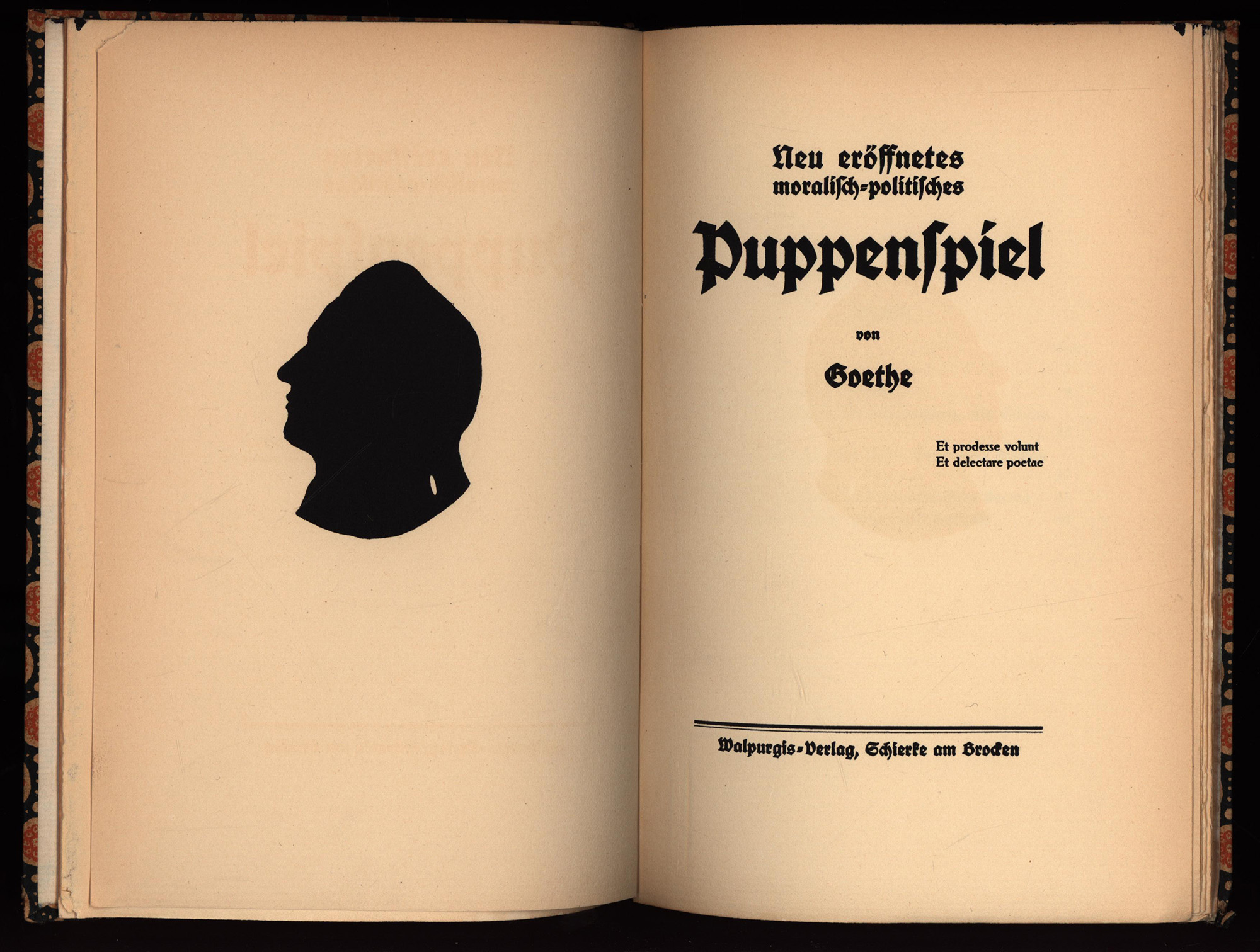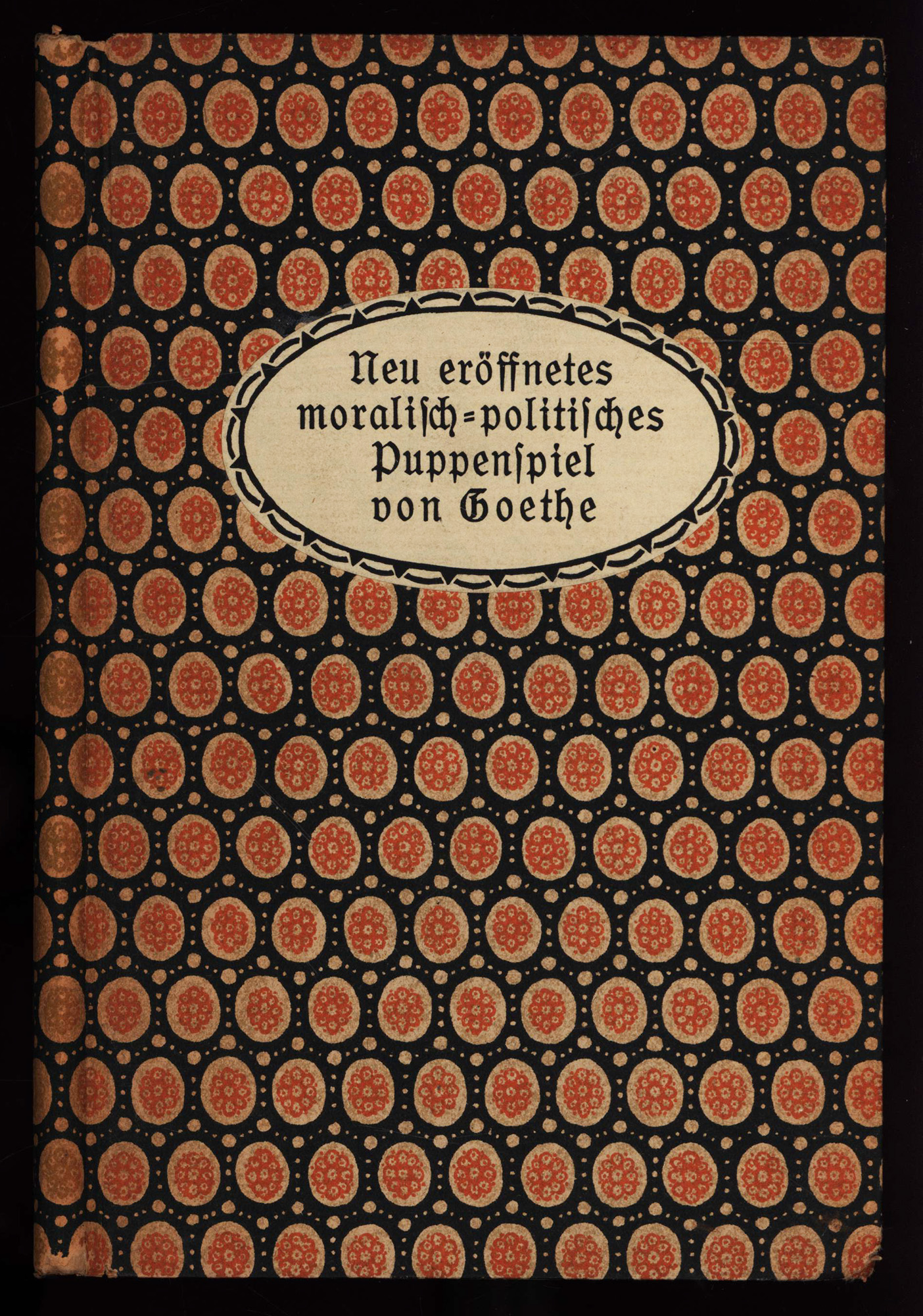 Goethe, Johann Wolfgang von: Neu eröffnetes moralisch-politisches Puppenspiel. Schierke a. Brocken, Walpurgis-Verlag, 1911. 8°. 22 x 14,5 cm. 52 Seiten. Original-Pappband mit Buntpapierbezug und schwarzem Kopfschnitt.