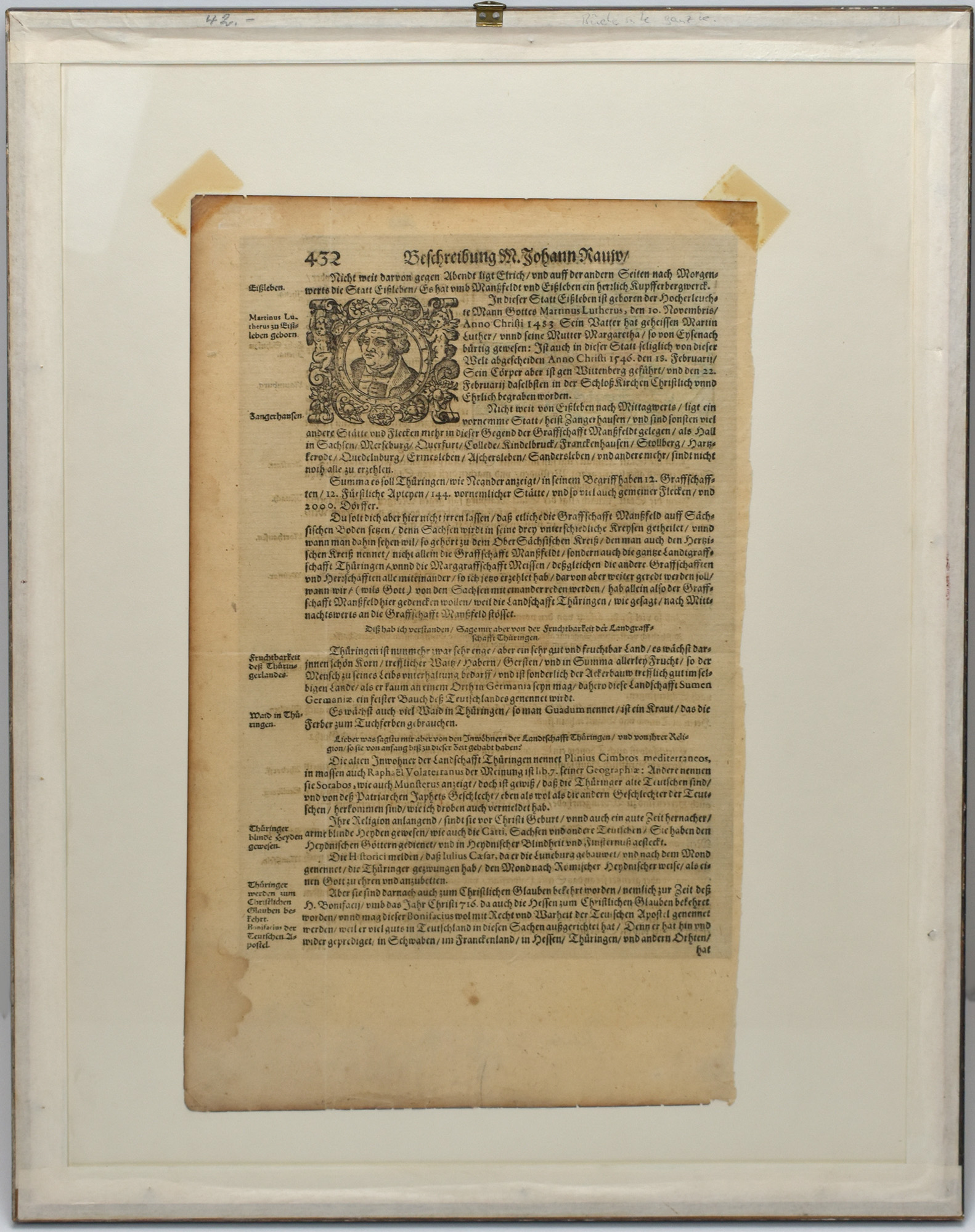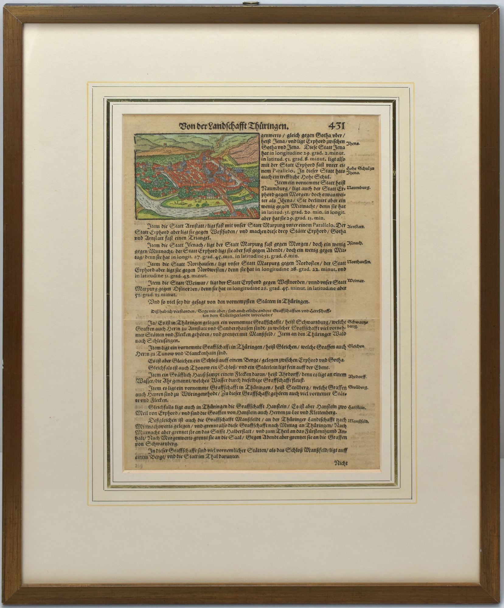 Original copper engraving from Johann Rauw’s Cosmographia of 1597. Plate from pages 431/432 „On the Land of Thuringia“ with a general view of the city of Jena, beautifully hand-colored, with an image of Martin Luther on the reverse. Professionally mounted in a gilt wooden frame behind glass/passe-partout, with a glass pane on the back. Not examined ouit of the frame. Sheet dimensions: 36.0 x 22.0 cm. Frame dimensions: 48.0 x 36.5 cm. The sheet shows slight signs of wear. Very good condition.