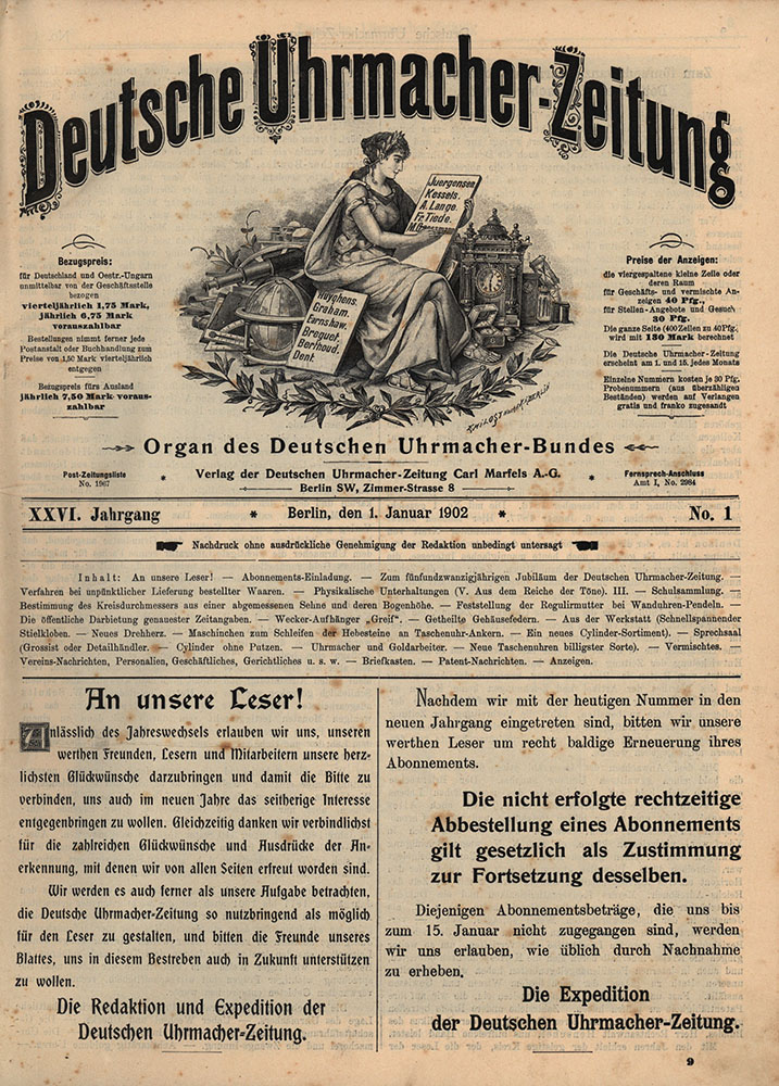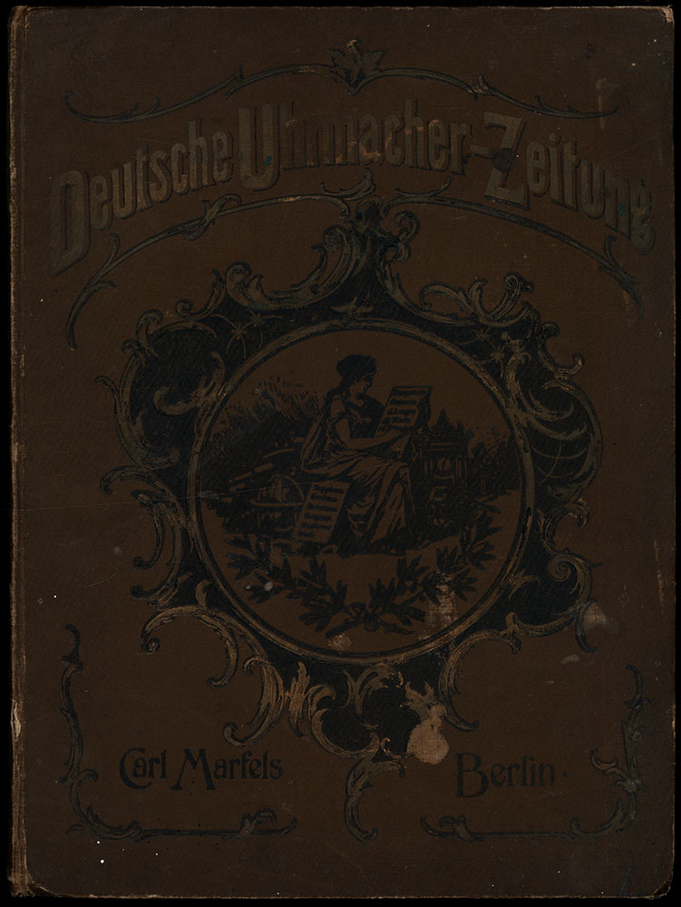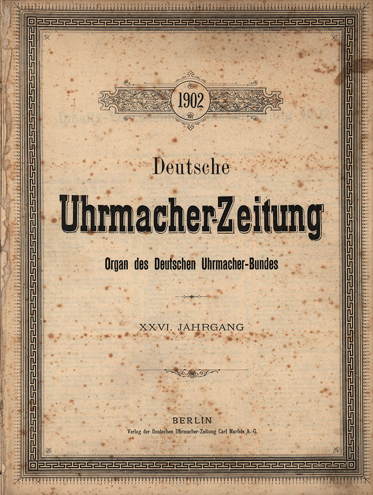 Deutsche Uhrmacher-Zeitung. XXVI. Jahrgang, 1902, Hefte 1-24. Organ des Deutschen Uhrmacher-Bundes. Berlin, Verlag der Deutschen Uhrmacher-Zeitung Carl Marfels A.-G., [1902]. 4°. 34 x 25,5 cm. Titelblatt, [3] Blätter Inhaltsverzeichnis, 392 Seiten. Original-Leinenband mit Deckelillustration.