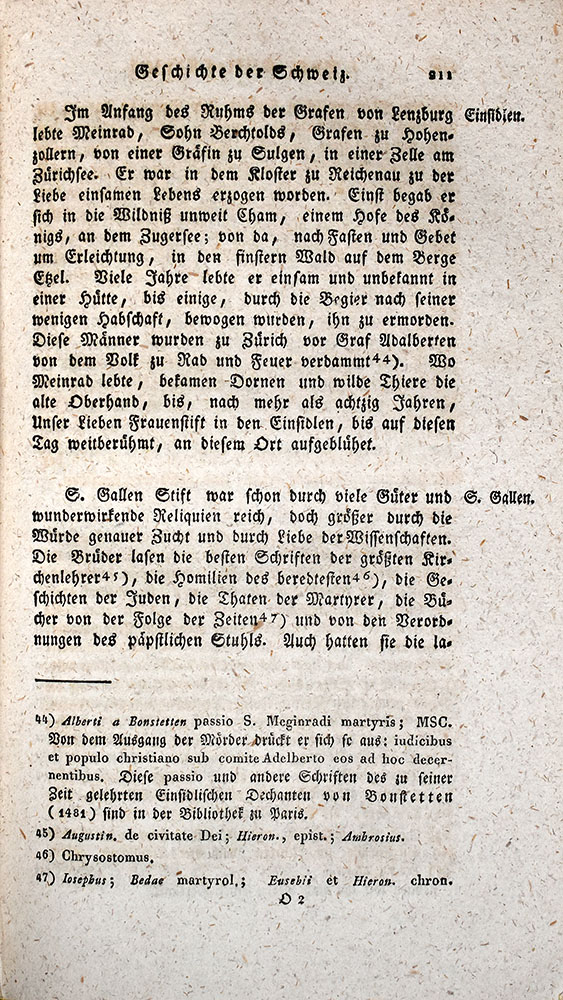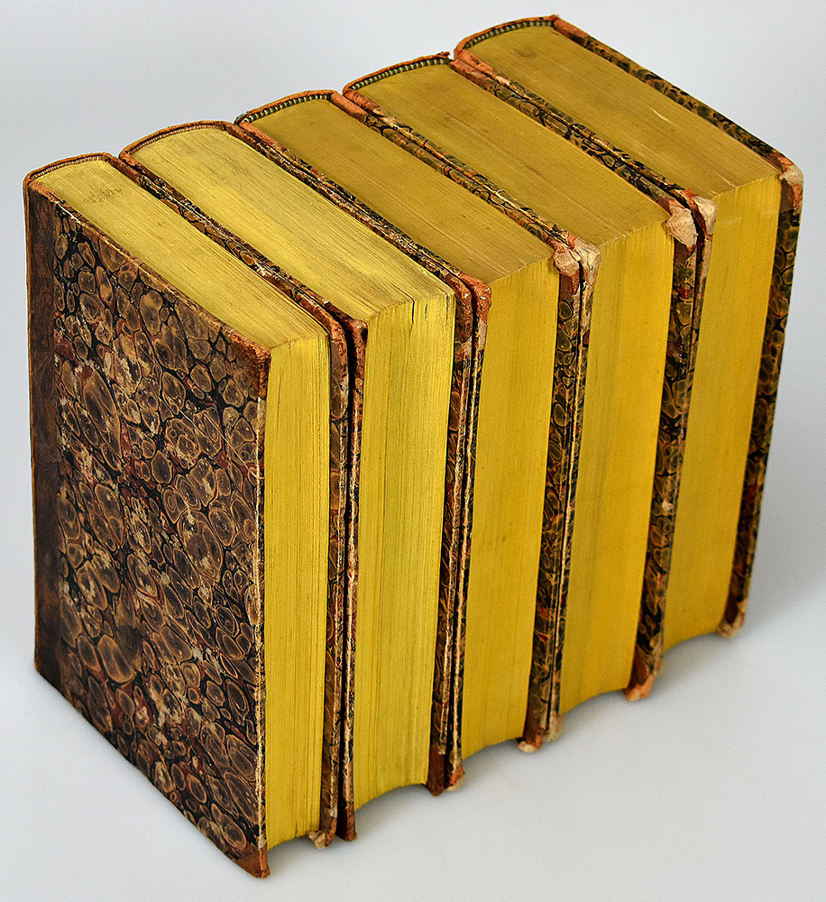 Müller, Johann von: Der Geschichten Schweizerischer Eidgenossenschaft. Erster Theil: Von des Volks Ursprung. Zweyter Theil: Von dem Aufblühen der ewigen Bünde. Dritter Theil: Bis auf den ersten Französischen Krieg. Vierter Theil: Bis auf die Zeiten des Burgundischen Kriegs. Fünfter Theil: Bis auf die Erklärung des Schwabenkriegs. 5 Bände. Leipzig, in der Weidmannischen Buchhandlung/G. Reimer, 1825-1826. 8°. 21 x 13,5 cm. LX, 648, IV, 771, VI, 677 (3), XVI, 772, VIII, 440 Seiten. Private Halblederbände der Zeit mit goldgeprägten Rückentiteln auf schwarzen Lederschildchen, marmoriertem Bezugspapier und gelben Schnitten.