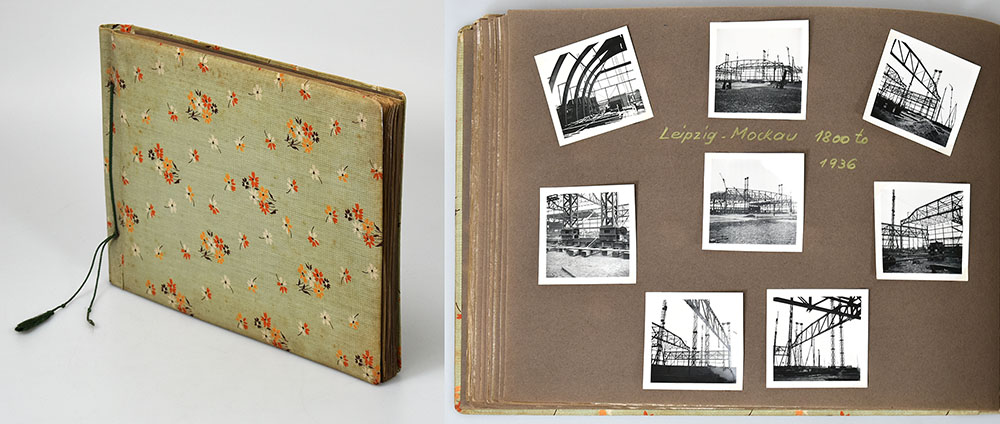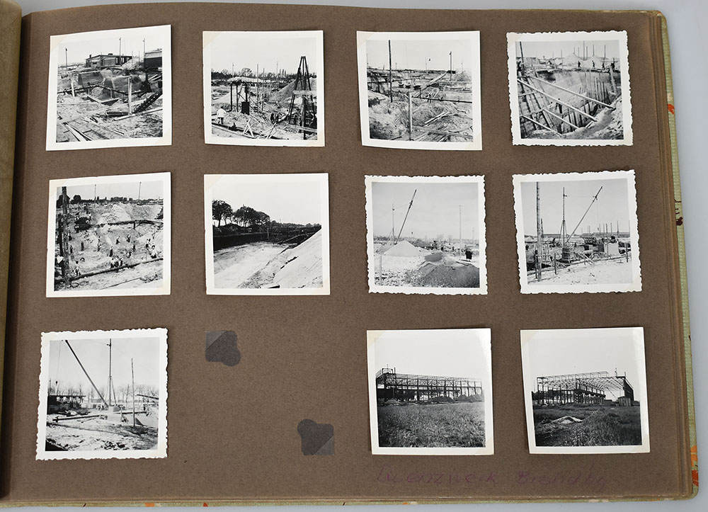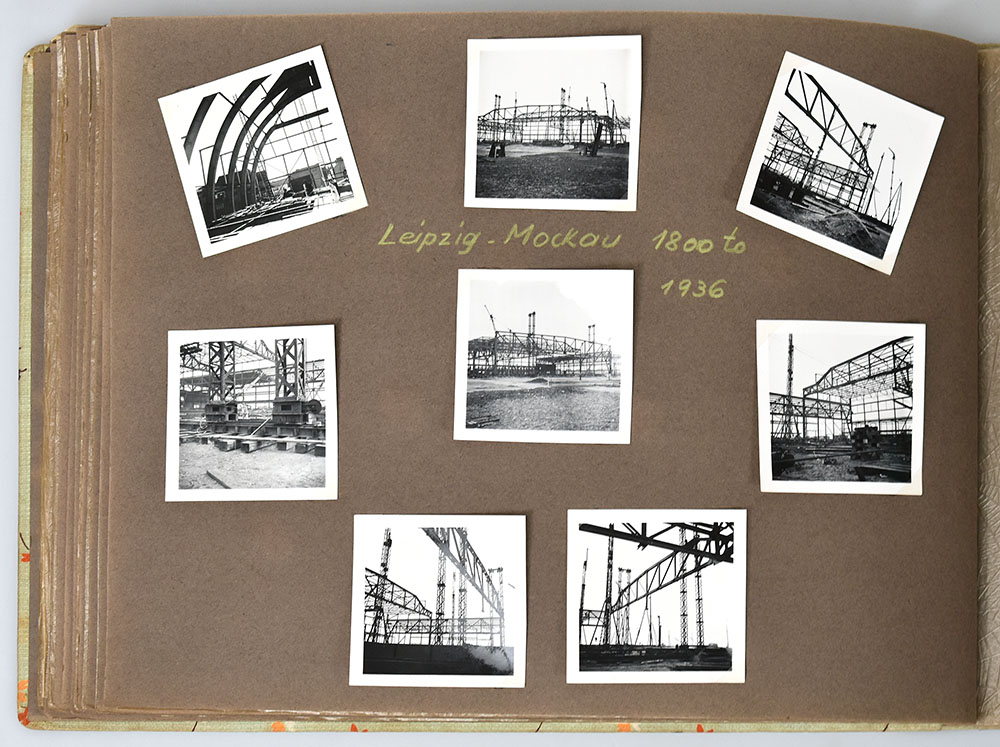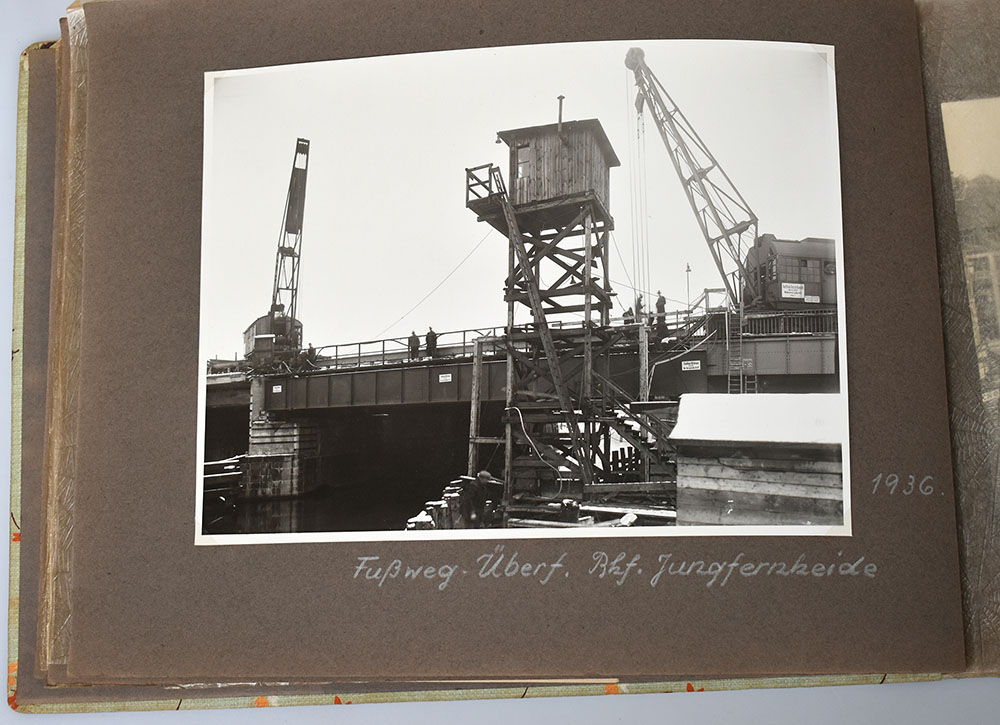 Textilbezogenes kordelgebundenes historisches Fotoalbum, Maße: 26 x 36 cm, mit 25 eingebundenen braunen Kartonbögen, davon 17 Bögen mit insgesamt 99 Original-Schwarzweißfotografien hinter Seidenhemdchen im Format 4,5 x 5,5 cm bis 17,5 x 23,3 cm, teils lose, teils zwischen Fotoecken gesteckt, mit Aufnahmen aus dem Bereich des Brückenbaus. Im Album handschriftlich notierte Baustellen und Orte: Straßenbrücke „Ruhlsdorfer Brücke“ 1935/36, Fußweg-Überf. Bhf. Jungfernheide 1936, Nord-Süd-S-Bahn Kreuzungsbauwerk Weidendamm 1935/36, Lustgarten 1936 und Stahlbau Wittenau 1936 (beides jeweils auf Foto vermerkt), Pionierlehrbrücke Reh. Klausdorf 1935, Schrotkranbahn Weberwerk Brandenburg 1936, Stahlwerk Weber Brandenburg-Verladebrücke 1936, Tegeler Hafenbrücke Verstärkung 1936, Reichsautobahn Erkner, Leipzig-Mockau 1936, Hohenzollernkanal, Fehrbellinerplatz, BVG Zehlendorf, Stahlwerk Brandenburg, RAB Ferch-Lienewitz, Quenzwerk Brandenburg, 80 Generatoren Brandenburg, dabei 17 lose Fotos nicht mehr vollständig zuzuordnen. Beiliegend 4 Zeitungsausschnitte und eine 16-seitige Beilage „Aus der Welt der Technik, Nr. 9, 1935“ mit Beiträgen zum Brückenbau, sowie ein 10-seitiges Typoskript „Das Kreuzungsbauwerk der Nord-Süd-S-Bahn der Deutschen Reichsbahn-Gesellschaft an der Weidendammer Brücke in Berlin“, datiert 30.7.1936, letzte Seite signiert mit „Hanebeck“ [Baugesellschaft Hanebeck], dazu eine Konstruktionszeichnung der Spreeunterfahrung. Textileinband etwas fleckig, Seidenhemdchen teils geknickt oder mit Ausrissen. Album in gutem, Fotos in sehr gutem Zustand.