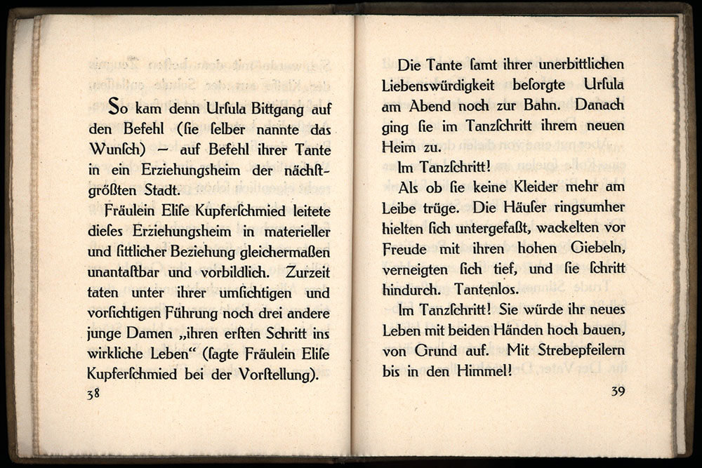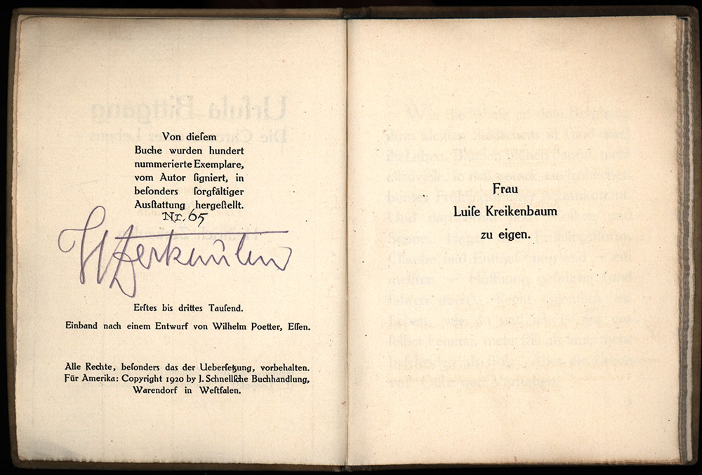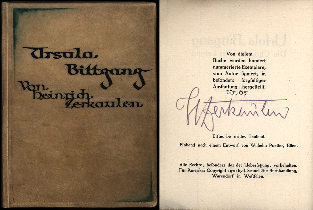 Zerkaulen, Heinrich: Ursula Bittgang. Die Chronik eines Lebens. [Signiertes, nummeriertes Exemplar.] Warendorf im Münsterland, Heimatverlag der Schnell’schen Buchhandlung (C. Leopold), 1920. Klein-8°. 15,5 x 11,5 cm. 87 Seiten. Pergamentband mit handgeschriebenem Deckeltitel.