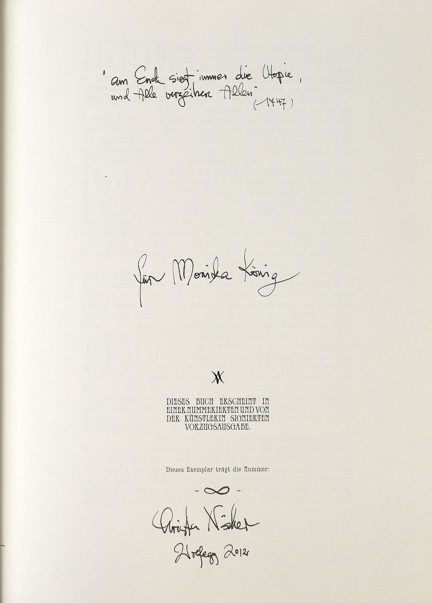 Hier ein persönliches, unnummeriertes Exemplar mit signierter handschriftlicher Widmung von Christa Näher und einem zugesetzten Zitat, datiert 2012. Buch durchgehend mit farbigen Illustrationen. Sehr gutes Exemplar.