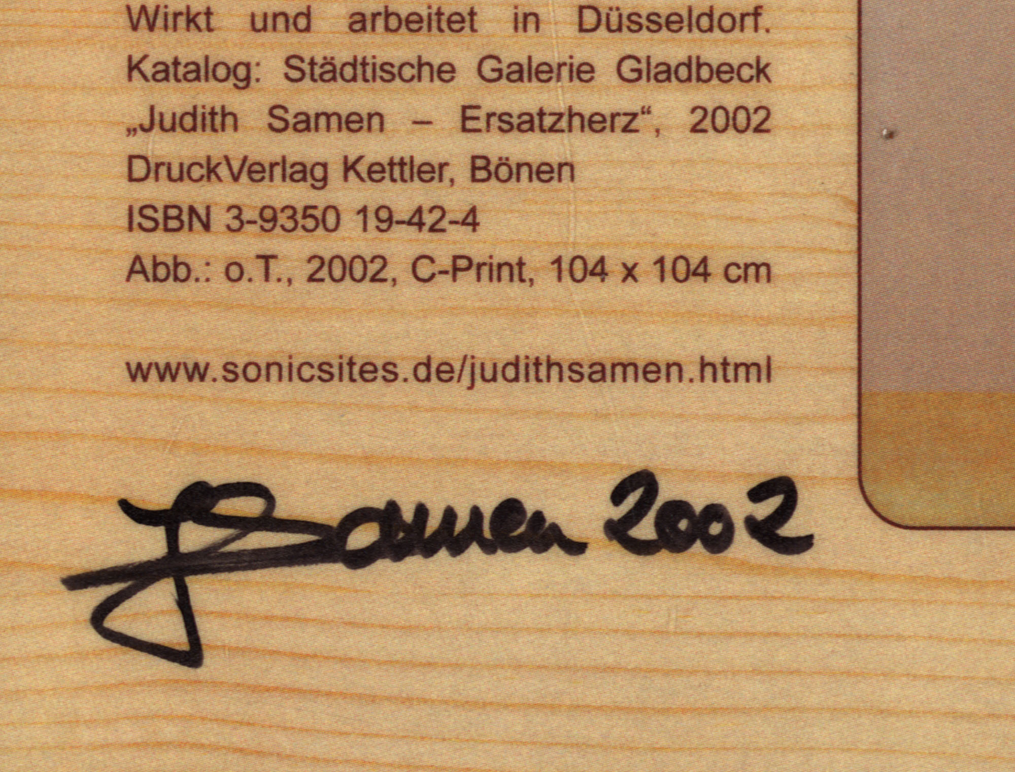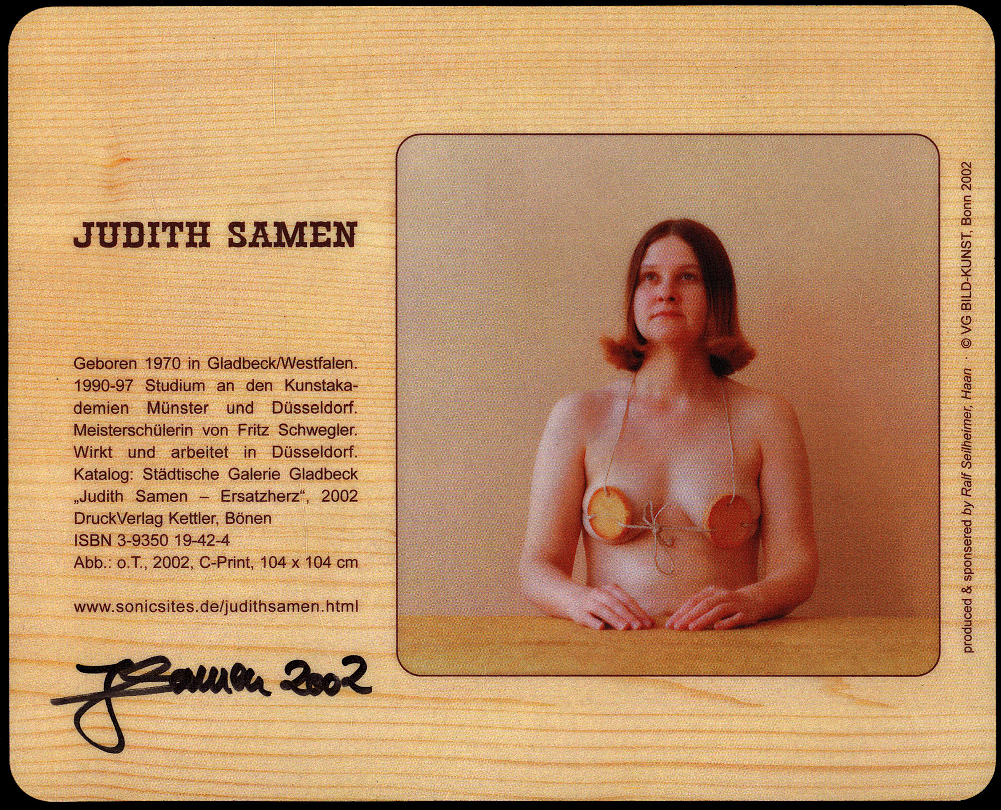 Original-Mousepad, vorderseitig mit einer Fotografie und einer Kurzbiografie von Judith Samen farbig bedruckt, in der linken unteren Ecke von Judith Samen mit schwarzem Marker signiert und datiert (2002). Aus dem Nachlass des Unternehmers und Kunstsammlers Ralf Seilheimer. Sehr guter Zustand.