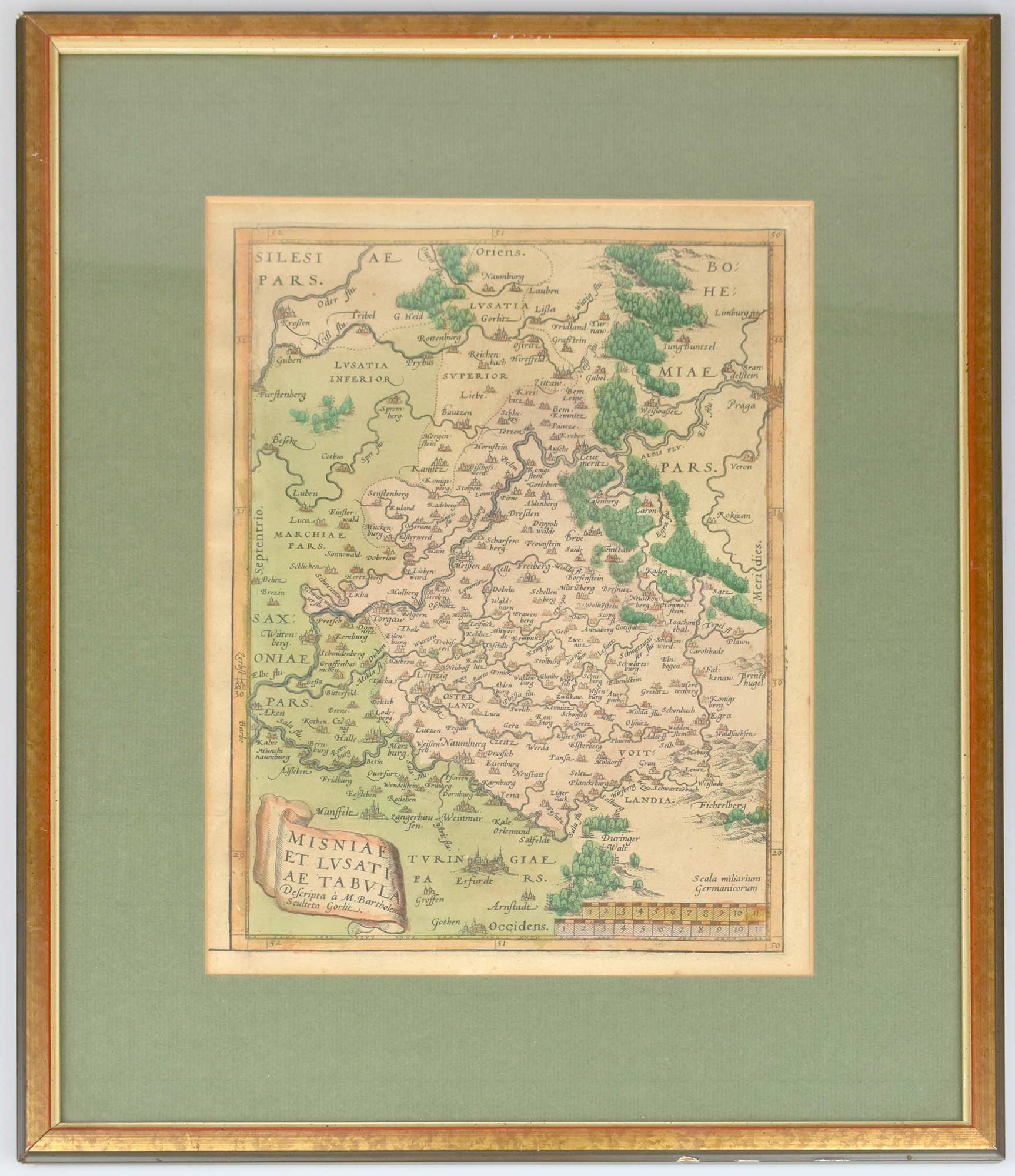Kolorierter Kupferstich aus dem Atlas von Abraham Ortelius. Mit Meilenzeiger. Mit den Gebieten um Erfurt – Görlitz – Wittenberg – Prag. Gerahmt hinter Glas/Passepartout im vergoldeten Holzrahmen. Nicht ausgerahmt. Maße Abbildung: 29,0 x 21,0 cm. Maße Rahmen: 46,0 x 37,0 cm, rückseitig mit einem Haken zur Aufhängung. Rahmen mit leichten Gebrauchsspuren, eine Ecke und die untere Leiste mit Stoßstellen, rückseitig mit handschriftlichem Vermerk. Rückenplatte leicht stockfleckig. Blatt im oberen linken Eckbereich im Falz mit winzigem Einriss. Guter bis sehr guter Zustand.