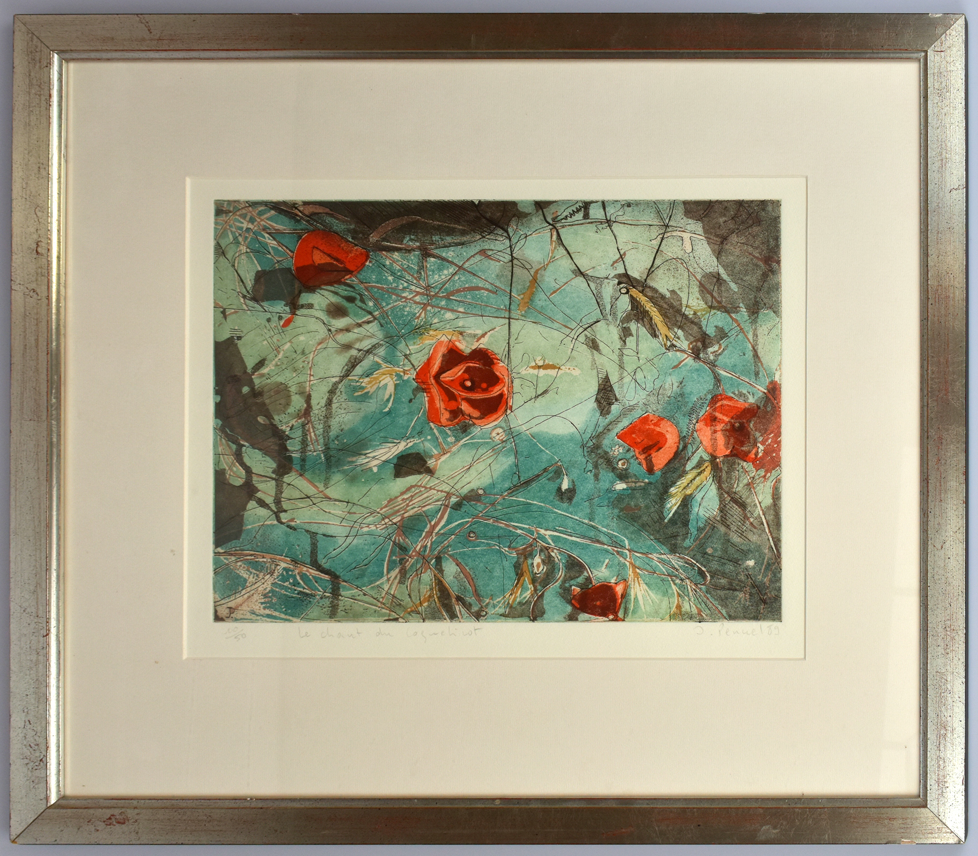 Nummer 10 von 50 Original-Radierungen, Aquatinta, „Le chant du coquelicot“ von Jean Penuel, unterhalb der Abbildung mit Bleistift nummeriert, betitelt, signiert und datiert (89). Hinter Glas/Passepartout im silberfarbigen Metallahmen gerahmt, rückseitig mit einer Drahtschnur zur Montage. Nicht ausgerahmt. Maße Abbildung: 27,2 x 35,3 cm. Maße Rahmen: 53,4 x 59,2 cm. Rahmen mit wenigen kleinen Stoßstellen. Insgesamt sehr guter Zustand. Number 10 of 50 original etchings, aquatinta, „Le chant du coquelicot“ by Jean Penuel, numbered, titled signed and dated (89) with pencil below the plate. Framed behind glass/passepartout in a silverish metal frame, with one metal string for mounting at the backside. Not examined out of frame. Dimensions illustration: 27.2 x 35.3 cm. Dimensions frame: 53.4 x 59.2 cm. Frame with few small bumps. Overall fine condition.