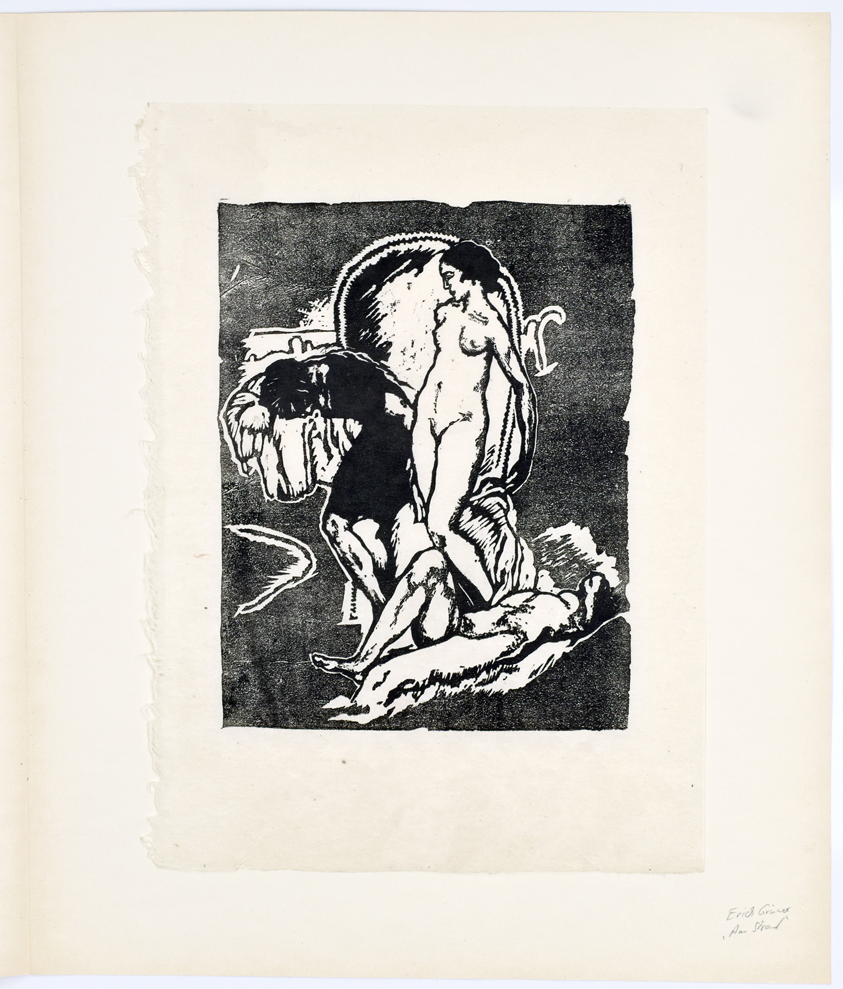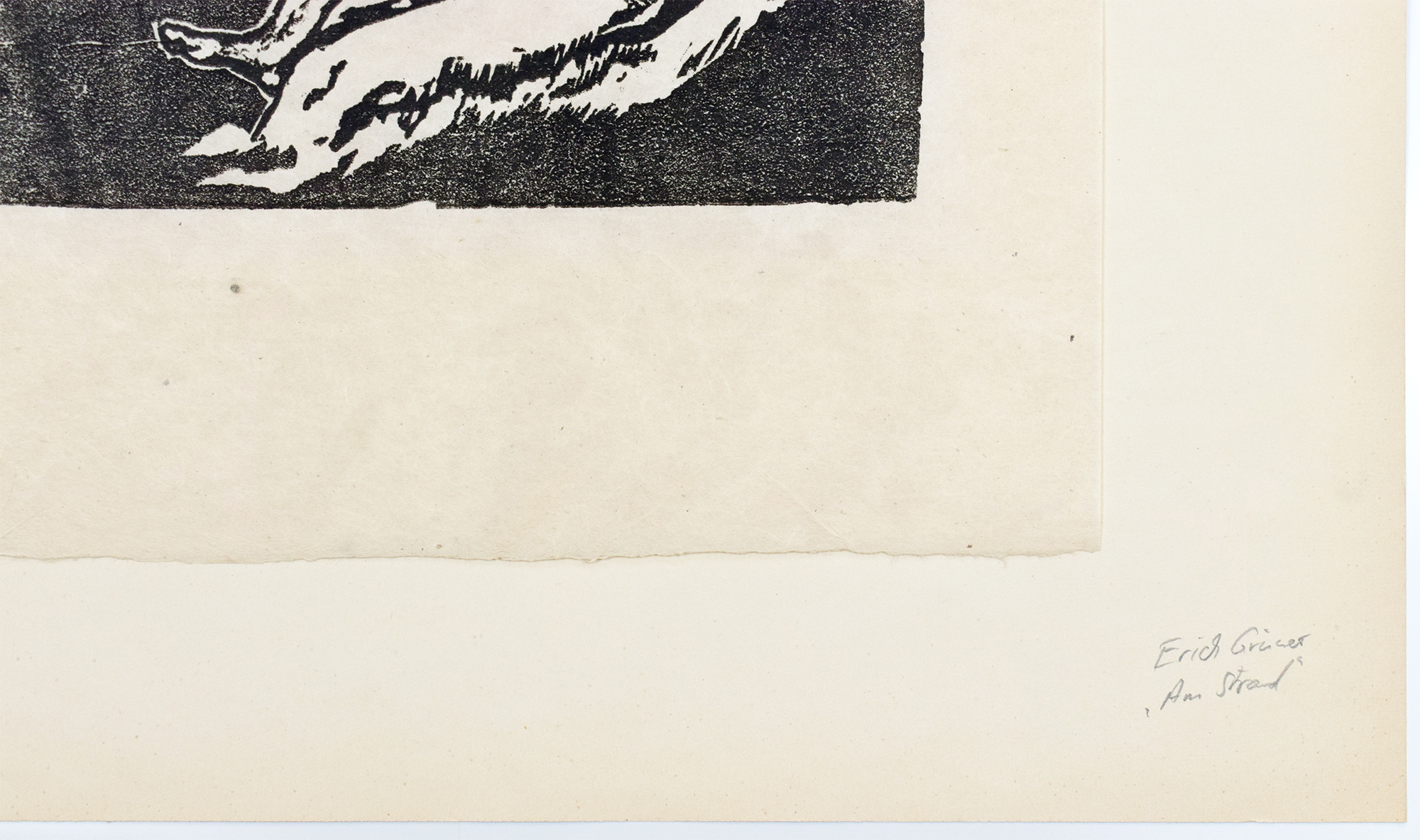 Original linocut by Erich Gruner on thin japanese paper. Mounted behind passepartout in both upper corners. Picture size: 29.0 x 22.3 cm. Sheet size: 42.2 x 30.5 cm. Passepartout size: 53.7 x 44.4 cm. Passepartout with blind embossing „Freunde graphischer Kunst e.V. Leipzig, I.2“. Passepartout lightly darkened at the margins due to aged paper. Nearly fine condition.