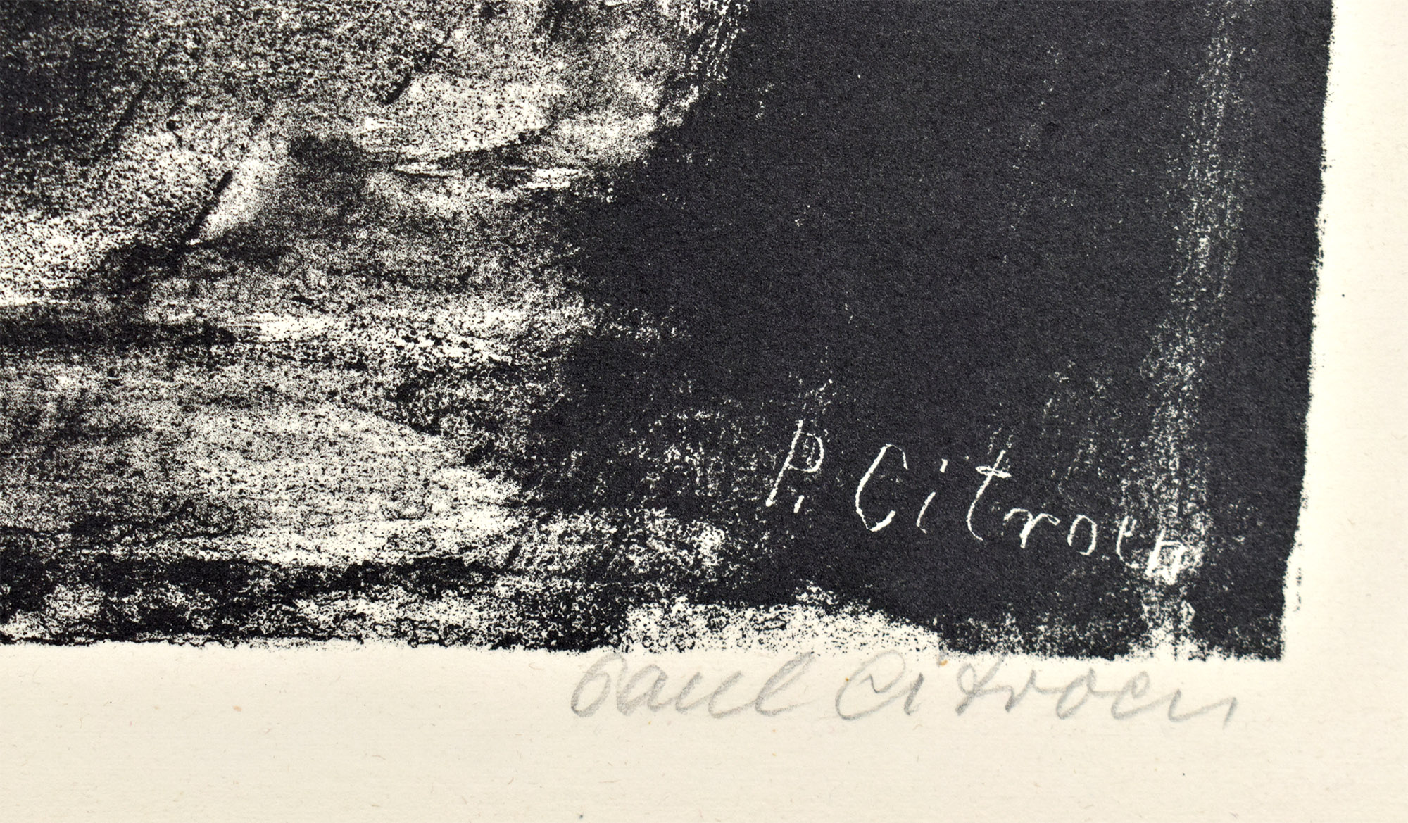Nummer 51 von 100 Original-Lithografien von Paul Citroen, in der Druckplatte signiert, unterhalb der Abbildung mit Bleistift nummeriert und signiert. Maße Abbildung: 34,0 x 38,0 cm. Maße Blatt: 38,3 x 49,7 cm. Beide obere Blattecken mit schwacher Knickspur, ansonsten sehr guter Zustand.