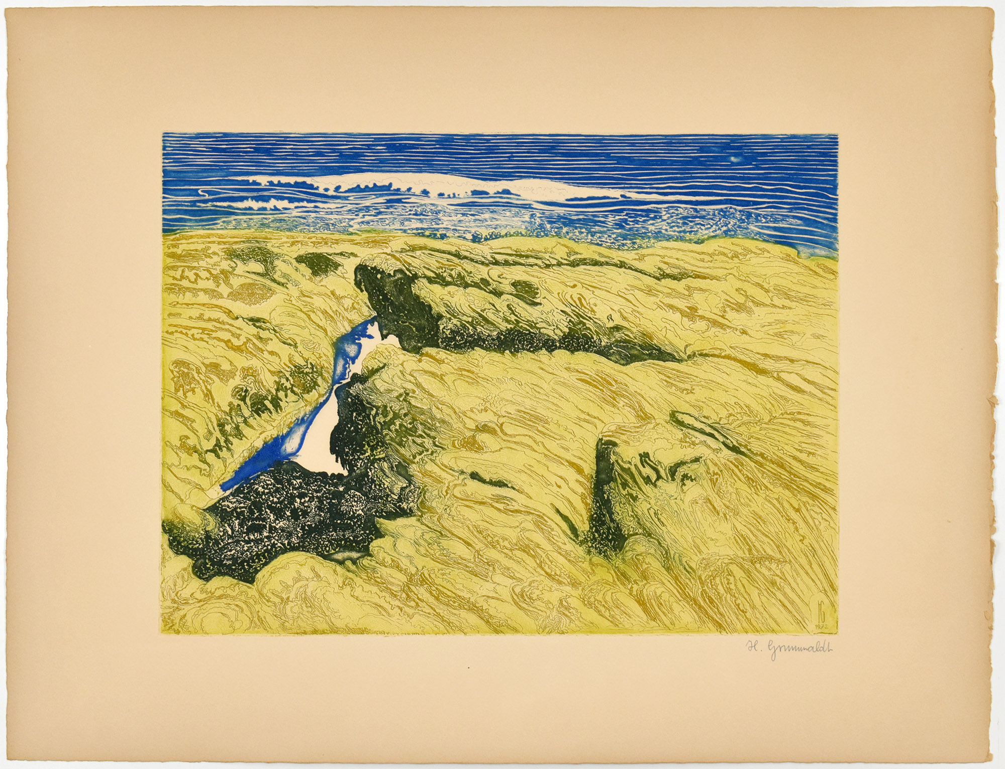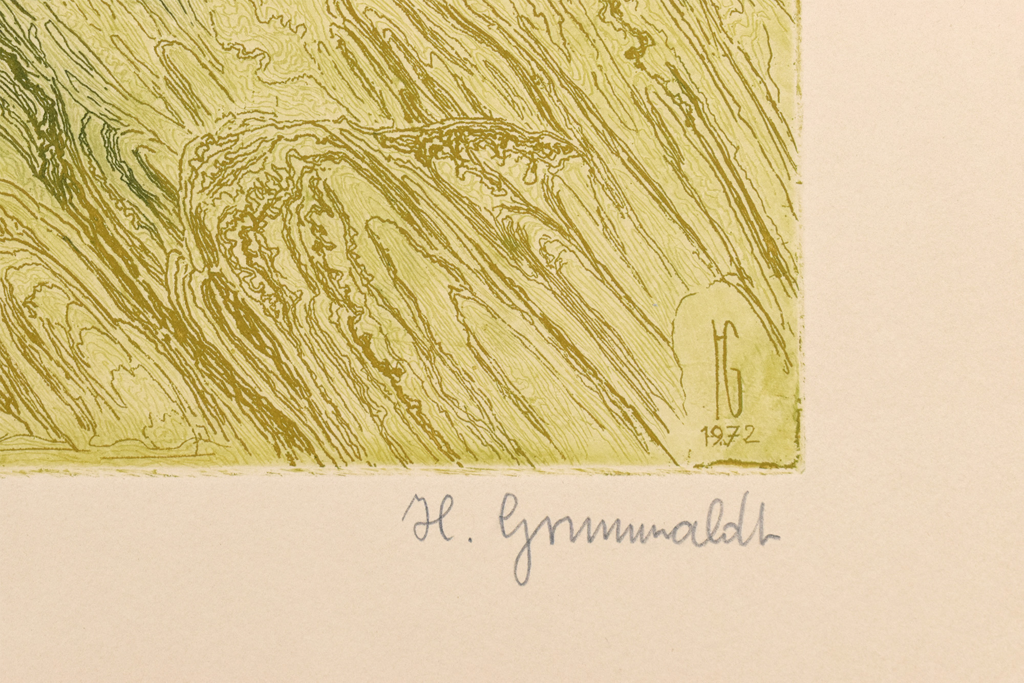 Original-Farbradierung, Aquatinta, von Herbert Grunwaldt auf Rives 88-Bütten, rechts unterhalb der Abbildung signiert, in der Druckplatte monogrammiert und datiert (1972). Edition der Griffelkunst, F 96. Maße Abbildung: 25,0 x 33,5 cm. Maße Blatt: 37,6 x 48,6 cm. Blatt alterungsbedingt gebräunt, rückseitig etwas fleckig gebräunt. Guter Zustand.