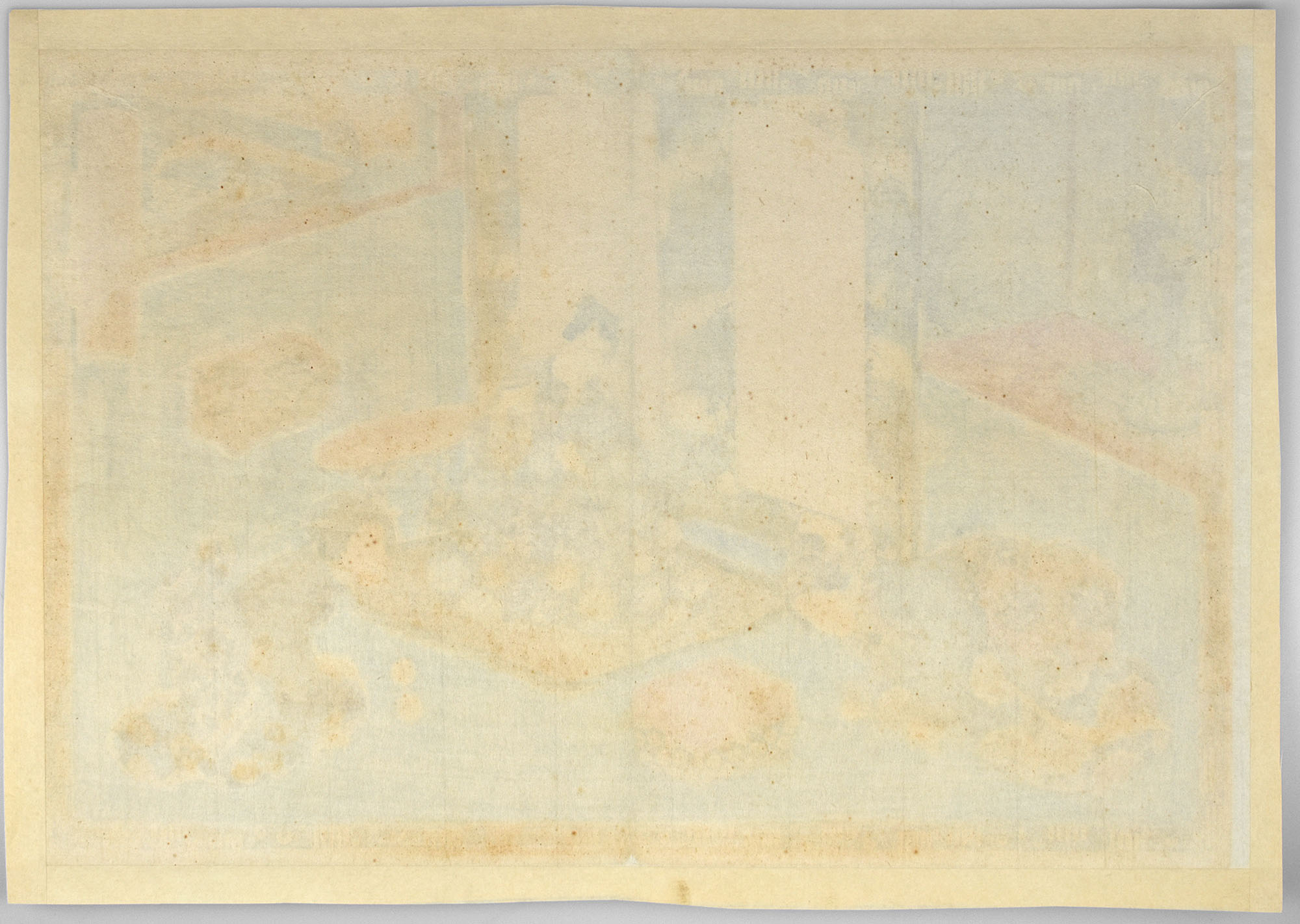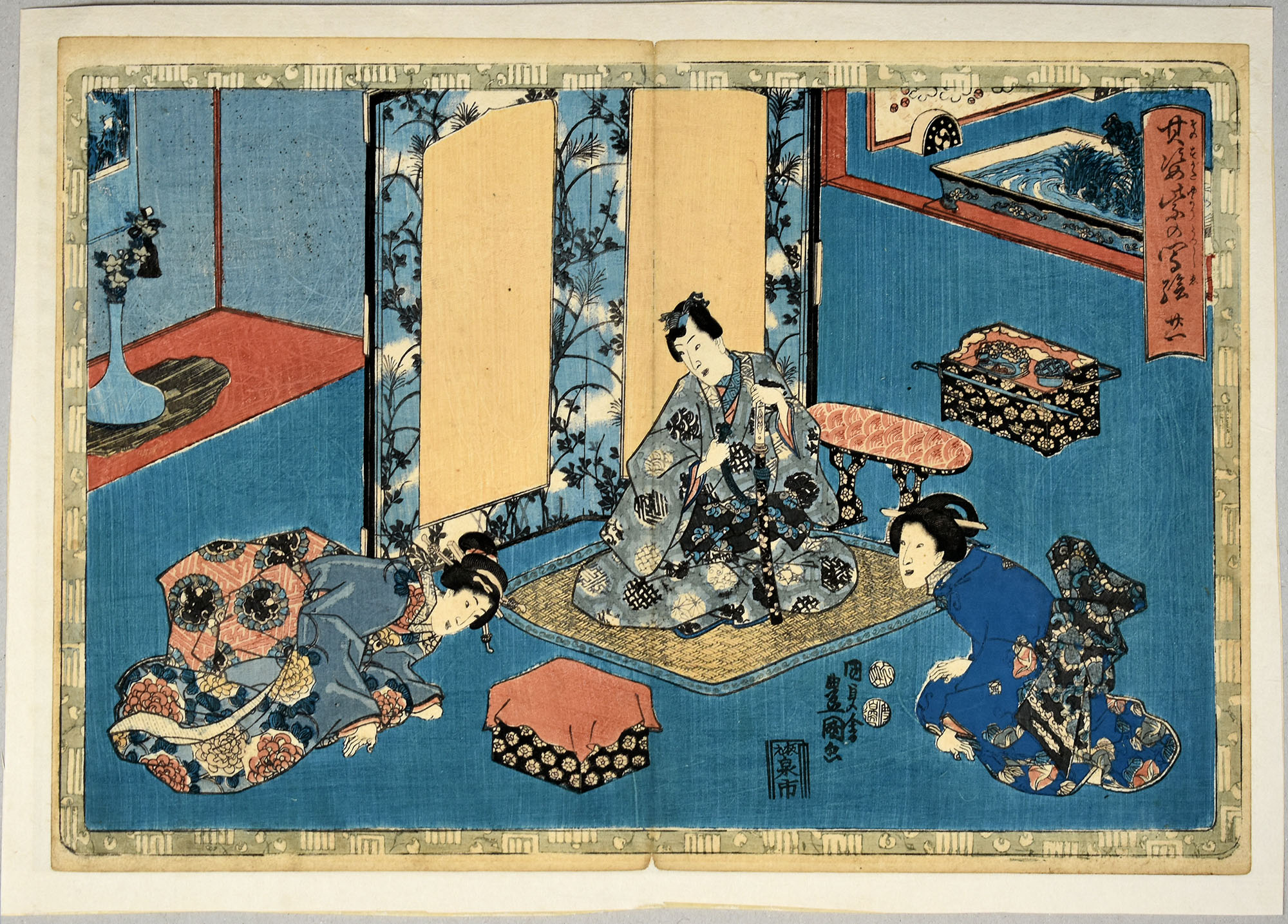 Original-Farbholzschnitt, zusammengesetzte Doppelseite, von Kunisada I auf Japanpapier, eine Szene aus der Serie „Sono sugata yukari no utsushi-e“ (Die magischen Laternen der roten Figur), Nummer 21. Signiert Kunisada aratame Toyokuni ga, Druck zwischen 1847 und 1852 (Koka 4-Kaei 5). Verlegt von Izumiya Ichibei (Kansendo). Maße Blatt: 25,2 x 36,2 cm. Blatt rückseitig rundherum mit Resten von Klebeband aus früherer Montage (ca. 1,2 cm breit). Guter bis sehr guter Zustand. Vielen Dank an Horst Gräbner für die Angaben.
