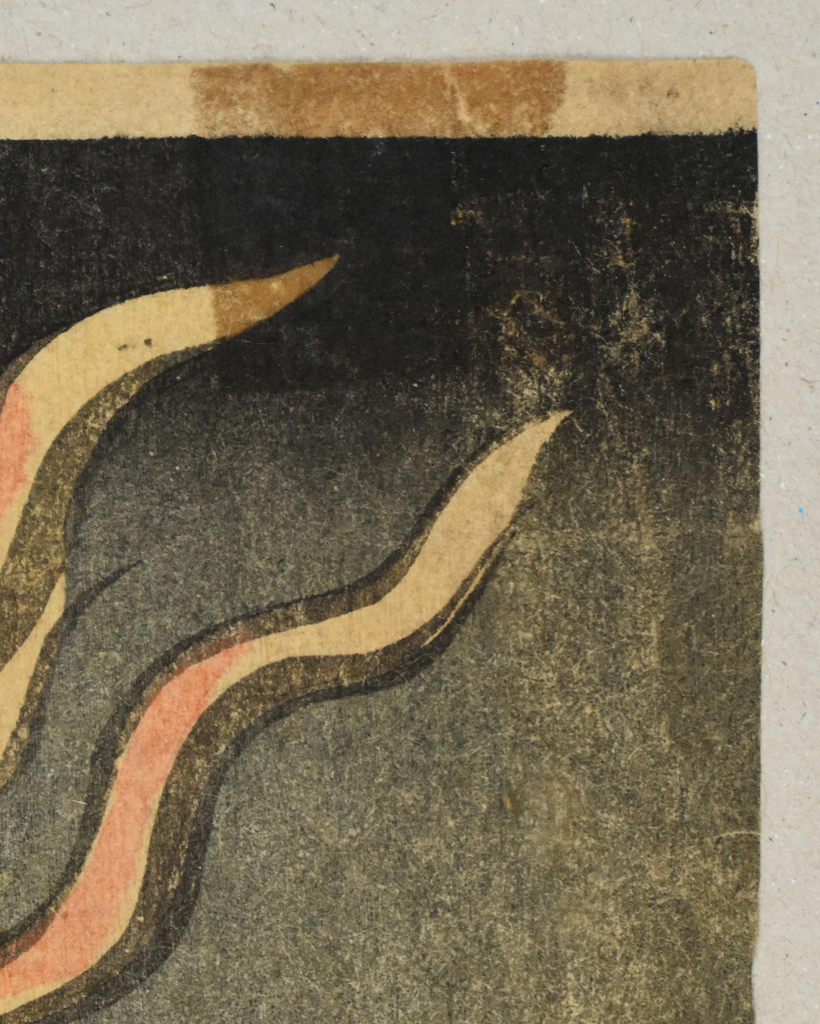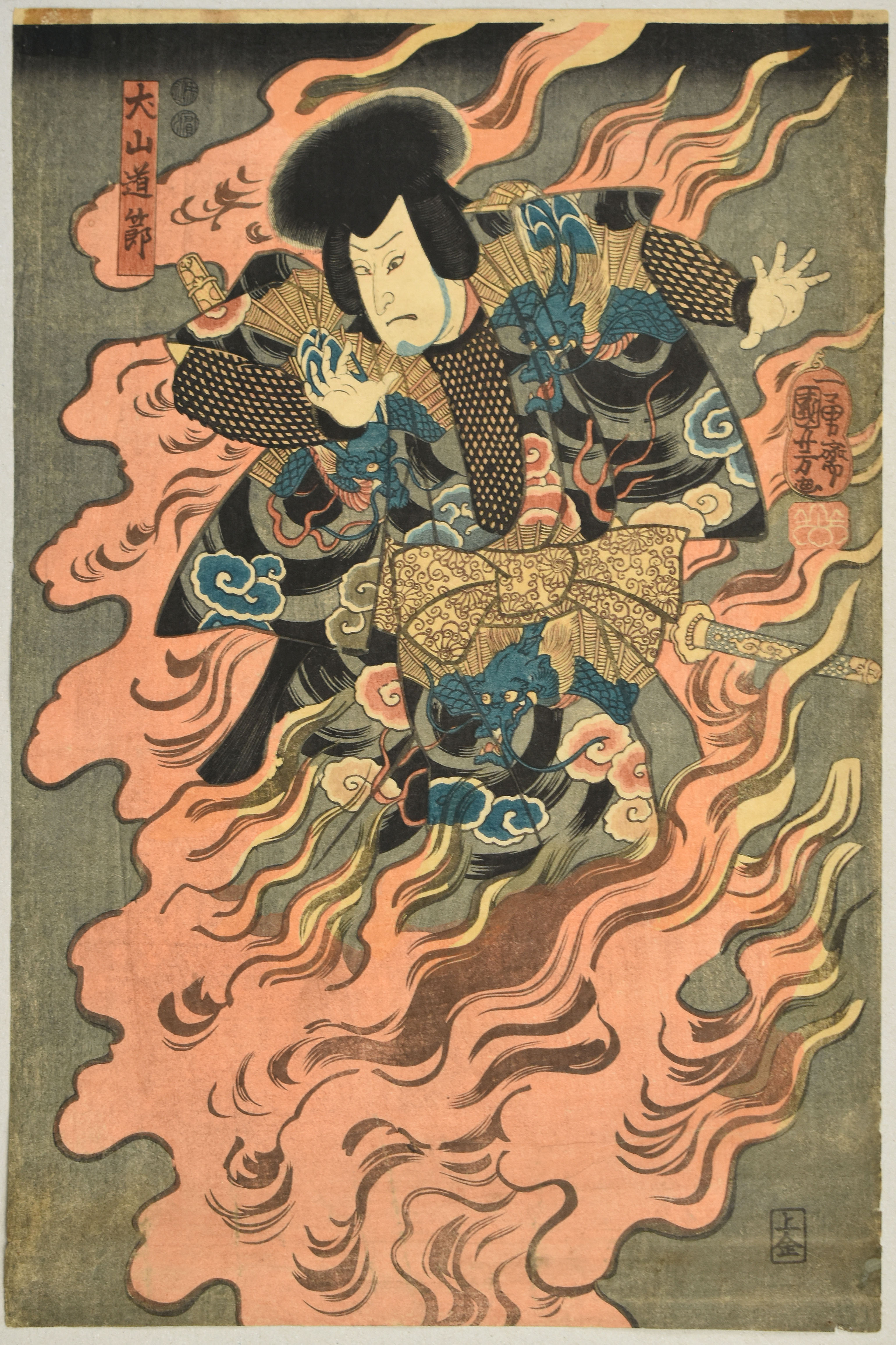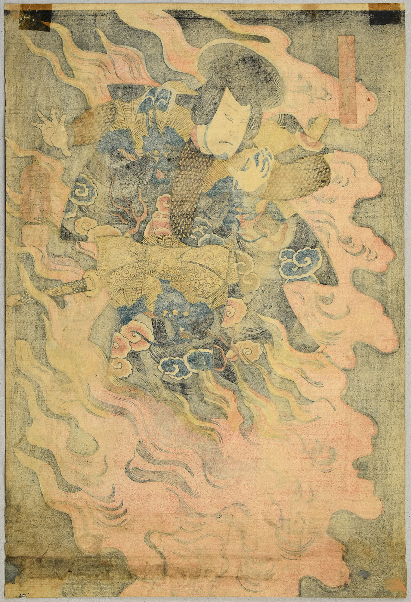 Oberes Blatt eines vertikalen Diptychons. Original-Farbholzschnitt von Kuniyoshi auf Japanpapier (oban tate-e). Kabuki-Szene, (nicht namentlich genannter) Schauspieler in der Rolle von Inuyama Dosetsu in dem Stück „Satomi hakkenden“, aufgeführt am Ichimura-Theater, 1/1852. Der Druck ist nicht datiert, die Datierung erfolgt über das Aufführungsdatum, Kaei 5. Blattgröße: 36,7 x 24,5 cm. Grauer Farbauftrag des bildnerischen Hintergrunds teils aufgehellt. Blatt im oberen mittleren Bereich minimalst und im unteren Bereich leicht ausgedünnt. Unterer und untere seitliche Blättränder mit minimalsten Fehlstellen. Blatt rückseitig am oberen Rand mit zwei bräunlichen Kleberesten, die vorne leicht durchscheinen. Guter bis sehr guter Zustand. Vielen Dank an Horst Gräbner für die Angaben.