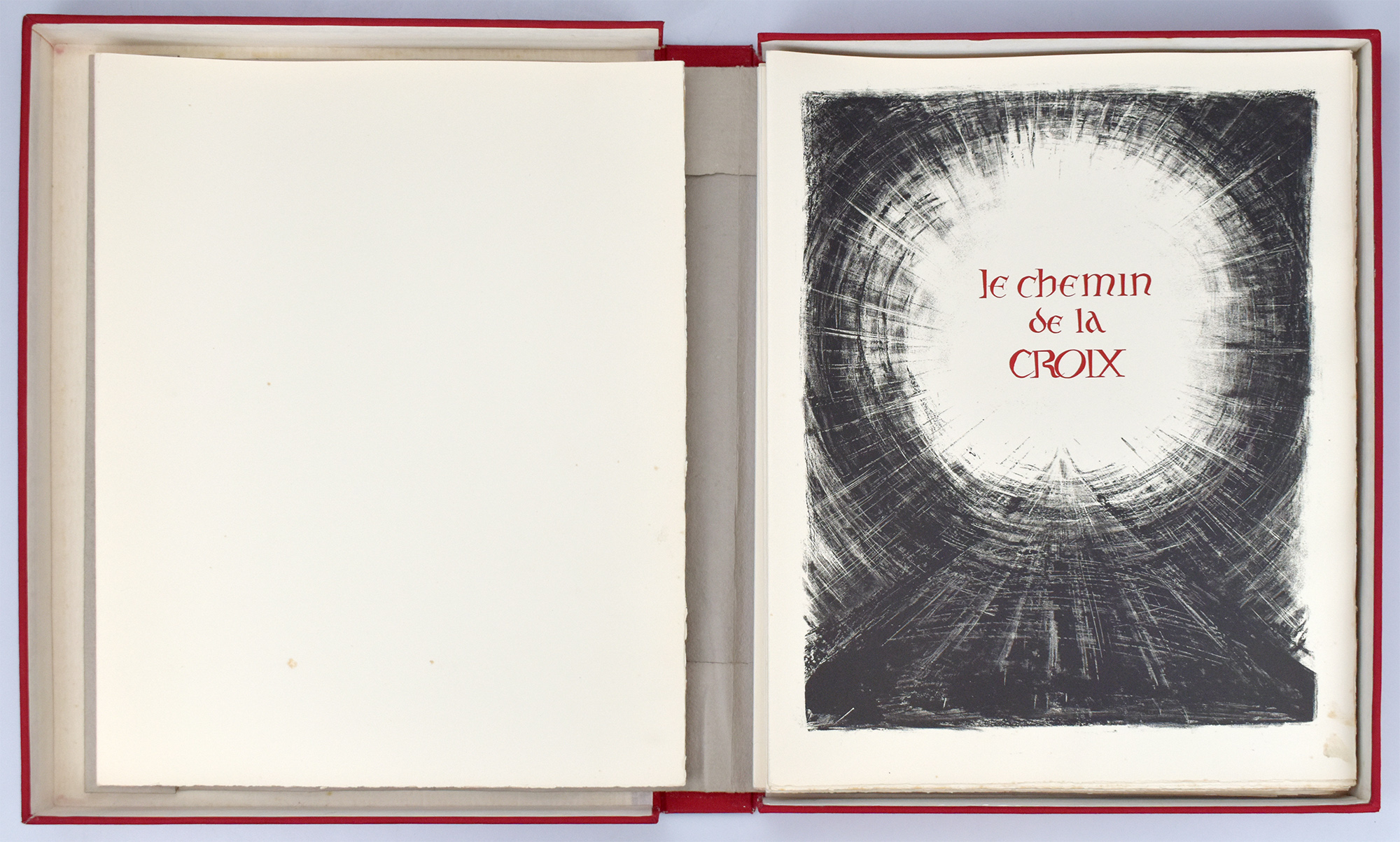 Claudel, Paul – Traver, Louis: Le chemin de la croix. Préface de François de la Noë. Lithographies originales de Louis Travert. Paris, Verlag der Galerie Jean Giraudoux, 1962. 2°. 41 x 30 cm. [72] Seiten auf einfach gefalteten losen Bögen in einfachem Umschlag. Rote Original-Leinenkassette.
