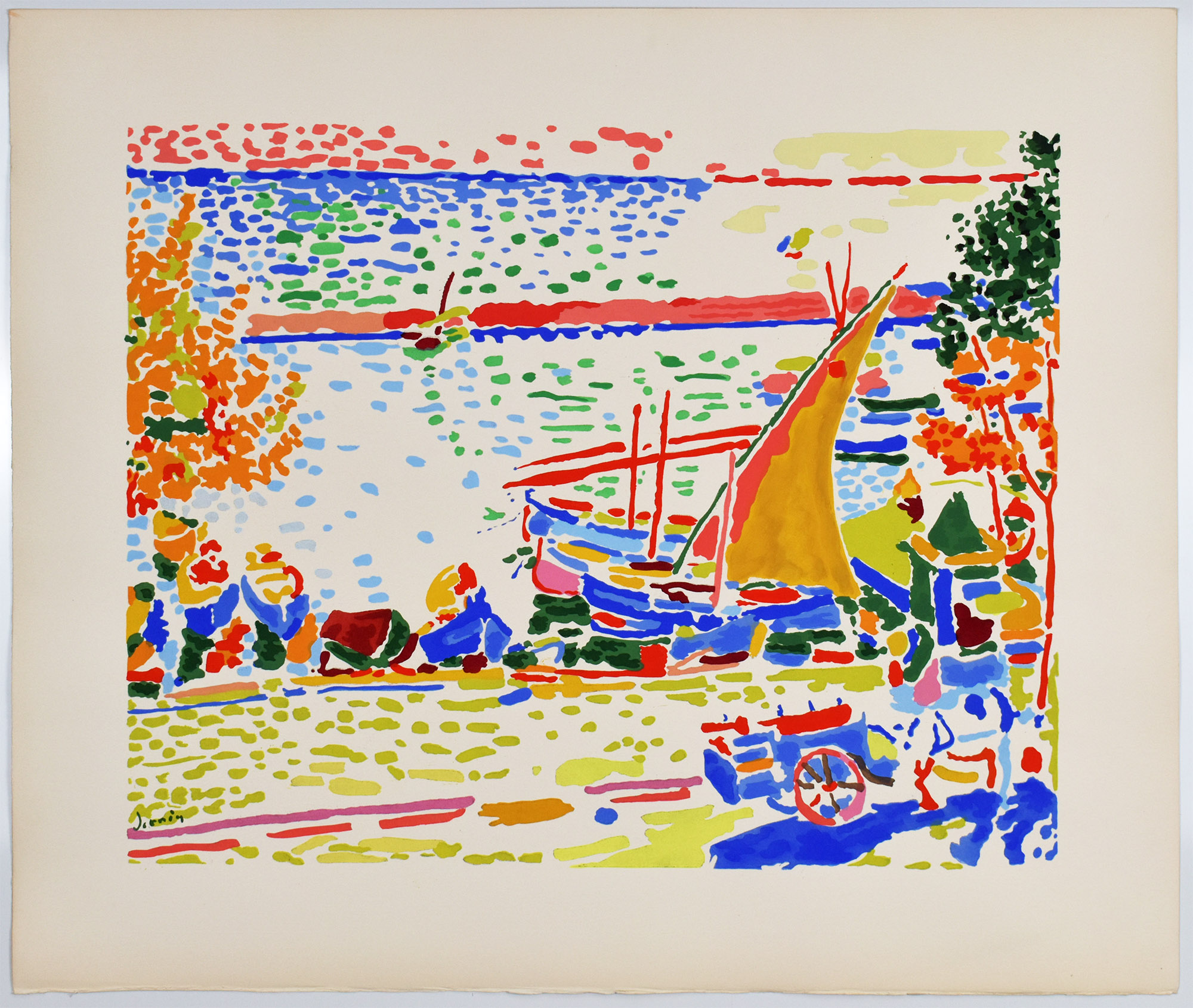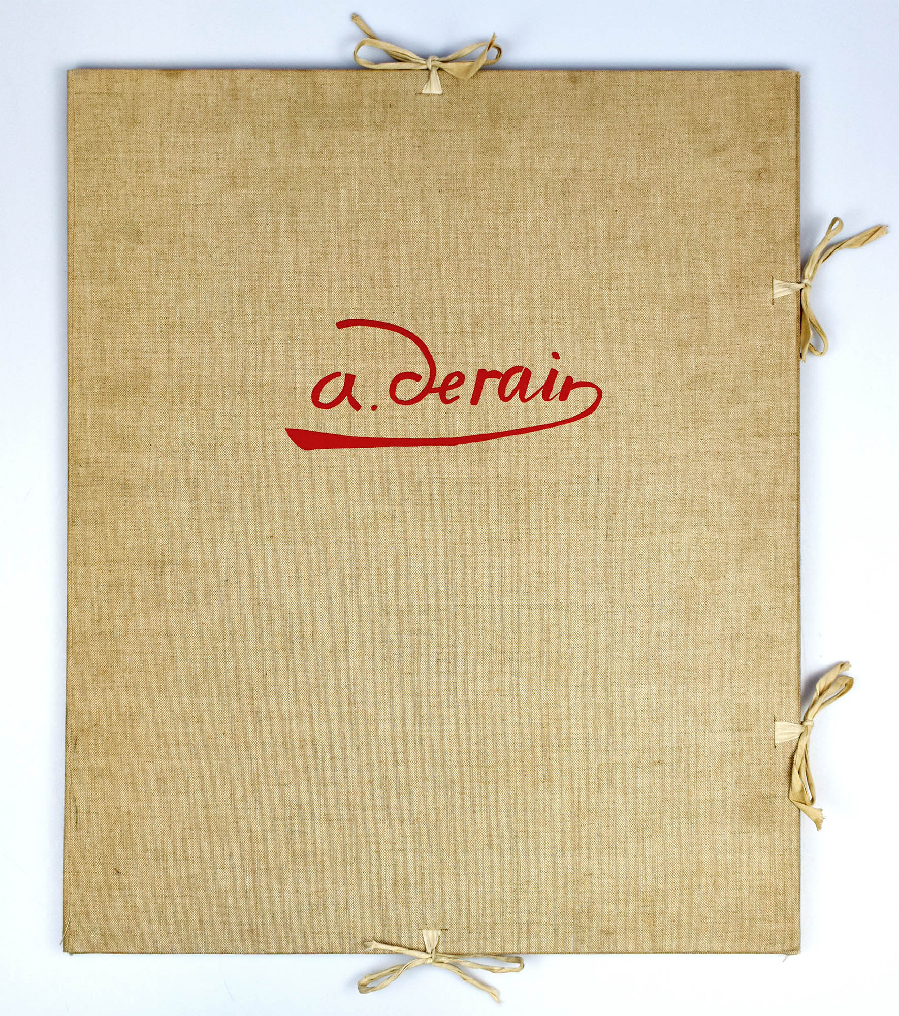[12] pages on single-folded sheets and 12 plates loosely inserted in original cloth portfolio with ribbon ties. One of 100 copies of the second edition. French-language edition. With 12 works after Derain, printed in pochoir by Dunoyer de Segonzac on Vélin d’Arches. Paper partly lightly darkened, some tissue guards with minor creasing, otherwise fine copy.
