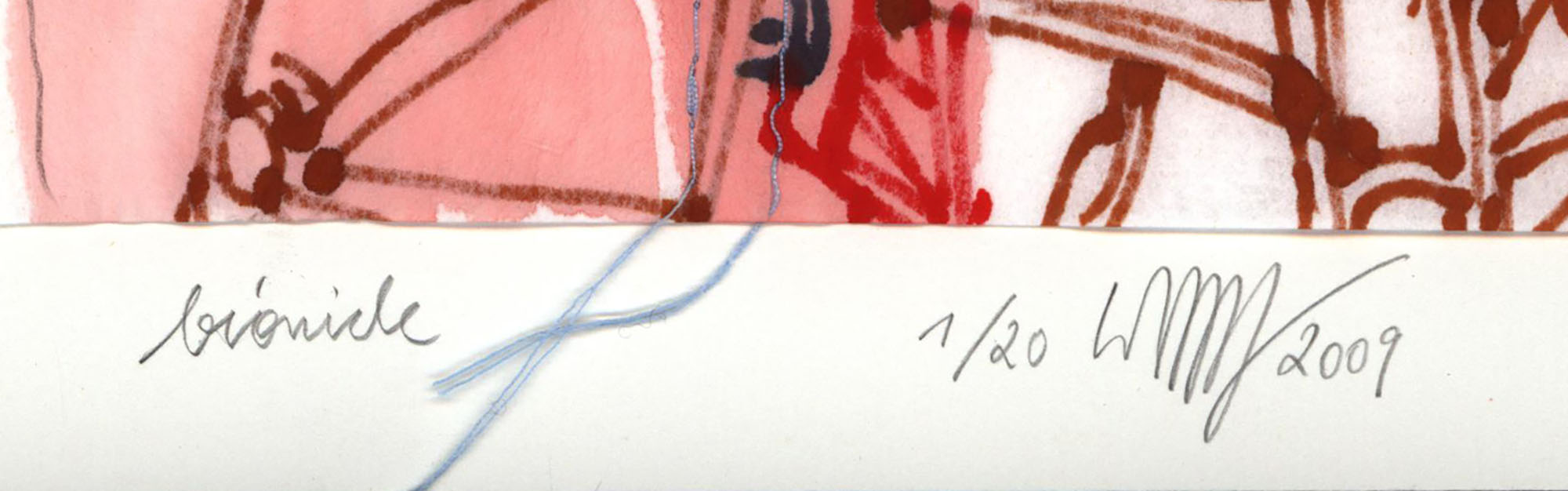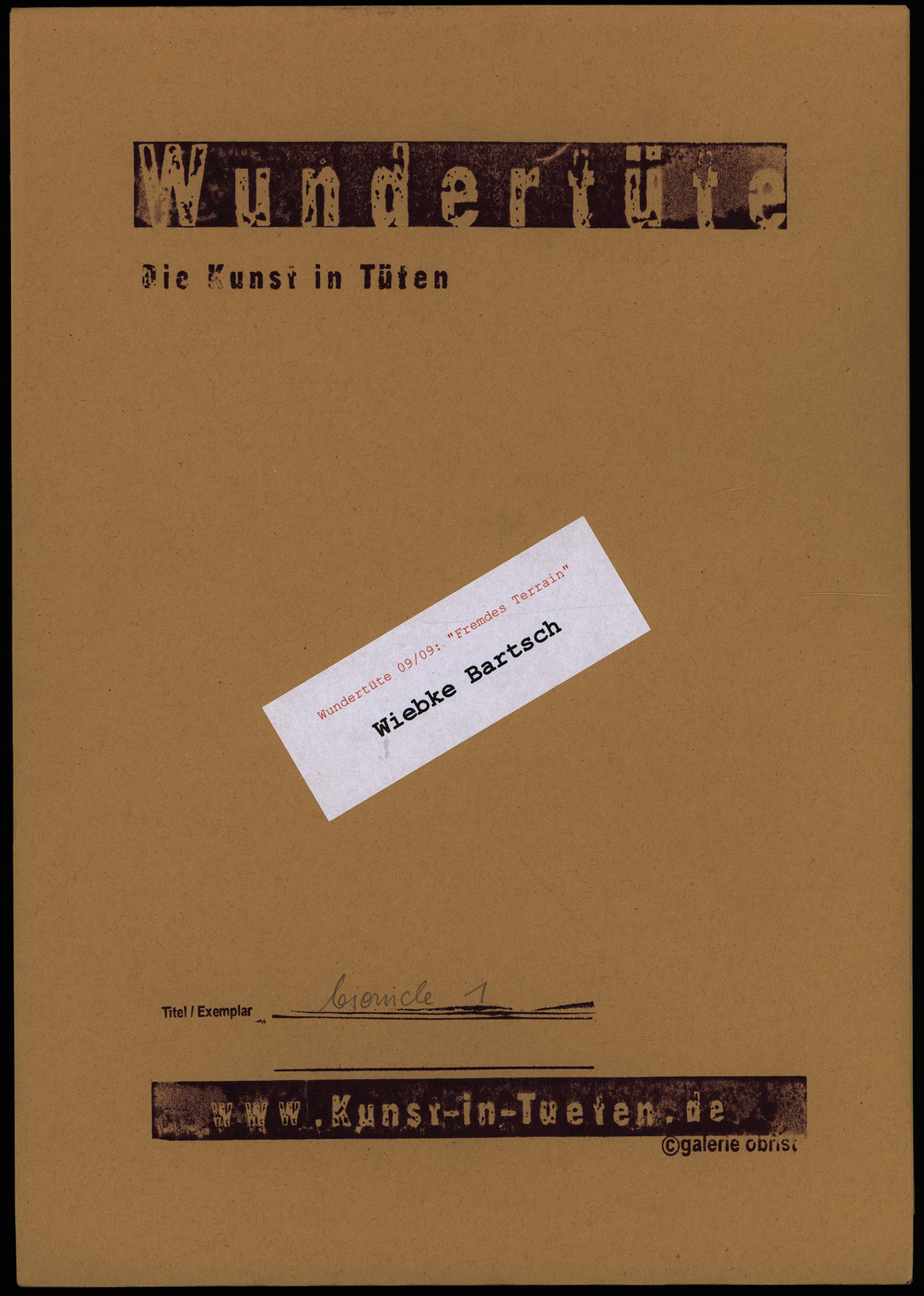 Nummer 1 von 20 Original-Textilcollagen von Wiebke Bartsch, übernähtes Aquarell, am unteren Rand signiert, datiert (2009), nummeriert und bezeichnet. Maße: 26,0 x 18,0 cm. Auf Trägerpapier montiert. Maße: 30,0 x 20,0 cm. Aus der Edition „Wundertüte – Die Kunst in Tüten“ der Galerie Obrist, Essen. Mit dem beiliegenden Original-Briefumschlag im B4-Format. Provenienz: Aus dem Nachlass des Kunstsammlers und Autors Ralf Seilheimer, mit seiner Inventarnummer auf dem Umschlag. Sehr guter Zustand.
