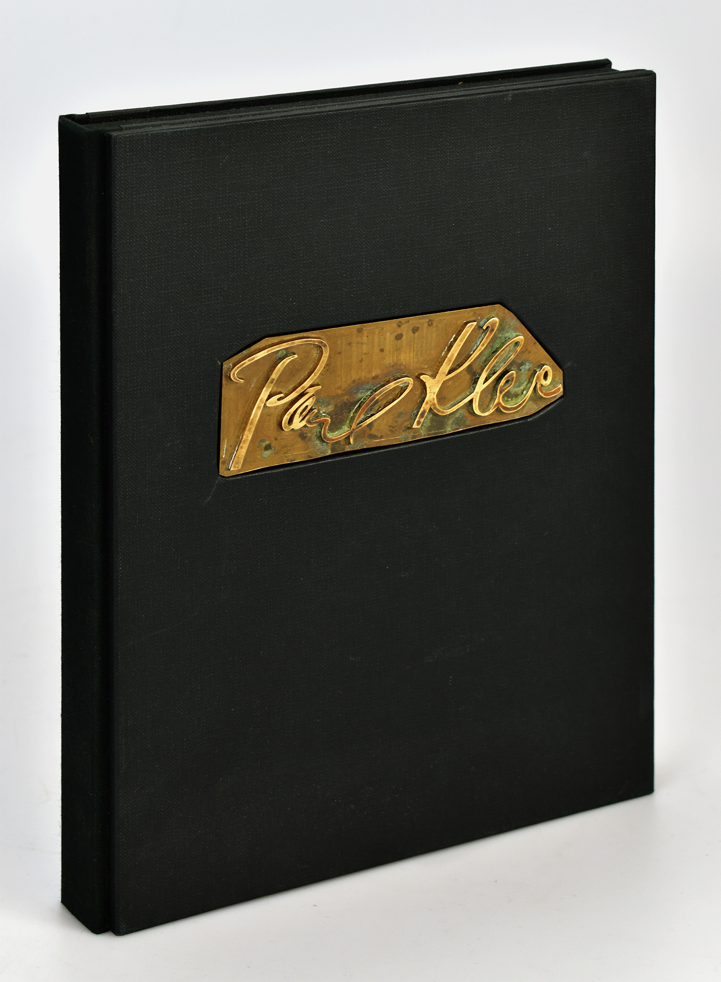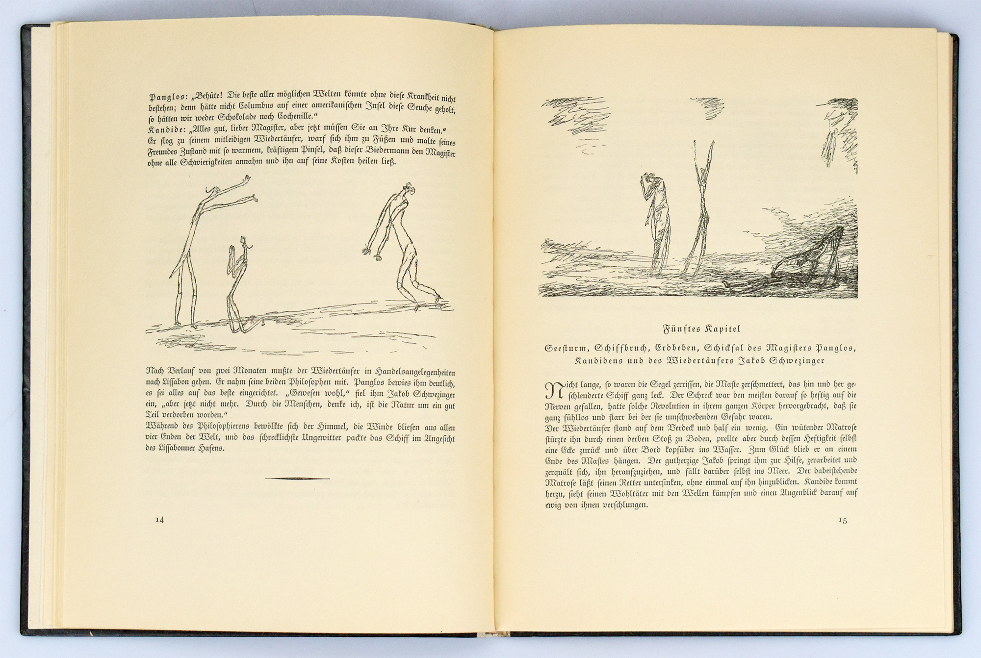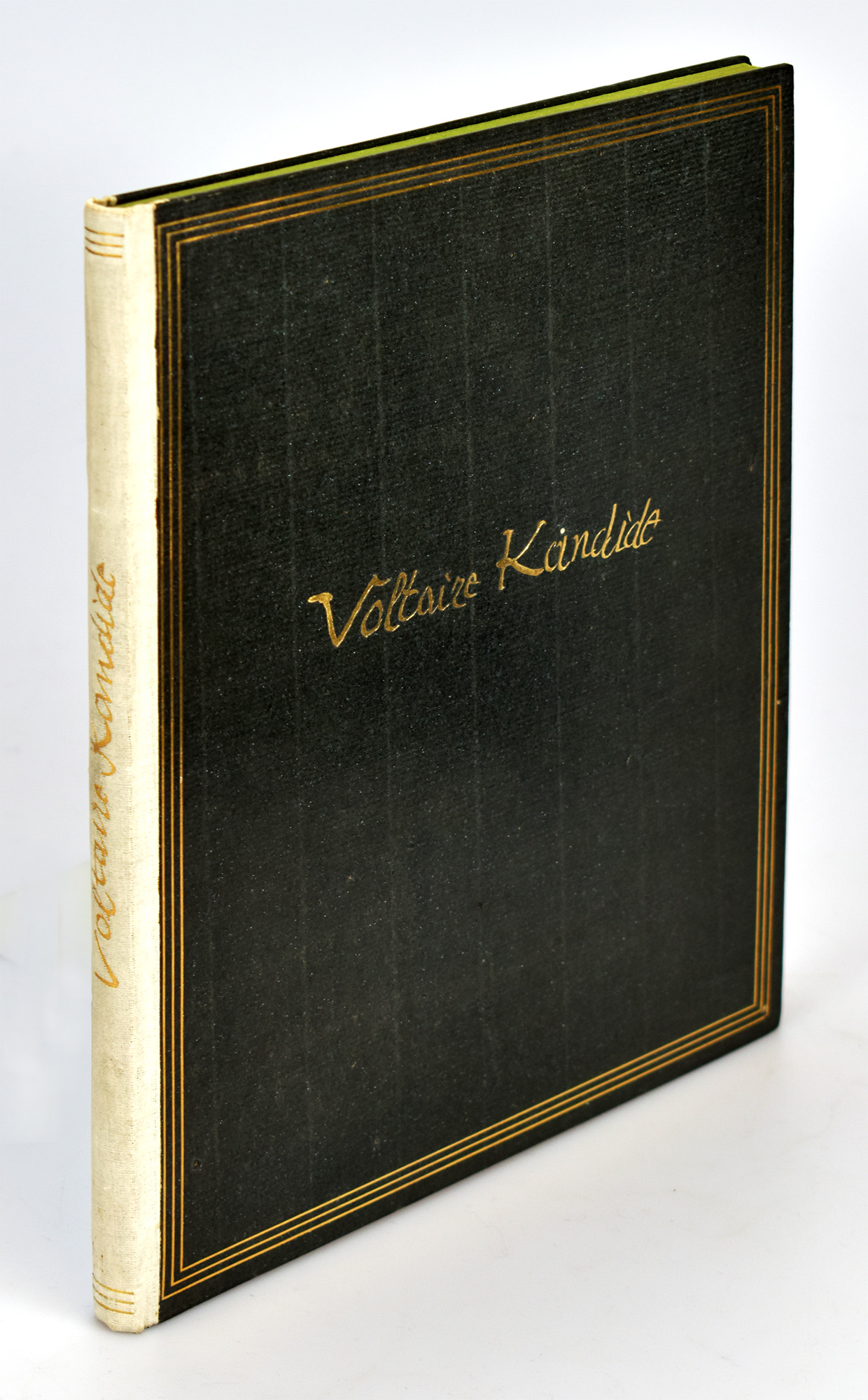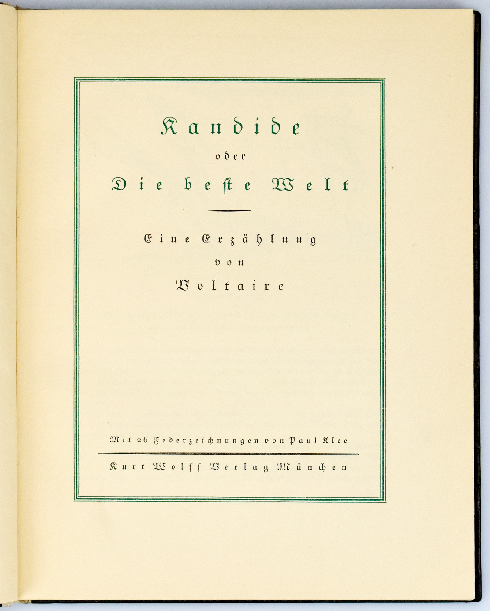 Voltaire: Kandide oder Die beste Welt. Eine Erzählung von Voltaire. Mit 26 Federzeichnungen von Paul Klee. [In handgefertigter Kassette]. München, Kurt Wolff Verlag, 1920. 4°. 27,5 x 21,5 x 3 cm. 89, [2] Seiten. Original-Halbleinen mit goldgeprägtem Deckel- und Rückentitel, goldgeprägten Deckelfileten und grünem Kopfschnitt. In handgefertigter, bibliophiler Halbleinenkassette mit intarsierter Messingplatte als Titelschild mit dem Namen des Künstlers Paul Klee in geschwungenem, erhabenem Schriftzug.