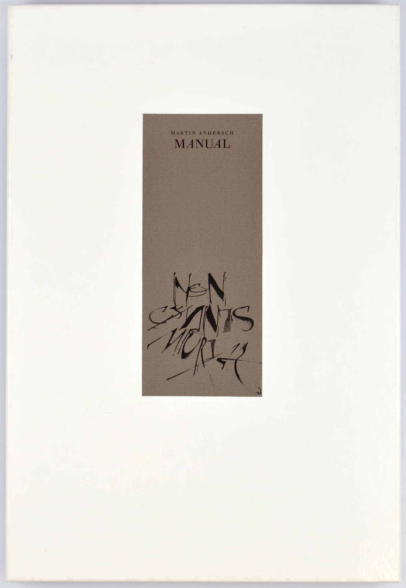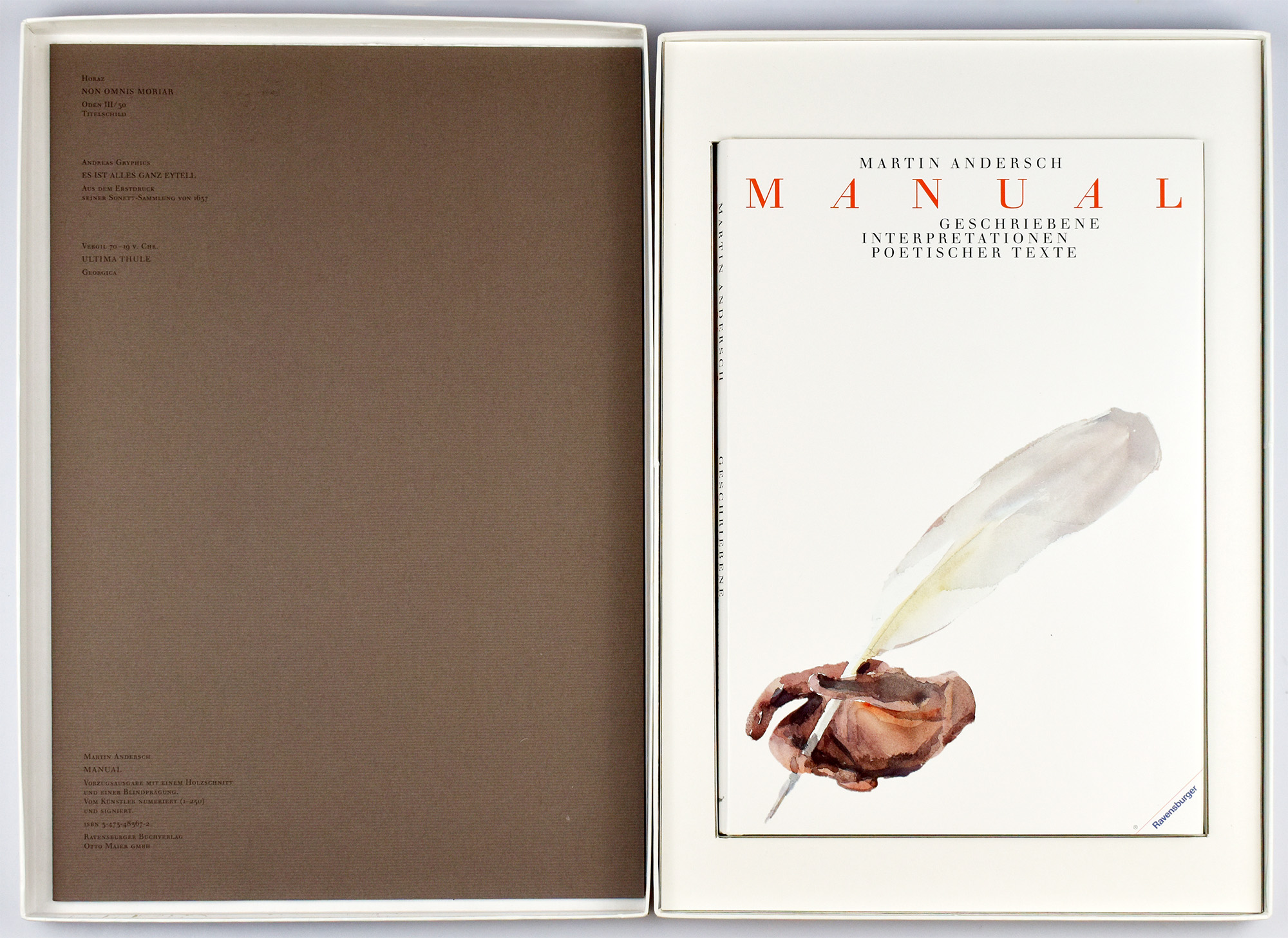 Andersch, Martin: Manual. Geschriebene Interpretationen poetischer Texte. [Vorzugsausgabe mit 2 Original-Grafiken]. Ravensburg, Verlag O. Maier, 1991. 2°. 40 x 27 cm. 168 Seiten. Original-Leinenband mit Original-Schutzsumschlag und beigelegte Suite in Original-Kassette.