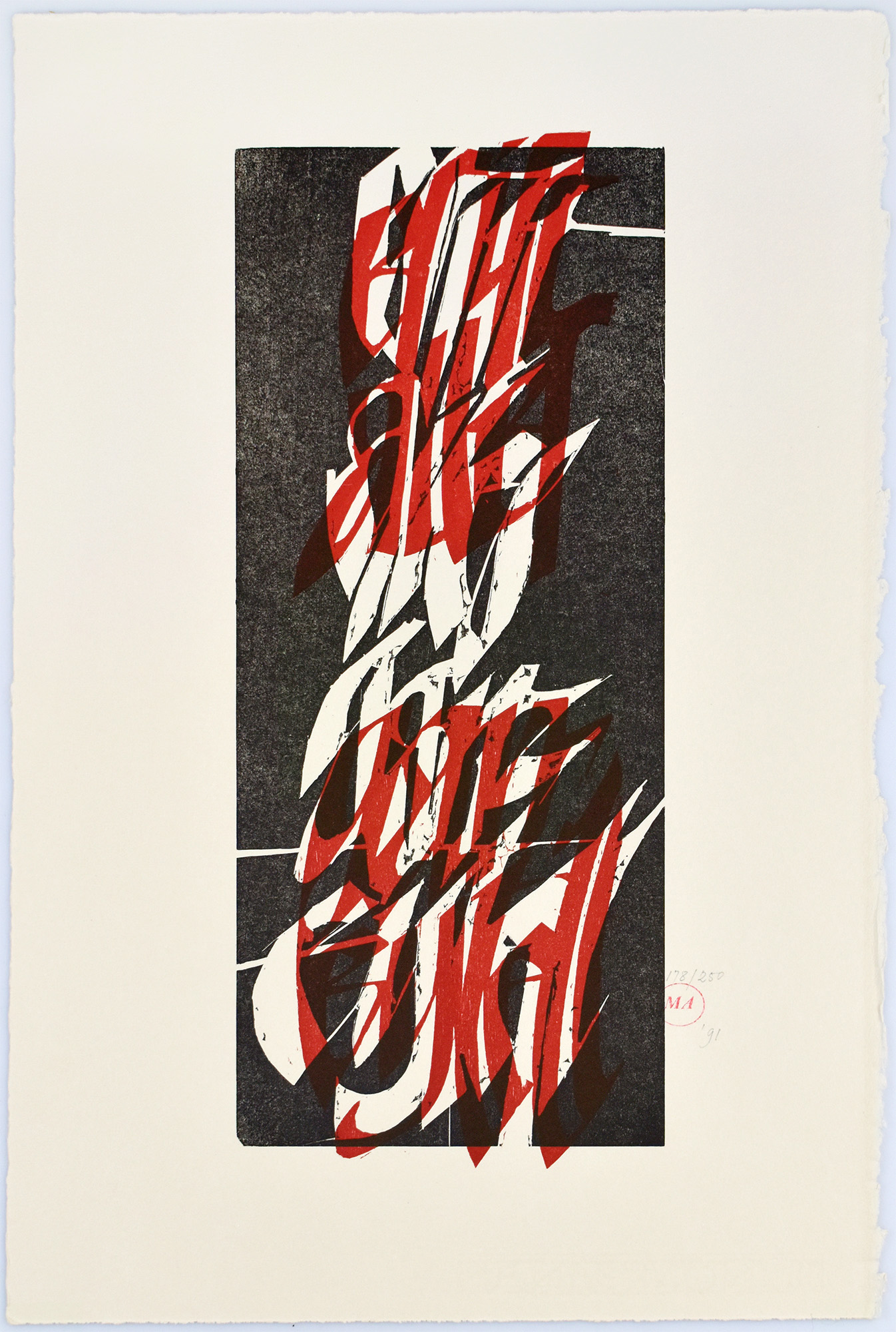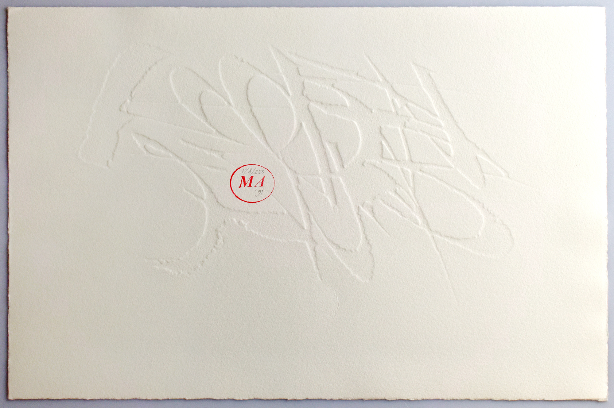 Nummer 178 von 250 Exemplaren der Vorzugsausgabe mit einem Original-Holzschnitt (Blattmaße 39 x 26 cm, Grafikmaße ca. 31 x 13 cm) und einer Original-Blindprägung (Blattmaße 39 x 26 cm, Grafik nahezu blattfüllend), jeweils in Blei vom Künstler signiert, nummeriert, gestempelt (MA) und datiert auf das Jahr 1991. Kassette leicht berieben, ansonsten sehr gutes Exemplar.