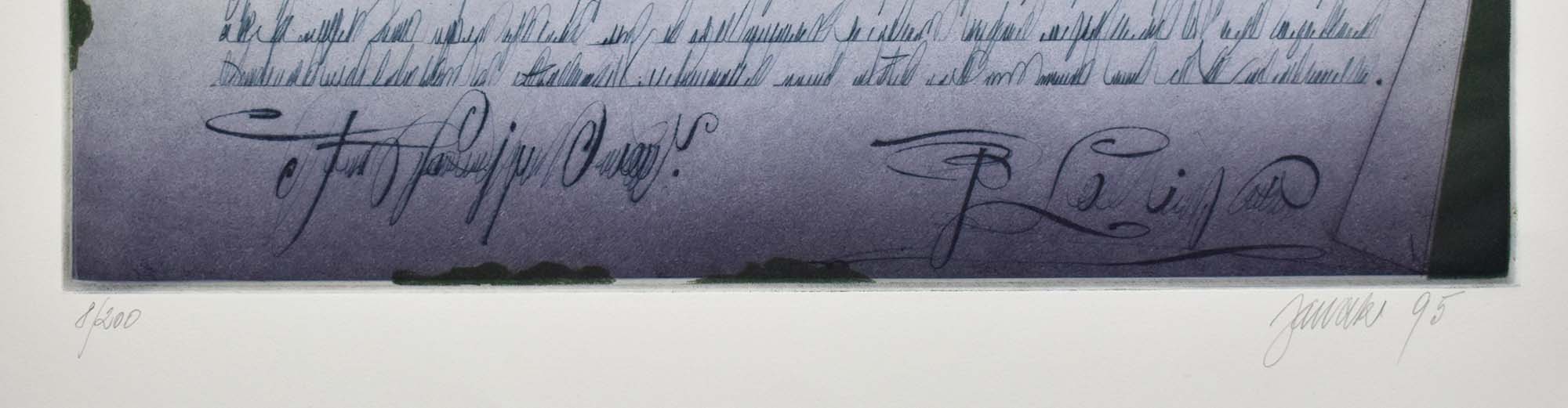 Number 8 of 200 original etchings by Alois Janak on laid paper, signed, dated (95), and numbered with pencil below the picture. Sheet size: 90.7 x 62.9 cm, lower left corner of the sheet with one embossed seal by Karin Janek. Dimensions printing plate: 72.3 x 49.0 cm. Fine condition.