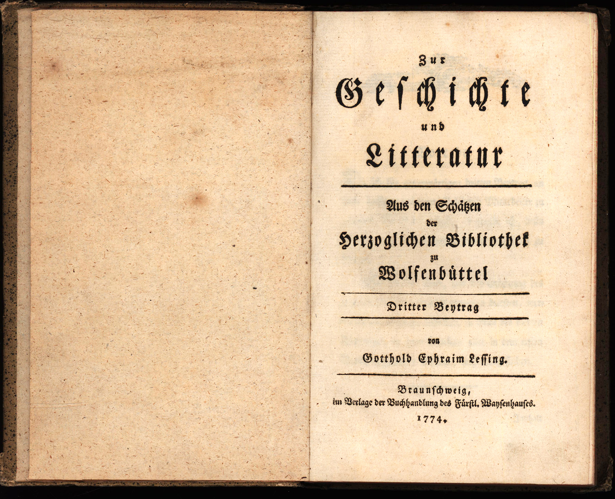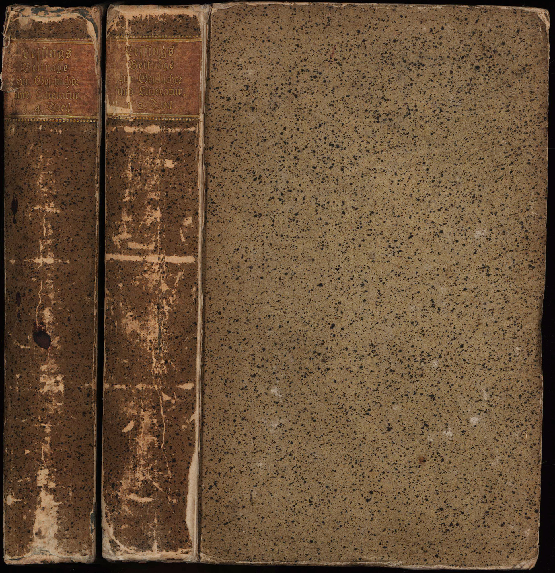 Lessing, Gotthold Ephraim: Zur Geschichte und Litteratur. Aus den Schätzen der Herzoglichen Bibliothek zu Wolfenbüttel. 4 Teile (von 6, in 2 Bänden). [Erste Ausgabe]. Braunschweig, Verlag der Buchhandlung des Waisenhauses, 1773-1777. Groß-8°. 21 x 13,5 cm. 9, [1], 515; 543 Seiten. 1 Falttafel. Marmorierte Pappbände der Zeit mit goldgeprägtem Rückentitel auf rotem Grund und rotem Sprenkelschnitt.