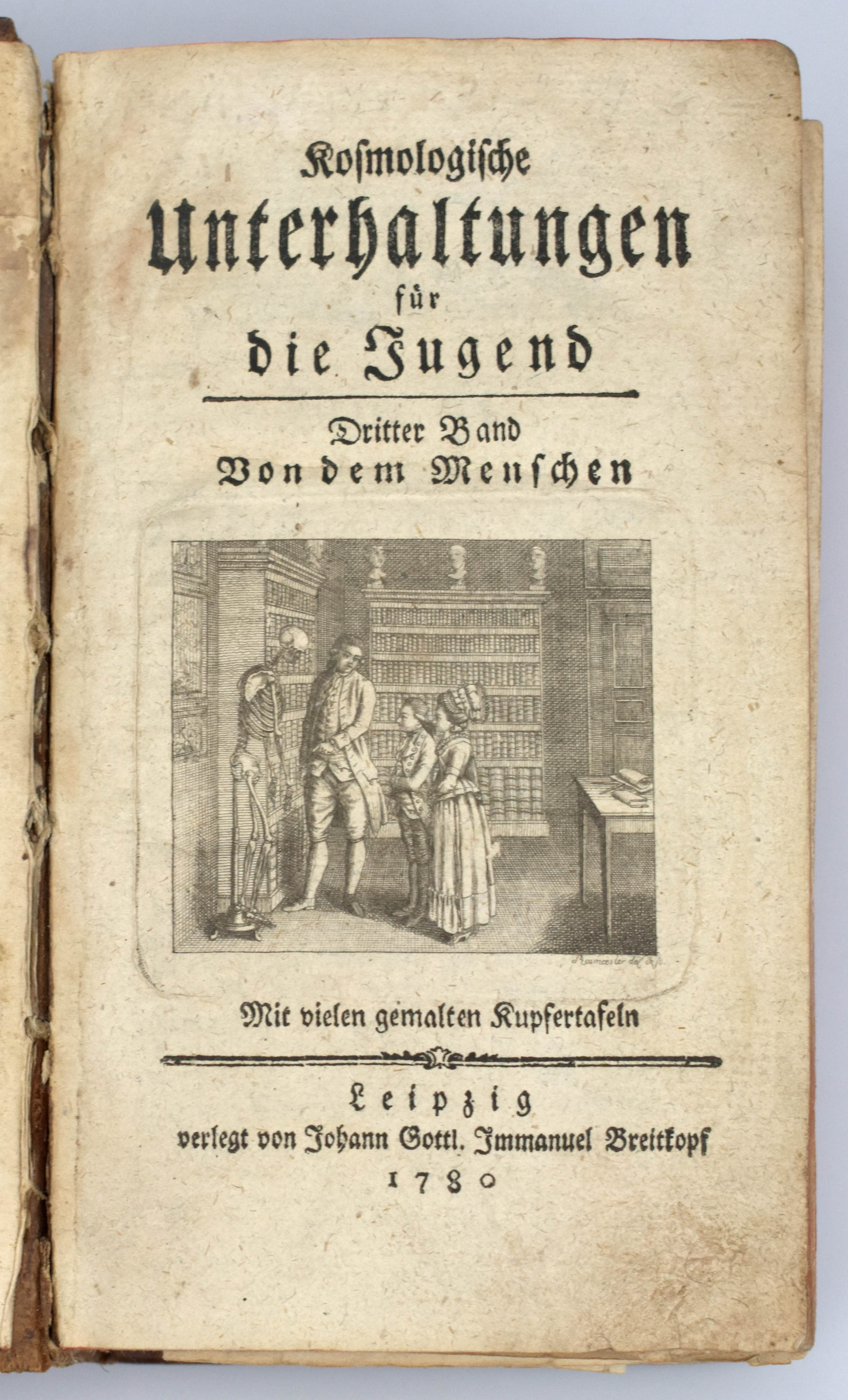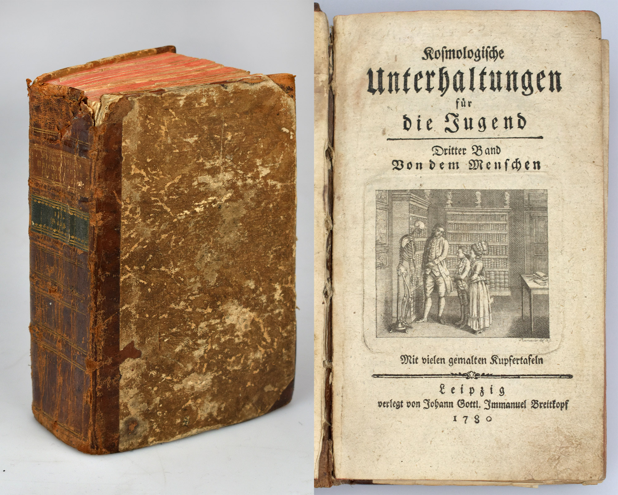Wünsch, Christian Ernst: Kosmologische Unterhaltungen für die Jugend. Dritter Band: Von dem Menschen. Band 3 (von 3). Leipzig, Verlag Johann Breitkopf, 1780. Klein-8°. 17,5 x 10 cm. [7] Blatt, 576 Seiten. 20 [von 22] Falttafeln. Halbledeband der Zeit mit goldgeprägten Rückenfileten, goldgeprägten Rückentiteln auf Lederschildchen, marmoriertem Deckelbezug und Rundum-Rotschnitt.