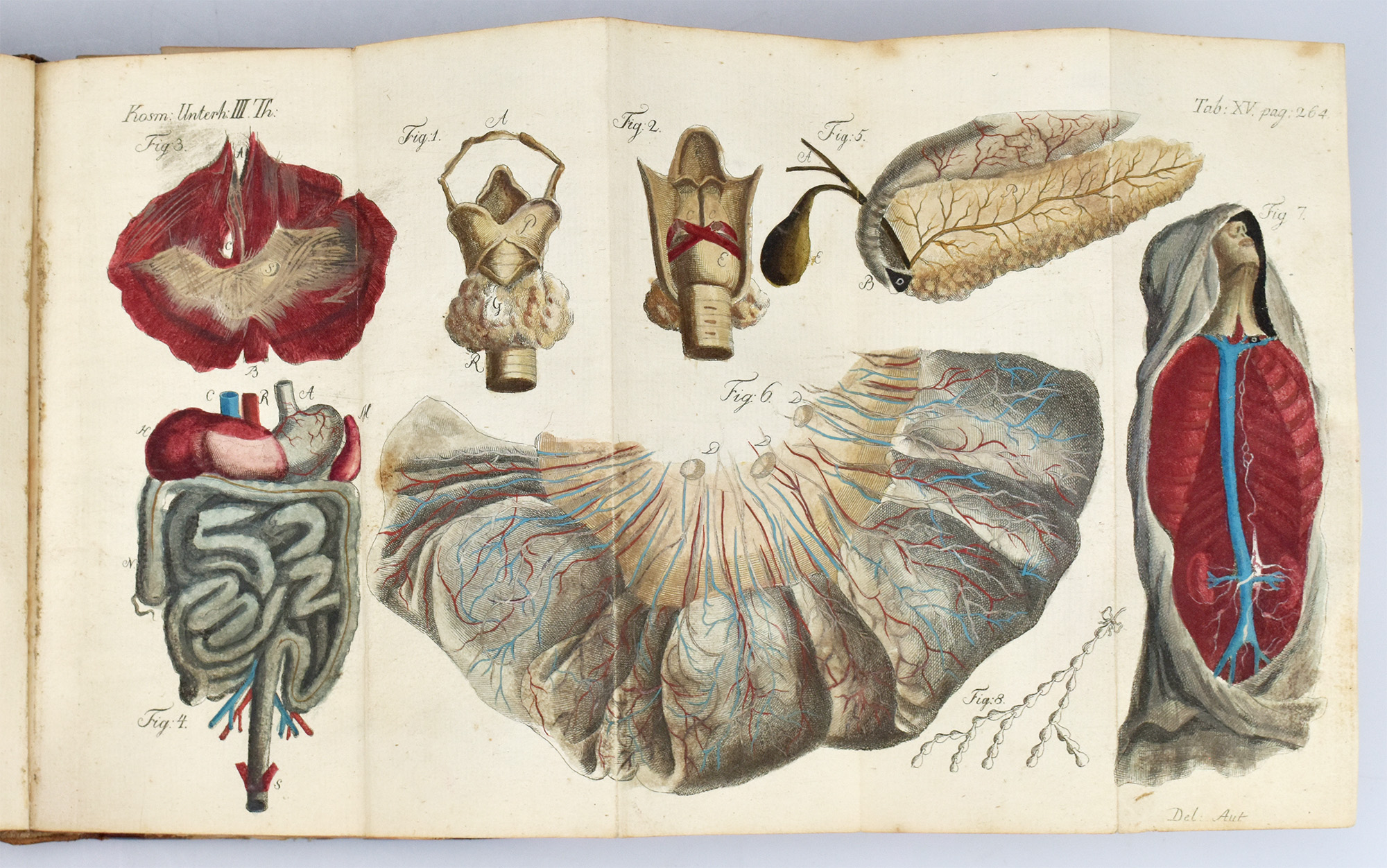 Half leather binding of the time with gilt-tooled spine fillets, gilt spine titles on leather labels, marbled paper-covered boards, and red edges all around. First edition. Reche II, 434. With an engraved title vignette and 20 (of 22) folding copperplate engravings, occasionally coloured or partially coloured. Binding heavily rubbed with a loss and tear to the leather on the spine. Pages and plates lightly darkened, in places with creases, faint foxing, or marginal waterstaining. Several folding plates with tears at the folds (up to 4 cm), plates depicting skulls, European populations, extraordinary individuals, and the circulatory system each with larger tears (6 to 10 cm), the anatomical plate of the skeleton with a cut-out section (approx. 7 × 5.5 cm), the plate depicting American populations with a large loss (figures 1–3 missing), two folding plates loosely inserted. Overall a good copy.