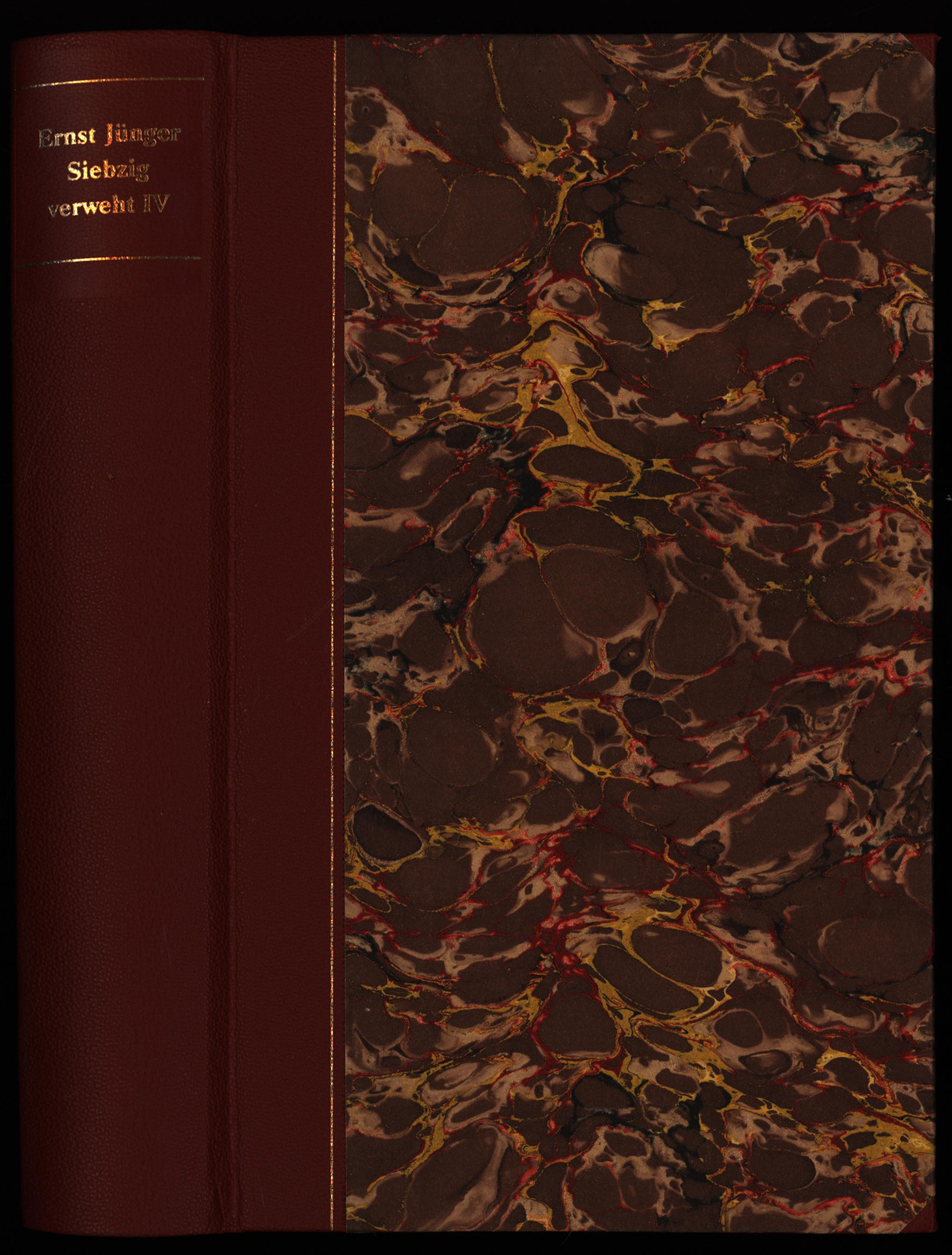 Jünger, Ernst: Siebzig verweht IV. Band 4 (von 5). [Signierte Ausgabe]. Stuttgart, Klett-Cotta Verlag, 1995. 8°. 22 x 14 cm. 487 Seiten. Original-Halblederband mit marmoriertem Deckelbezug, goldgeprägtem Rückentitel, goldgeprägten Deckelfileten und gelbem Kopfschnitt.