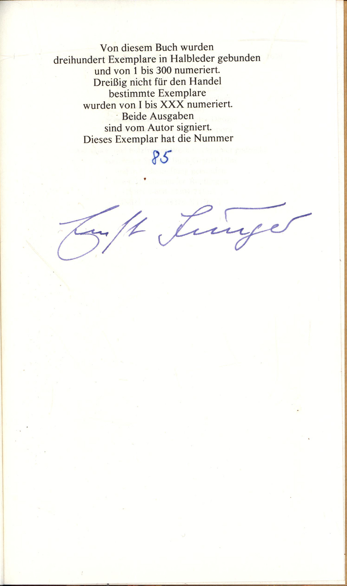 Nummer 85 von 300 von Ernst Jünger in Tinte im Kolophon signierten Exemplaren der Vorzugsausgabe in Halbleder (Gesamtauflage der Vorzugsausgabe: 330 Exemplare). Besitzvermerk in Tinte auf fliegendem Blatt. Sehr gutes Exemplar.