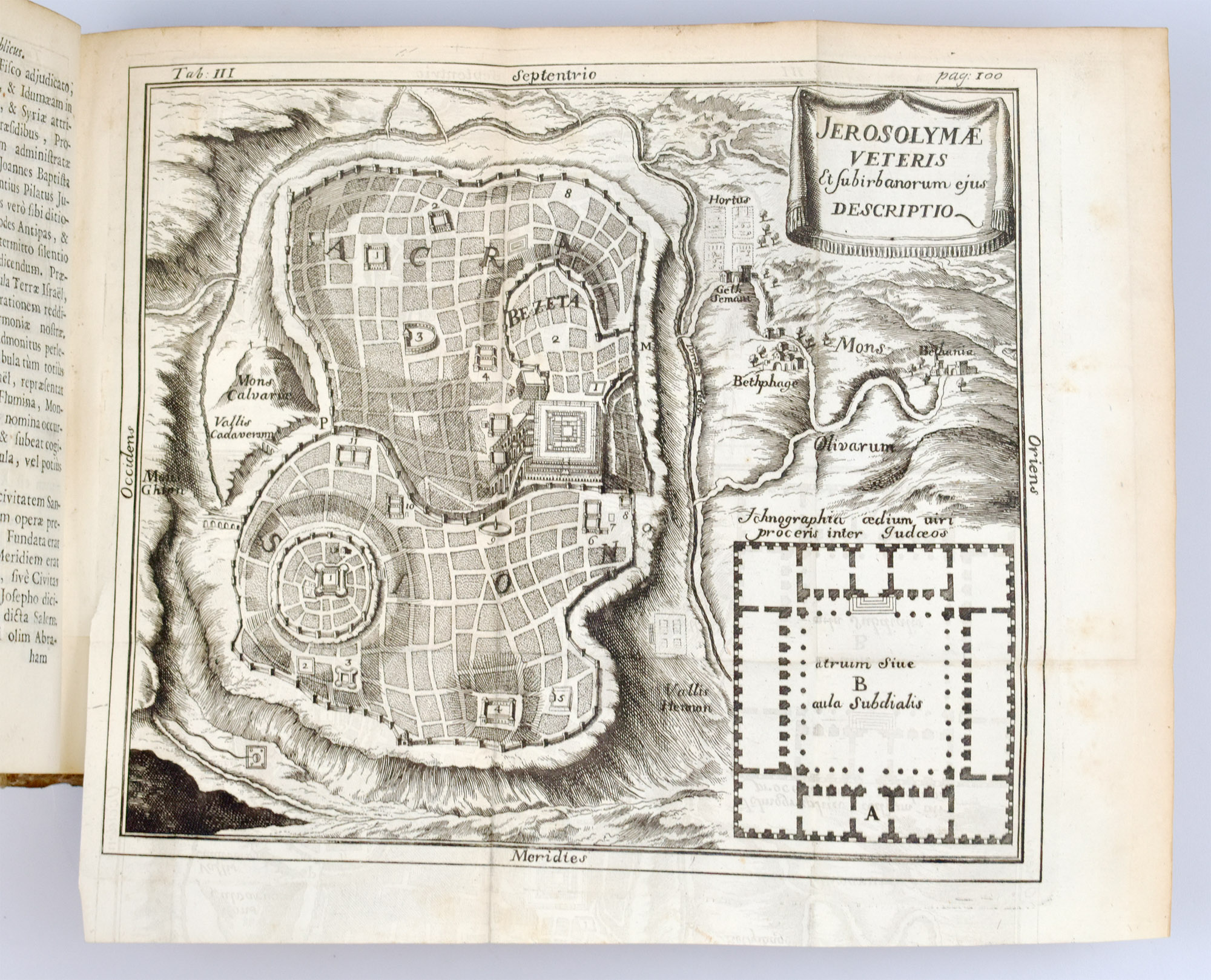Spätere Ausgabe. Ausgabe in Latein. vgl. Graesse IV, 91. vgl. Wetzer/Welte VII, 1373. Mit gestochener Titelvignette, 7 gefalteten Kupfertafeln und 4 Faltkarten in Kupferstich. Die erste Ausgabe erschien 1687. Einband leicht berieben und leicht fleckig. Vorderer Vorsatz mit blassem Stempel von St. Etheldreda in London und altem Besitzvermerk in Tinte. Seiten und Tafeln minimal bis leicht stock- bzw fingerfleckig. Gutes bis sehr gutes Exemplar.