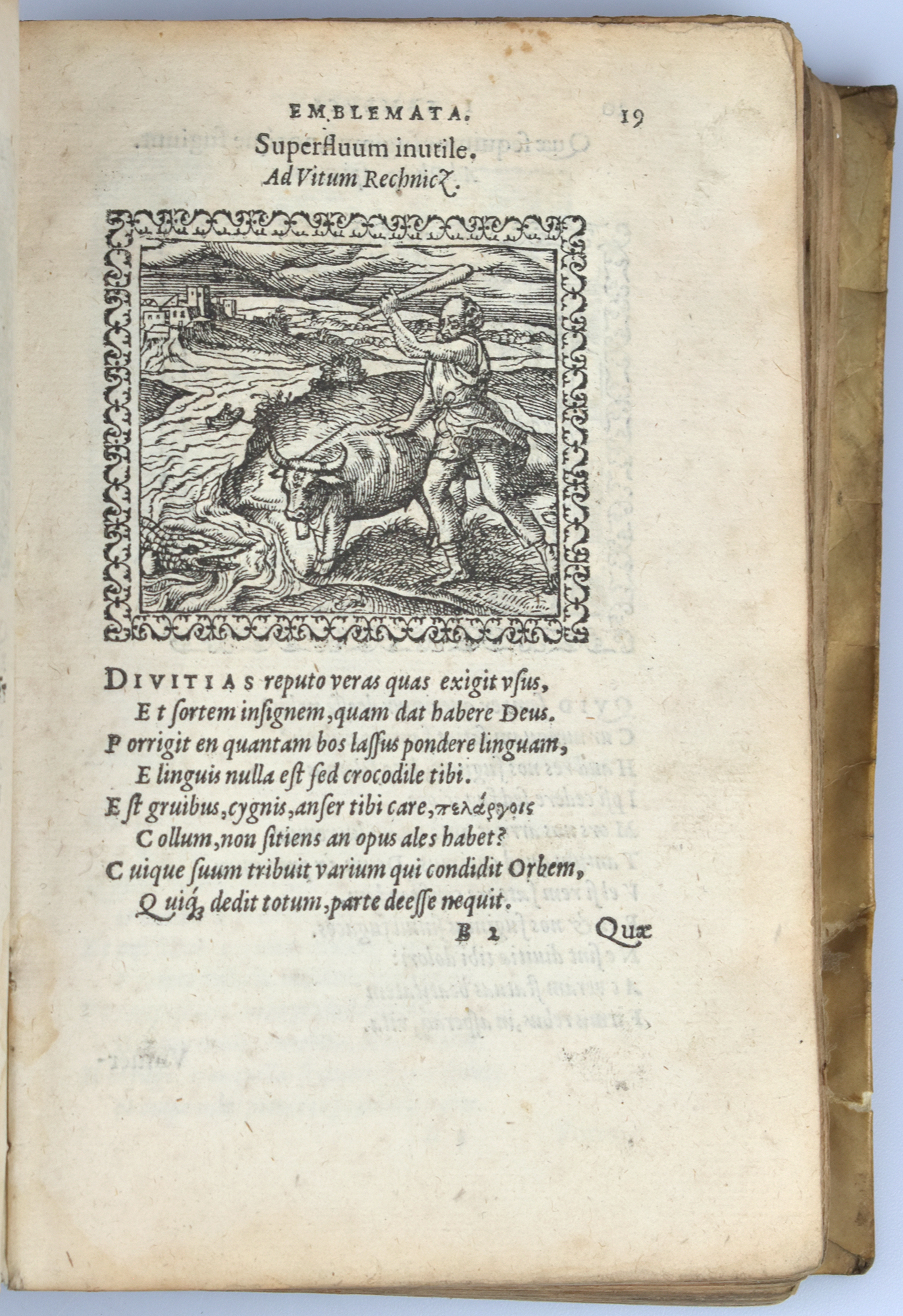 Sambucus, Johannes: Emblemata. Et Aliquot Nummi Antiqui Operis. Altera Editio. Cum emendatione et auctario copioso ipsius auctoris. Antverpiae [Antwerpen], ex officina Chr. Plantini [Christoffel Plantijn], 1566. 8°. 17 x 12,5 cm. 280 [von 288 (fälschlich bis 272 paginierten)] Seiten. Pergament-Umschlag der Zeit mit Pergamentmakulatur.