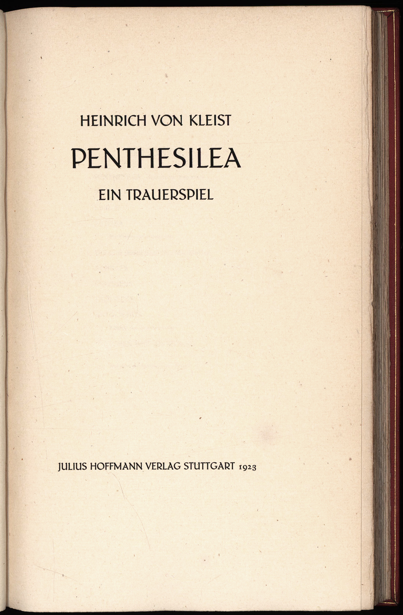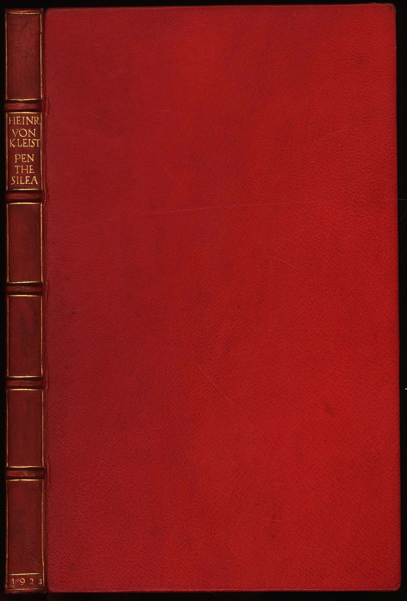 Kleist, Heinrich von: Penthesilea. Ein Trauerspiel. [Vorzugsausgabe in rotem Saffianleder]. Stuttgart, Julius Hoffmann Verlag, 1923. 4°. 25 x 15,5 cm. 146 Seiten. Handeinband in rotem Saffianleder auf fünf echten Bünden mit goldgeprägtem Rückentitel, goldgeprägten Deckel-, Kanten- und Innendeckelfileten und Kopfgoldschnitt. (= 6. Druck der Juniperuspresse).