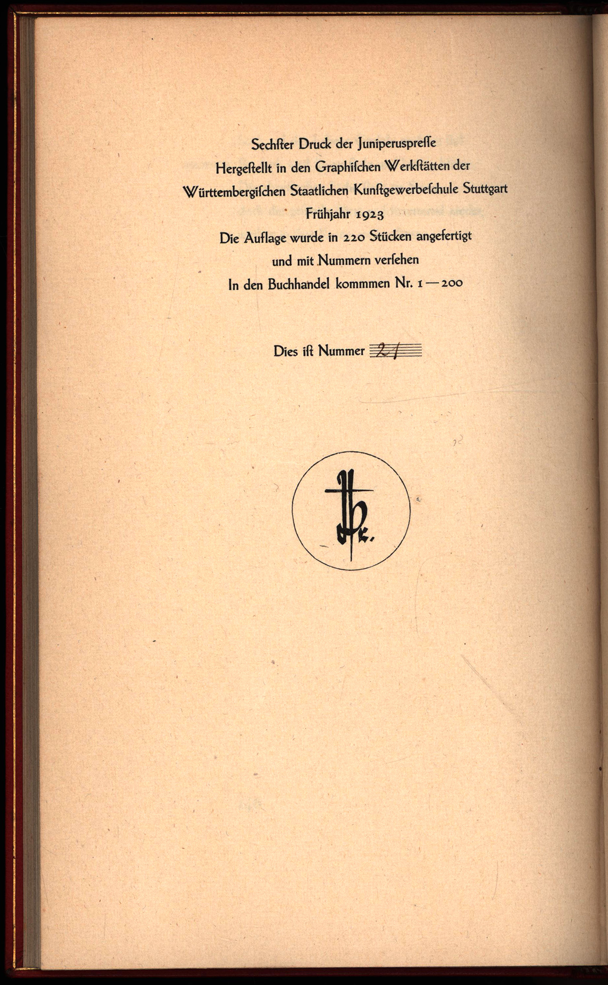 Vorzugsausgabe (Ausgabe A). Nummer 21 von 220 handnummerierten Exemplaren. Rodenberg 98, 6. Gedruckt in Garmond Schneidler-Latein auf handgeschöpftem Bütten von J.W. Zanders. Einband etwas fleckig. Vorsätze etwas leimschattig. Seiten nur leicht gebräunt. Gutes bis sehr gutes Exemplar.
