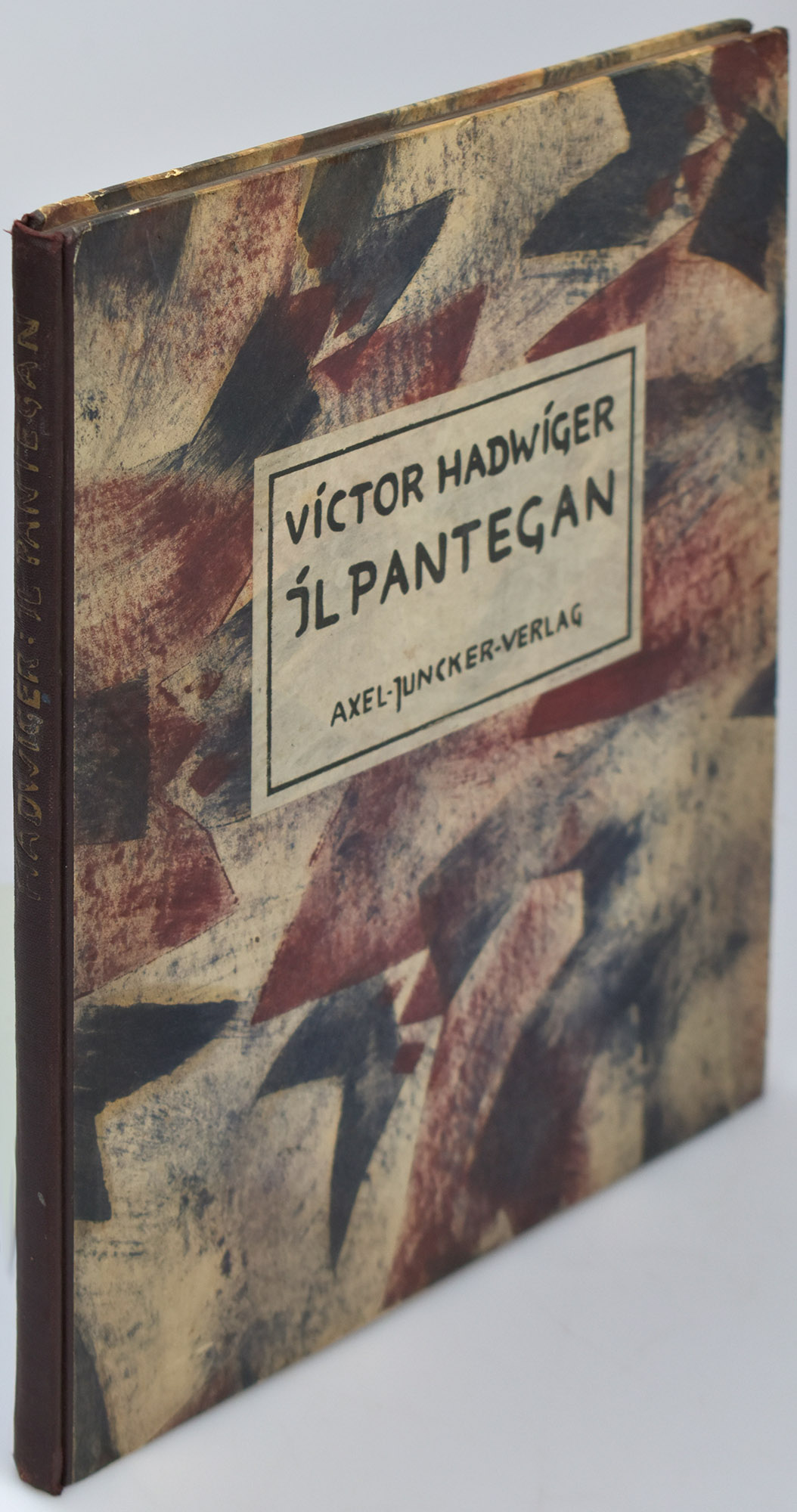 Hadwiger, Viktor: Il Pantegan. Mit 6 Kupferdrucken nach Zeichnungen von Walter Gramatté. [Signierte Ausgabe]. Berlin, Verlag Axel Juncker, 1919. 4°. 28,5 x 25,5 cm. 75 Seiten. Original-Halbleinenband mit goldgeprägtem Rückentitel, Deckelbezug aus lithografiertem Buntpapier, schwarzem Kopfschnitt und rauem Außenschnitt.